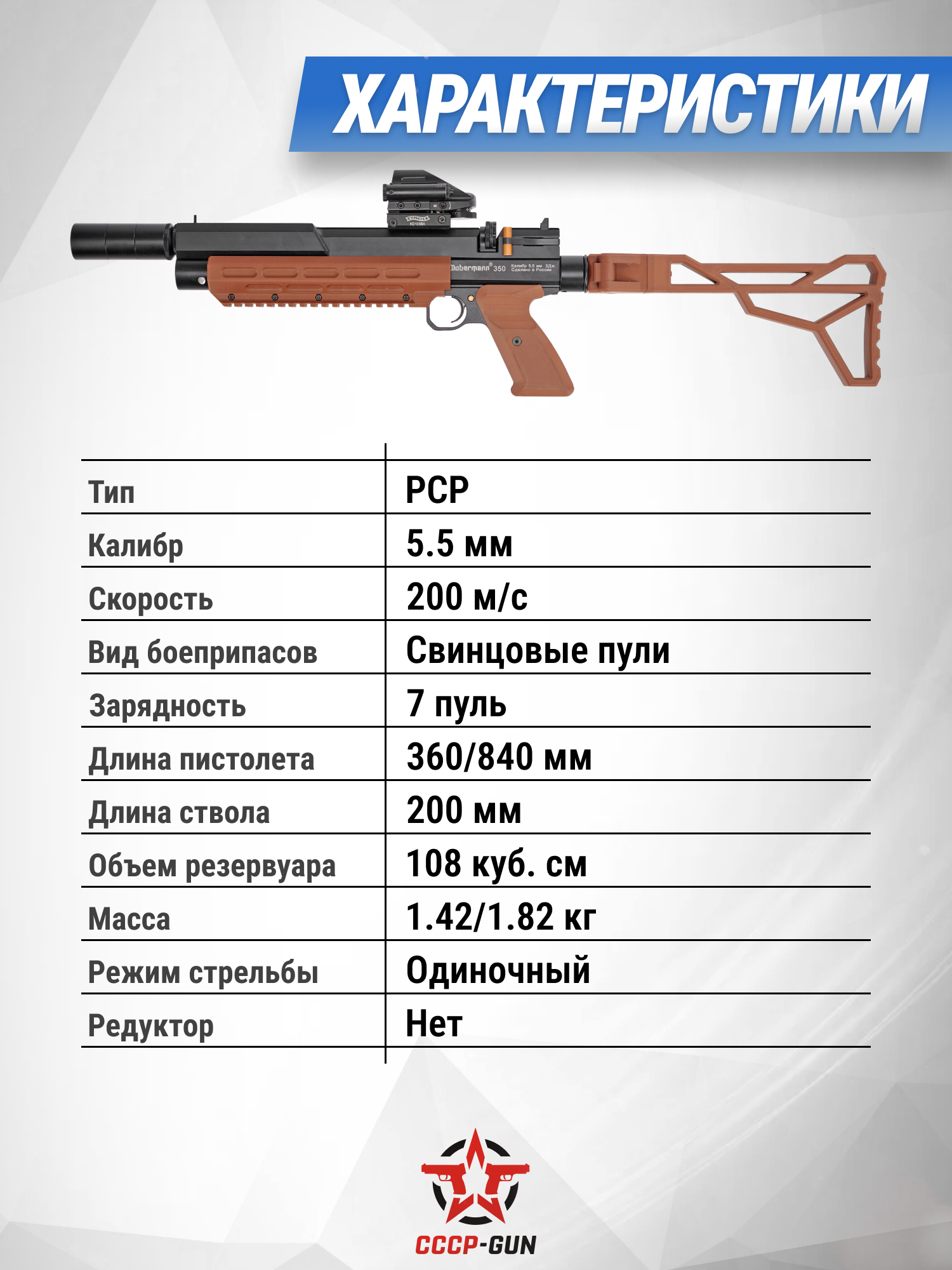 В рассматриваемую комплектацию входит пневматический пистолет Доберман 350 Эксцентрик класса PCP - он выступает ключевым элементом набора. Дополнительно присутствует плечевой упор, а также тактическое цевье, предусматривающее крепежную платформу Weaver для размещения фонарей, лазерных целеуказателей или рукояток. Помимо того, включены эргономичные накладки на пистолетную рукоять, повышающие удобство удержания оружия.