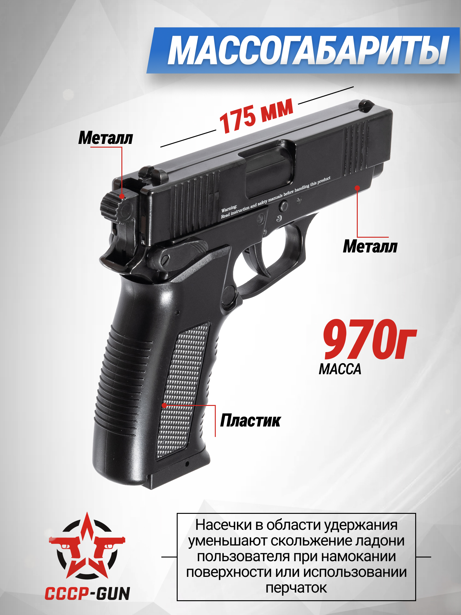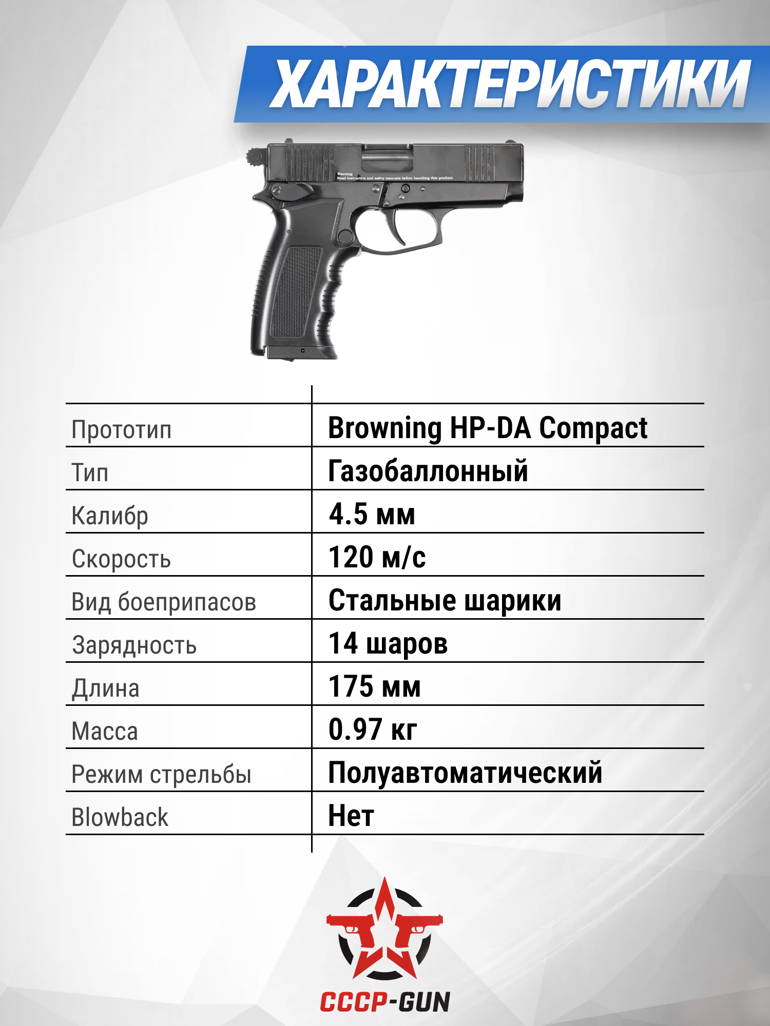 Для функционирования пистолета понадобятся 12-граммовые CO2 баллоны, потому как пневматика работает в полуавтоматическом режиме на энергии получаемой при вскипании углекислоты. Указанная емкость с расширяющимся газом вставляется в магазин, а для ее фиксации используется поджимной винт. Производитель позаботился о безопасности стрелка и спроектировал на рамке изделия двусторонний предохранитель флажкового типа, который помимо этого выполняет роль декокера, повторяя конструкцию огнестрельных пистолетов.