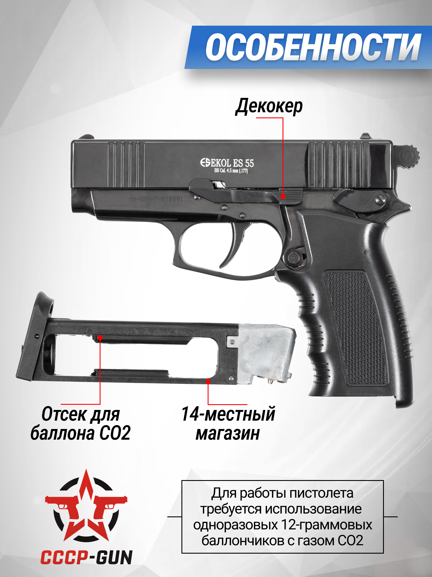 Емкость магазина Ekol ES 55 Black рассчитана на объем до 14 единиц боеприпасов, ускоренную зарядку которых помогает производить фиксатор пружины и специальное окошко для удобной вставки пуль. Стрельба осуществляется стальными шариками под стандарт Bullet Balls с калибром 4.5 миллиметра, который считается одним из самых распространенных видов снарядов для пневматического оружия. Компания Экол рекомендует работать с пистолетом в защитных очках для исключения травм органов зрения при случайном рикошете.