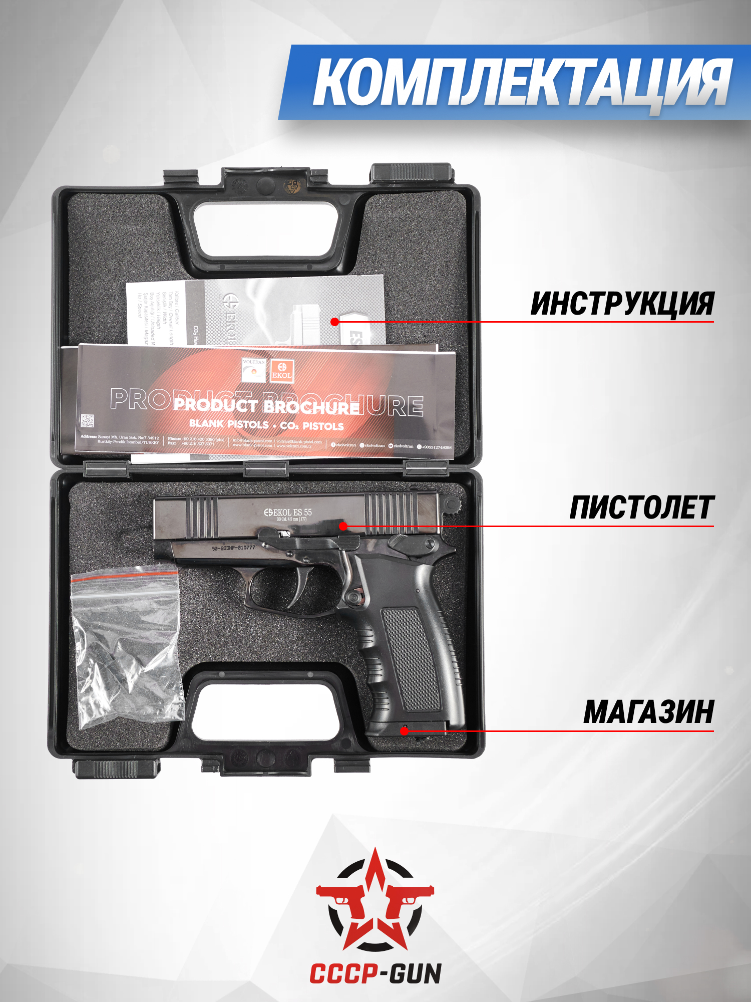 Ekol ES 55 Black комфортно держать в руках, благодаря эргономичной накладке на рукояти, при этом габариты изделия составляют 172x140x40 миллиметров, а масса равна 970 грамм. Обозреваемое устройство оборудовано литыми прицельными приспособлениями механического типа. Целик и мушка подобного открытого вида отличаются надежностью и простотой в использовании, что подойдет не только опытным стрелкам, но и начинающим пользователям.