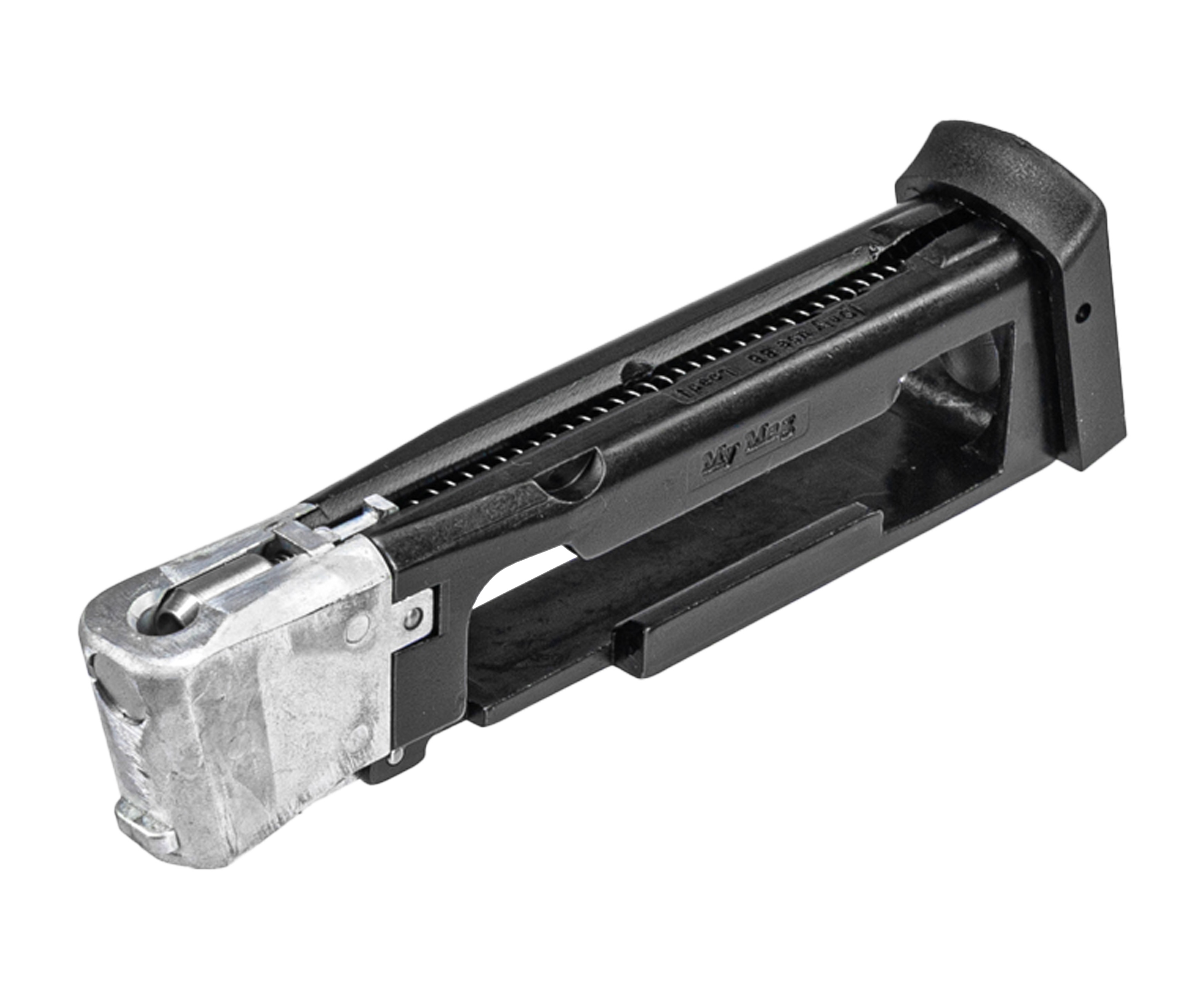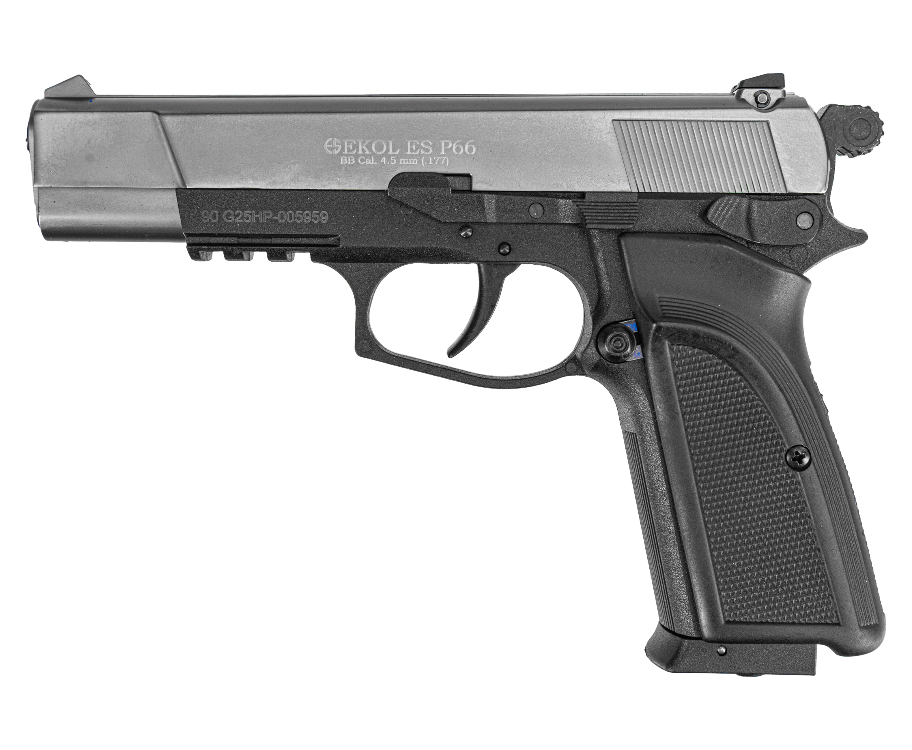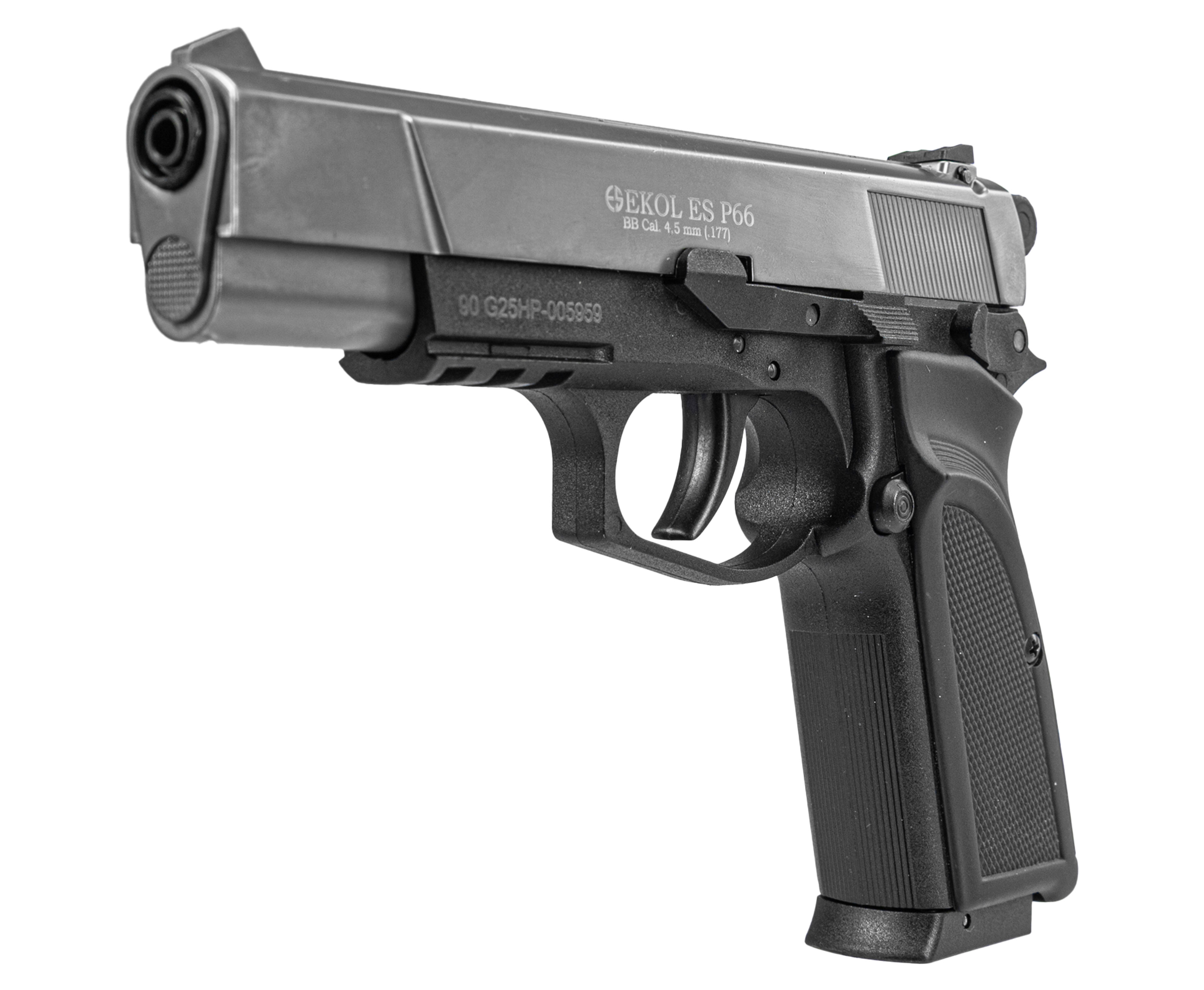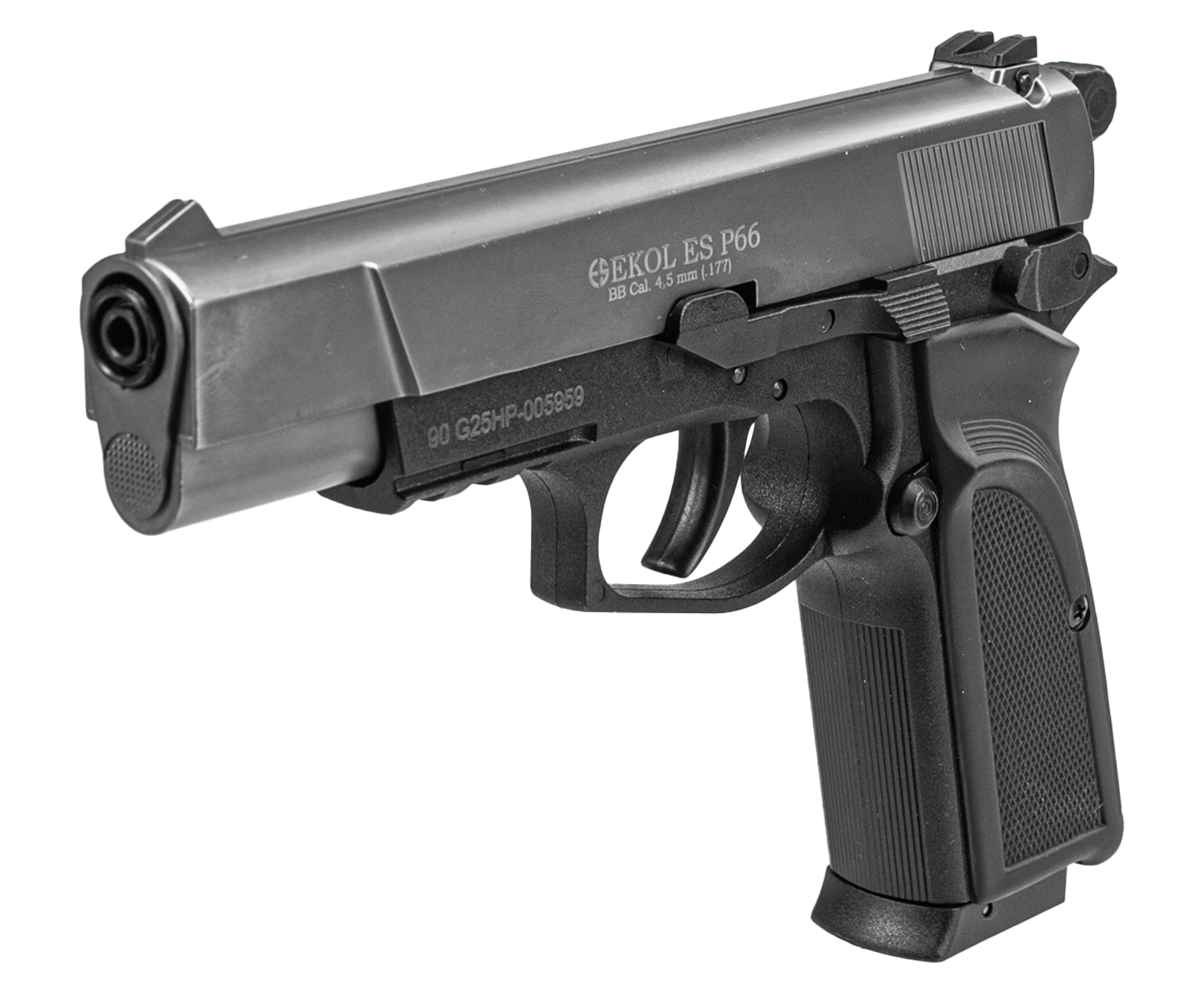 Боеприпасами в Эколь ЕС П66 Ф выступают шариковые снаряды из стали под формат BB с калибром 4.5 миллиметра. Для удобства зарядки в штатный магазин на 14 пуль, производитель добавил специальное окошко и паз для придерживания пружины. Чтобы сделать пневматику безопасной, инженеры спроектировали двусторонний предохранитель, как на боевом образце, выполняющий функцию декокера для сброса курка без выстрела.