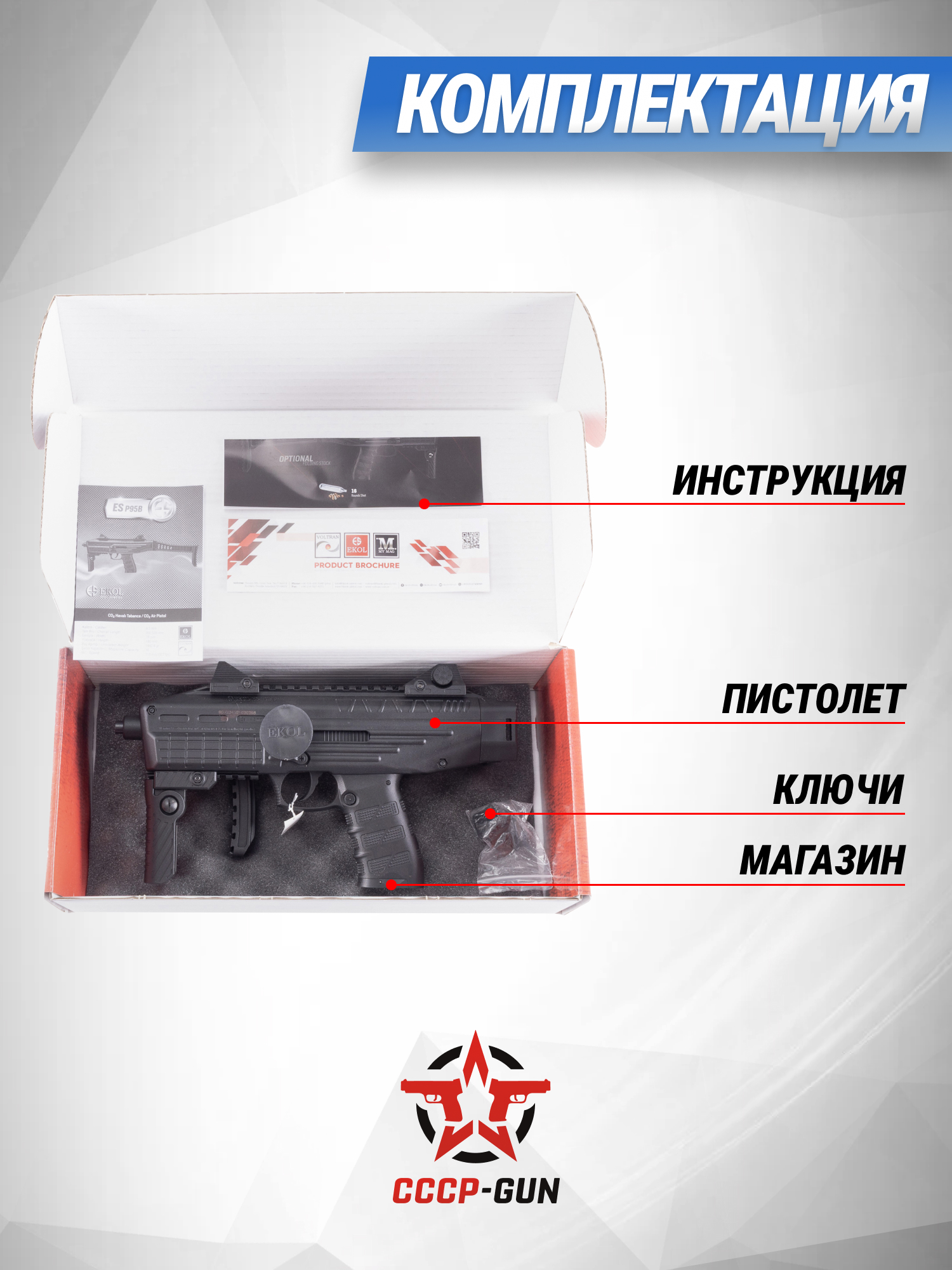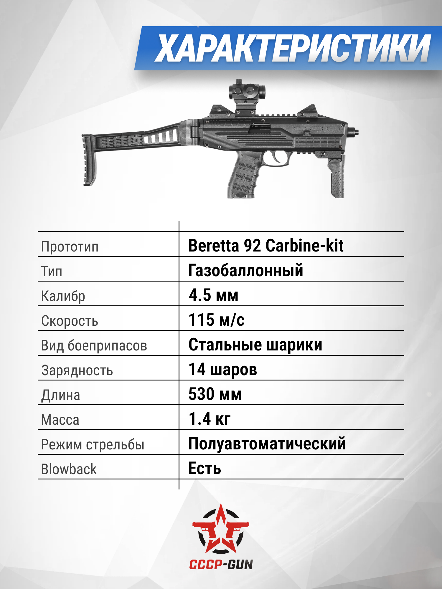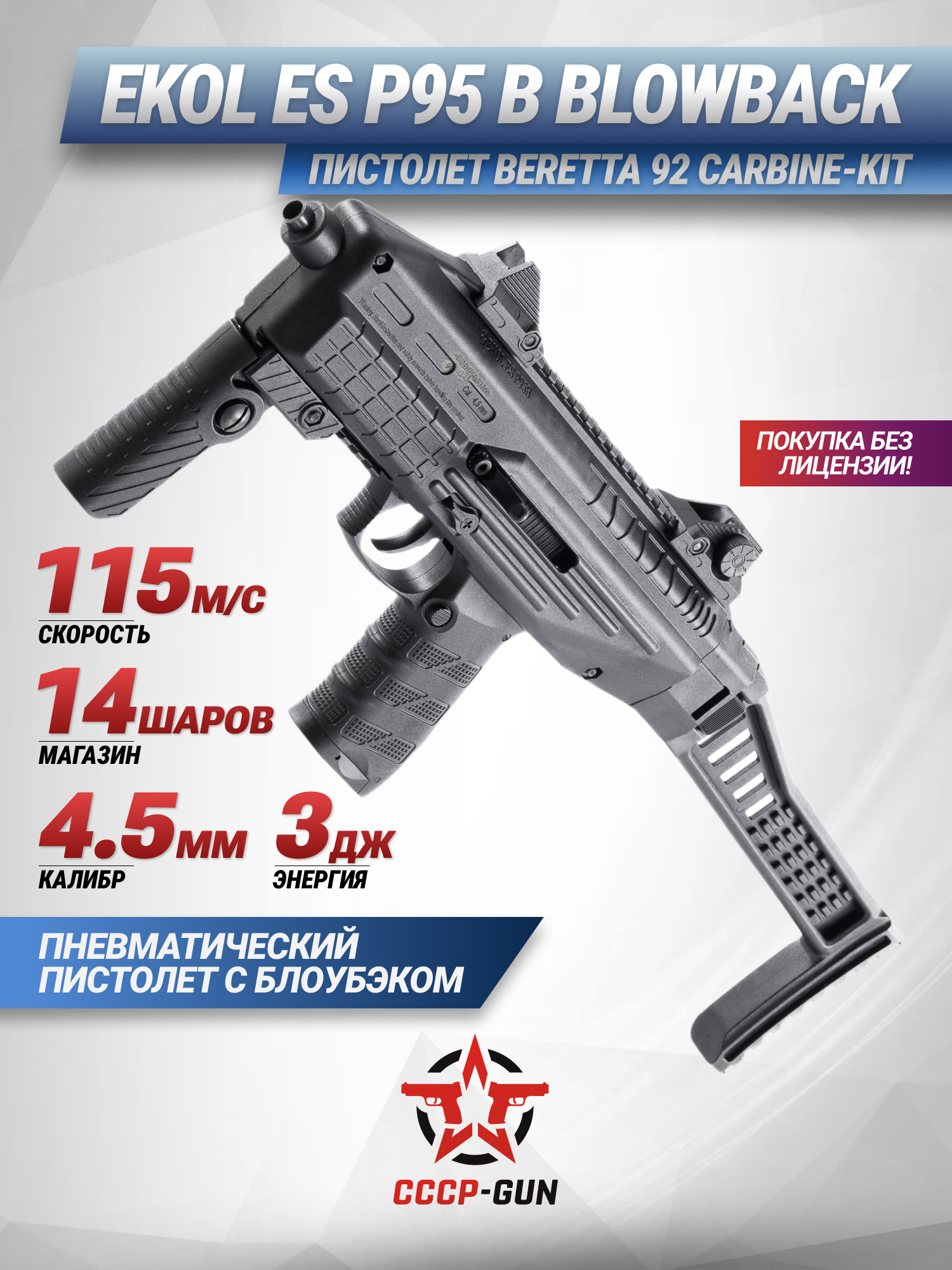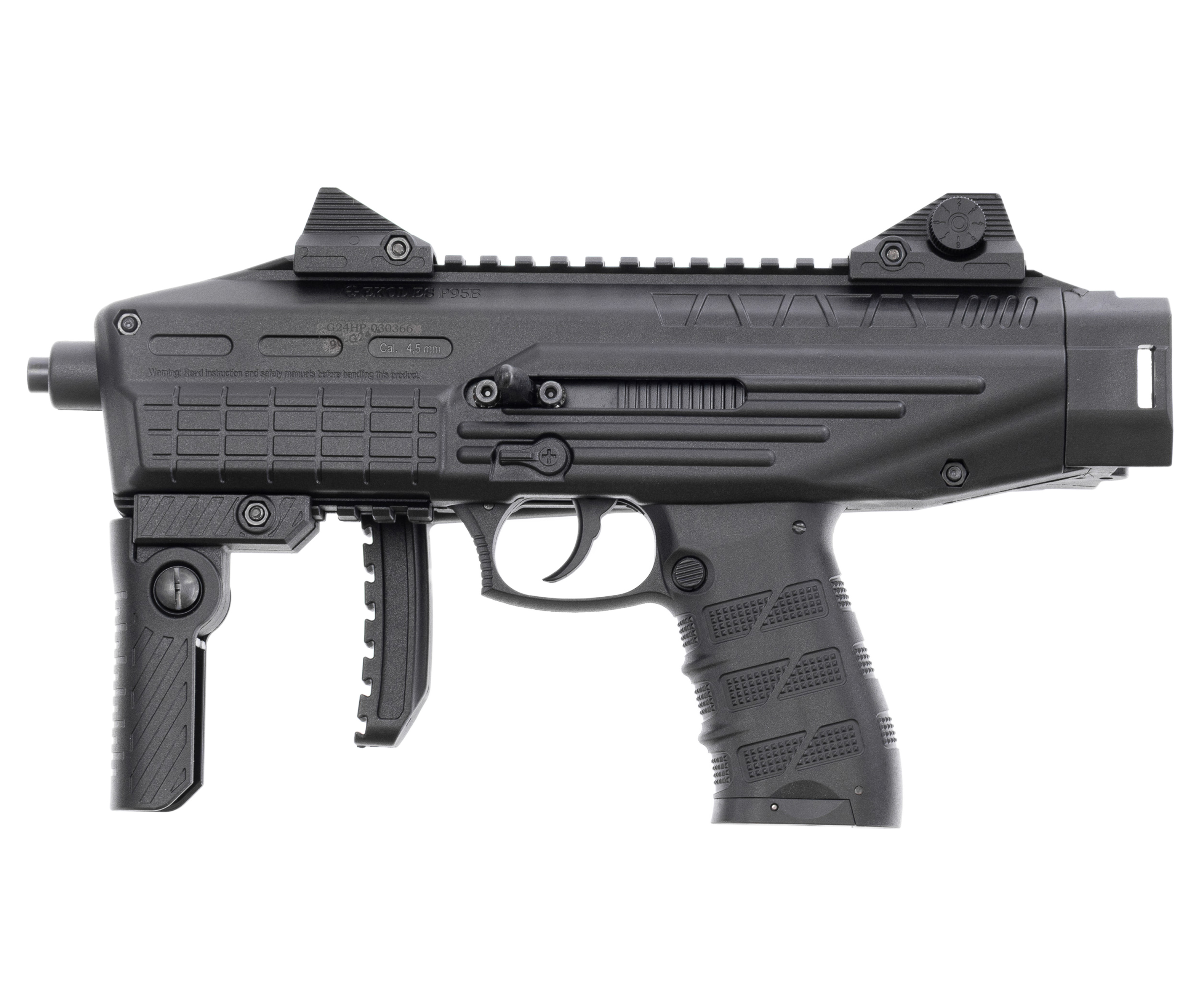 Ekol ES P95 B разработан по образу современной модификации Carbine-kit боевого пистолета Beretta 92, поэтому рассматриваемая пневматическая модель обладает улучшенной эргономикой и расширенным функционалом. Так как затворная рама представленного экземпляра изготовлена из сплава, а остальные элементы корпуса из полимера, конструкторам удалось снизить массу до 1.4 кг. Длина оружия приравнивается к 530 миллиметрам, но поскольку устройство оснащено складным прикладом габариты уменьшаются до 32.5 сантиметров, что благоприятно сказывается на мобильности.