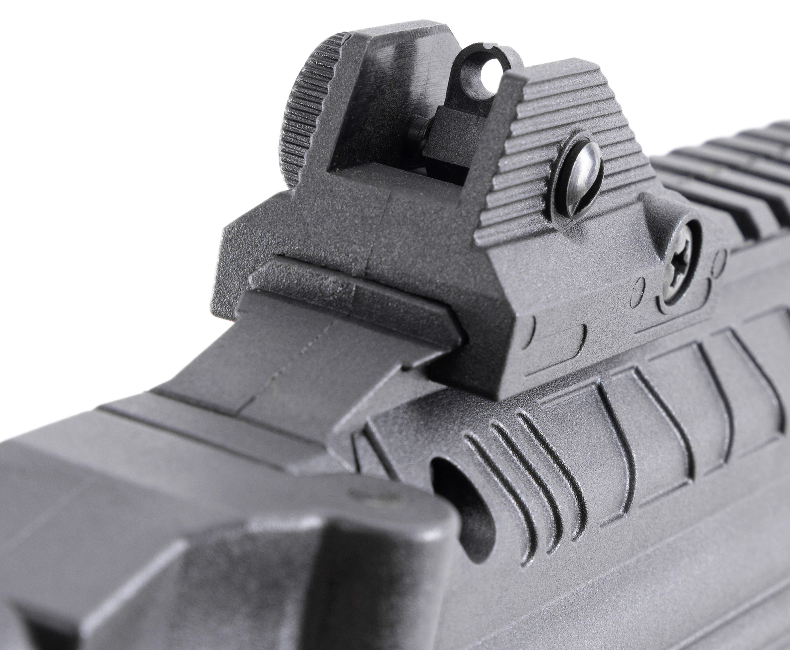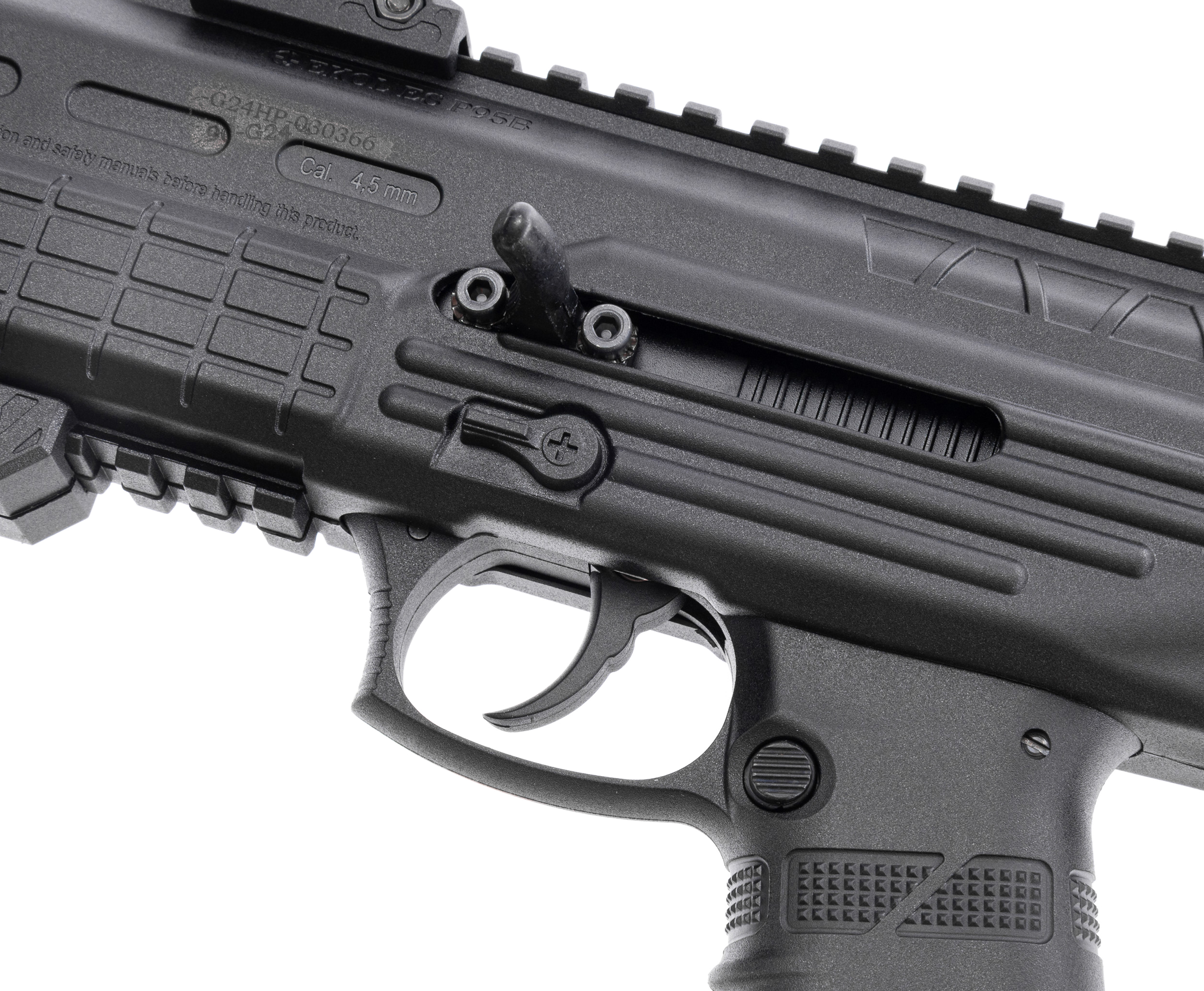 Главным элементом Экол ЕС П95 Б является корпус, который делает из пневматического пистолета тактический карабин. На цевье предусмотрен комплектный складной упор, а тыльник приклада и рукоять имеют противоскользящие насечки, что в комплексе повышает комфорт стрелка. Более того, спроектированные планки Weaver помогают устанавливать на изделие коллиматорные прицелы, ЛЦУ и фонари. Тем не менее с завода модель оборудована съемными регулируемыми механическими прицельными приспособлениями в виде целика и мушки.