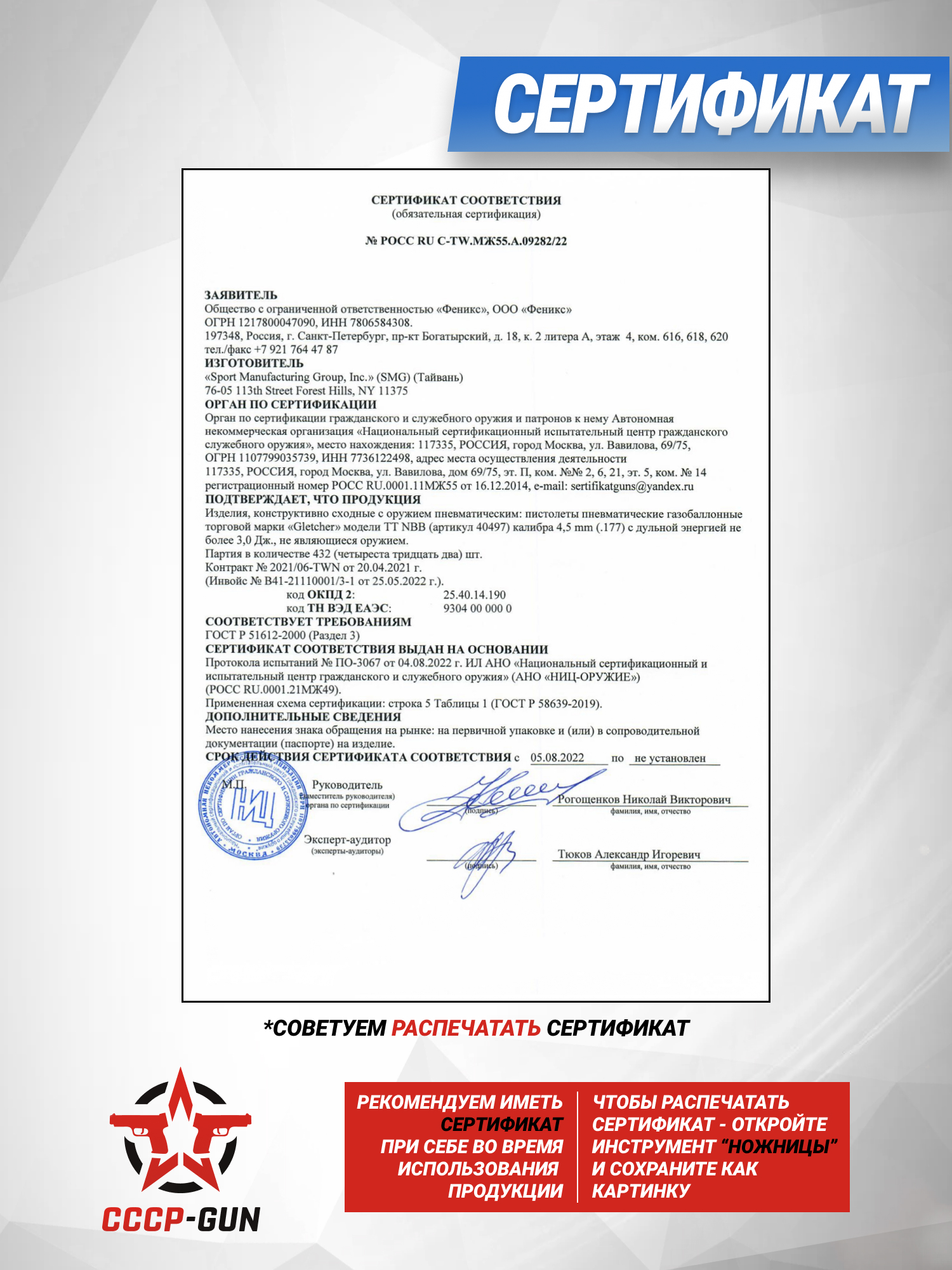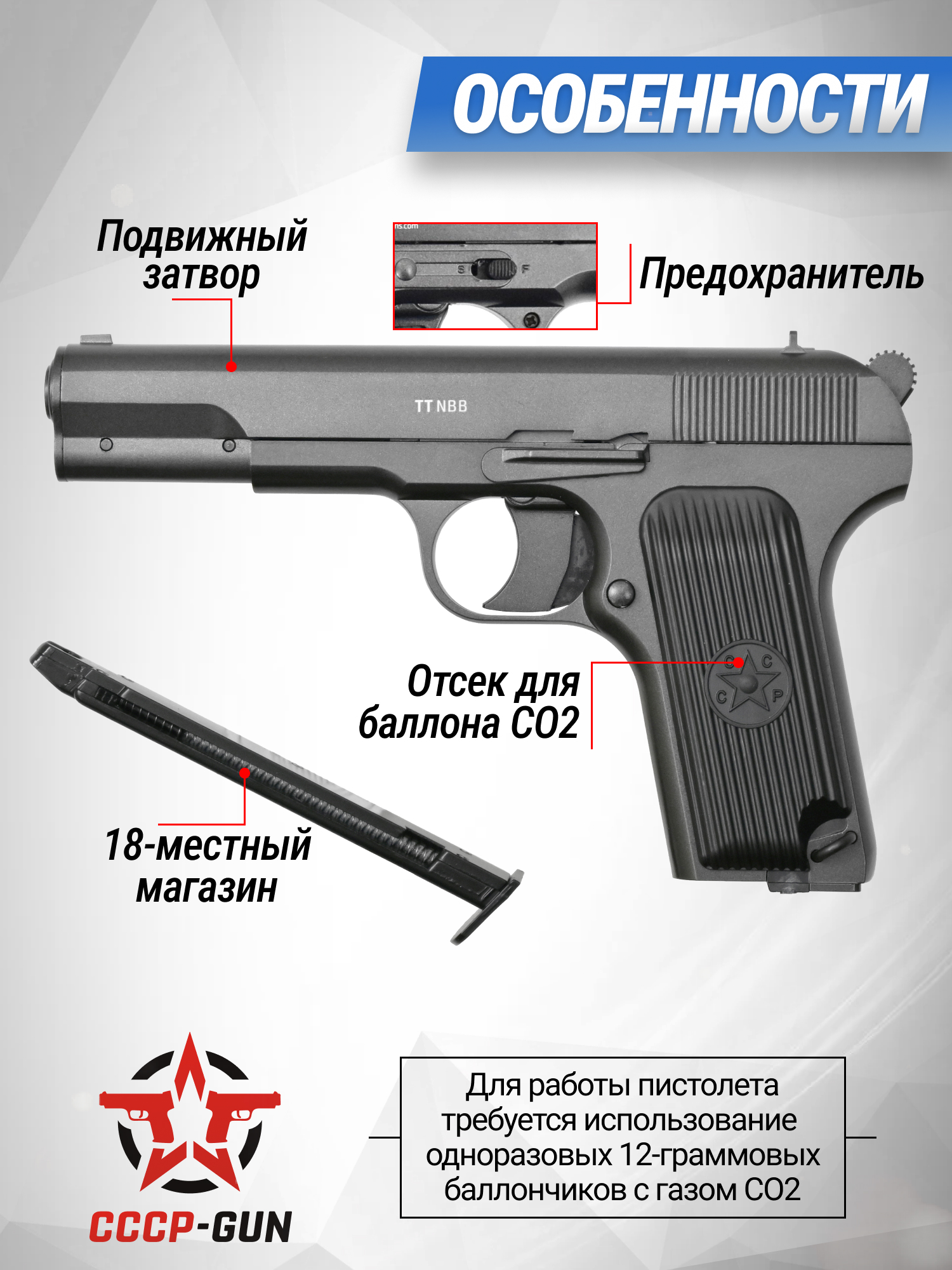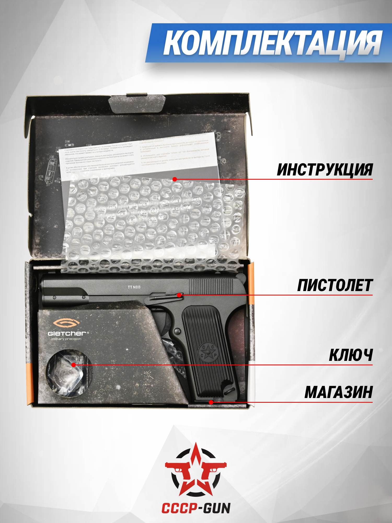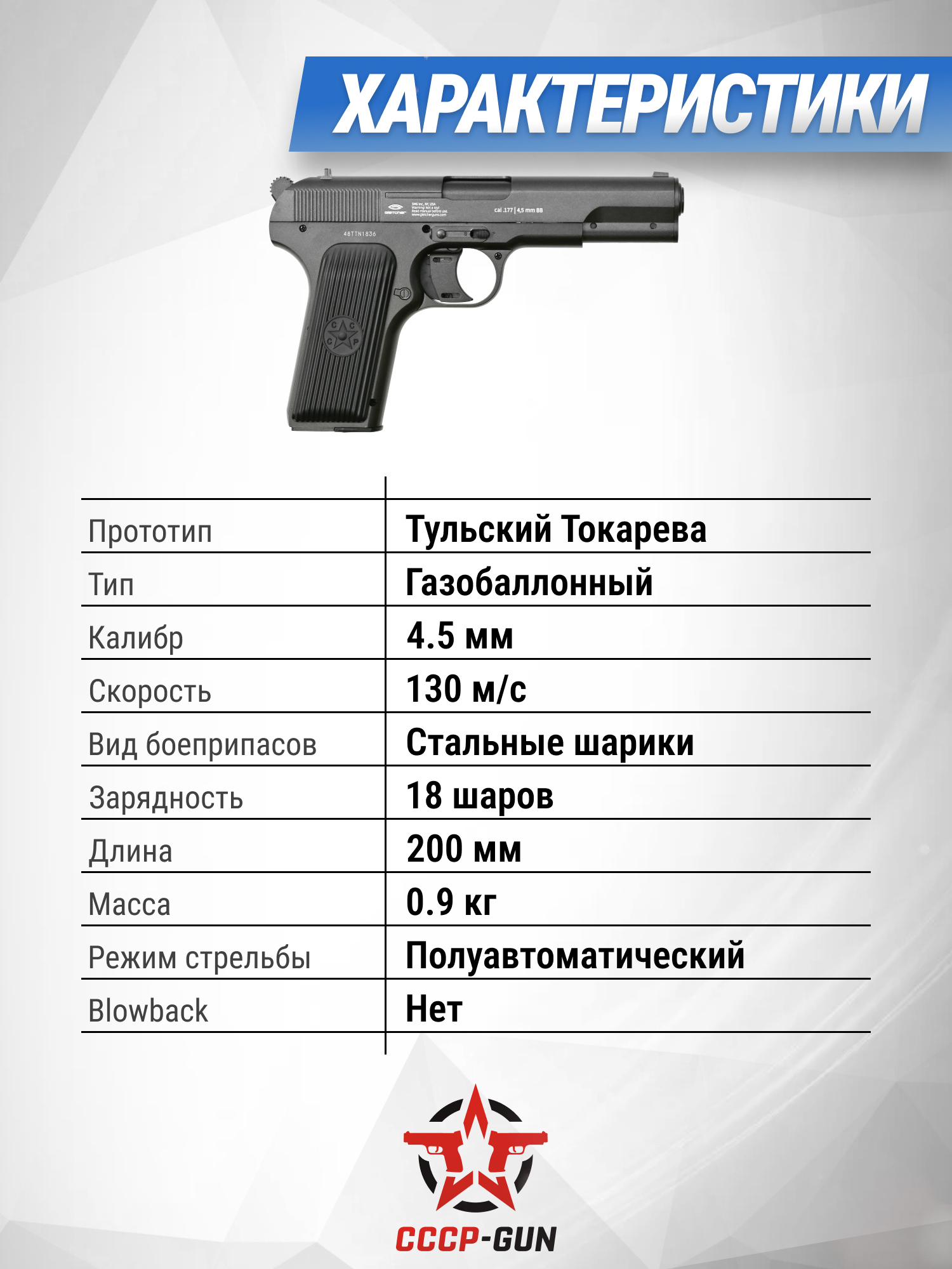Обозреваемый пистолет Глетчер ТТ применяет шарики из стали диаметра 4.5 мм. Элементом боепитания выступает емкий магазин на 18 снарядов, он поможет владельцу реже отвлекаться на перезарядку экземпляра. Модель выполнена с гладким стволом длины до 120 мм, габарит бланка наделяет боеприпасы необходимыми баллистическими характеристиками.