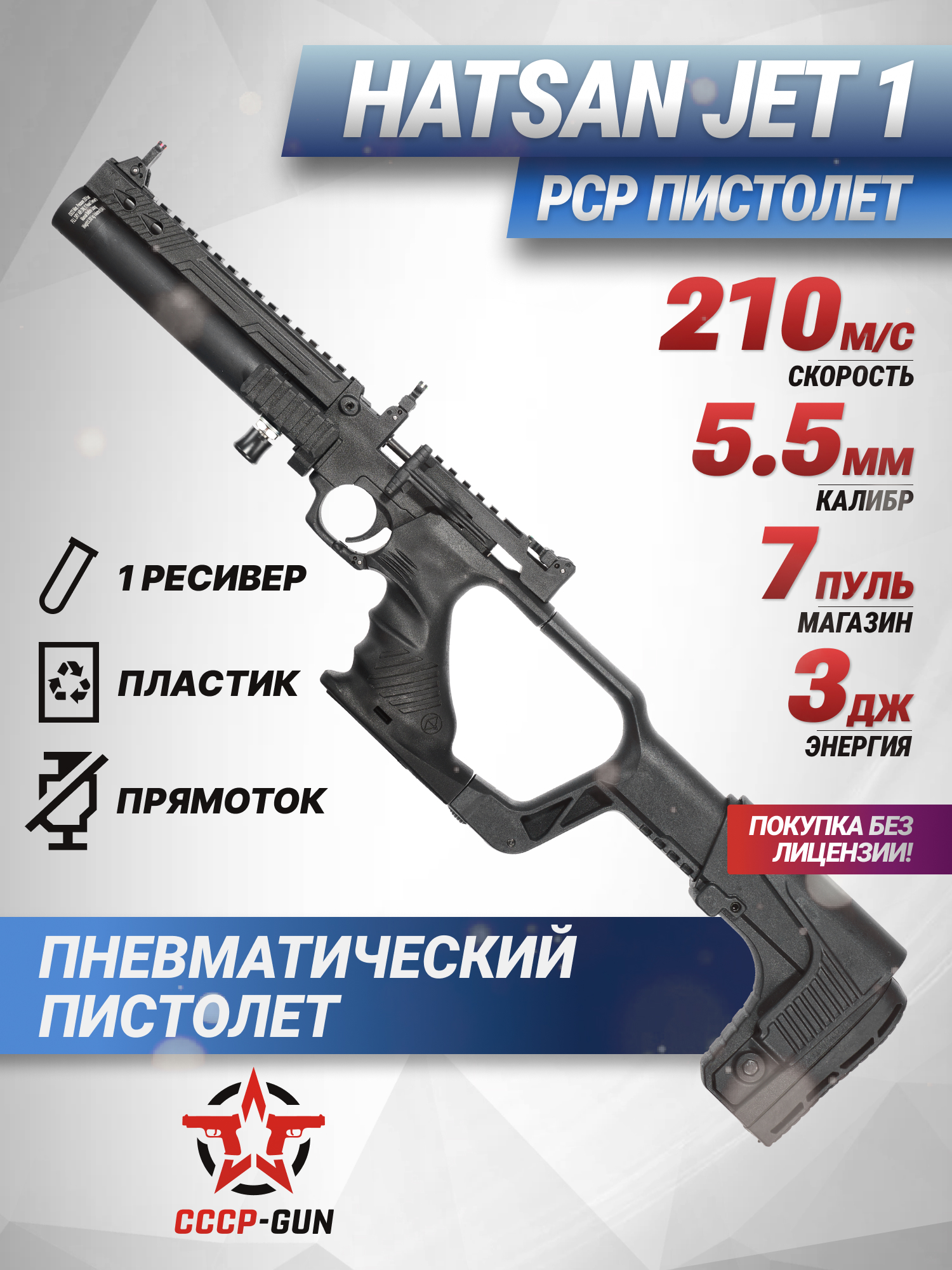 В качестве ствола на Хатсан Джет 1 установлен 200-миллиметровый нарезной бланк из стали, благодаря чему точность стрельбы существенно возрастает. Работает пистолет в одиночном режиме, функционируя в хорошем темпе благодаря барабанным 7-зарядным магазинам, которые прикладываются в комплекте в количестве двух штук. Модули такого формата автоматически досылают свинцовую пулю калибра 5.5 мм, когда пользователь оттягивает рычаг взведения, спроектированный с левой стороны корпуса изделия.