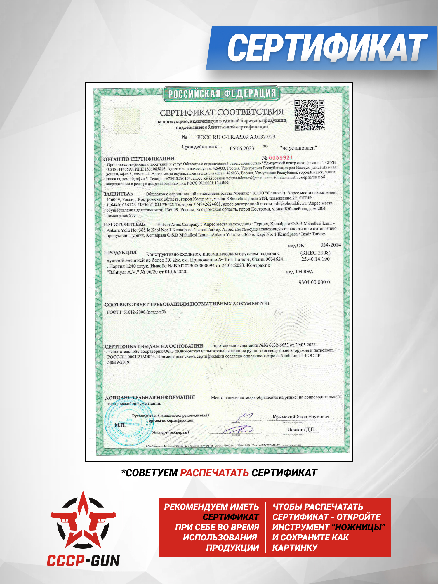 Внимание! Данная модель поставляется в разрешенной мощности для свободного приобретения на территории Российской Федерации. При этом в модели имеется возможность увеличения мощности путем замены части деталей или настройки конструкции, однако не стоит забывать о Федеральном законе «Об оружии» № 150 - ФЗ. В случае необходимости, опираясь на данный закон и руководствуясь им, возможно, потребуется получить разрешение от ЛЛР ГУ МВД России после вмешательства в конструкцию.