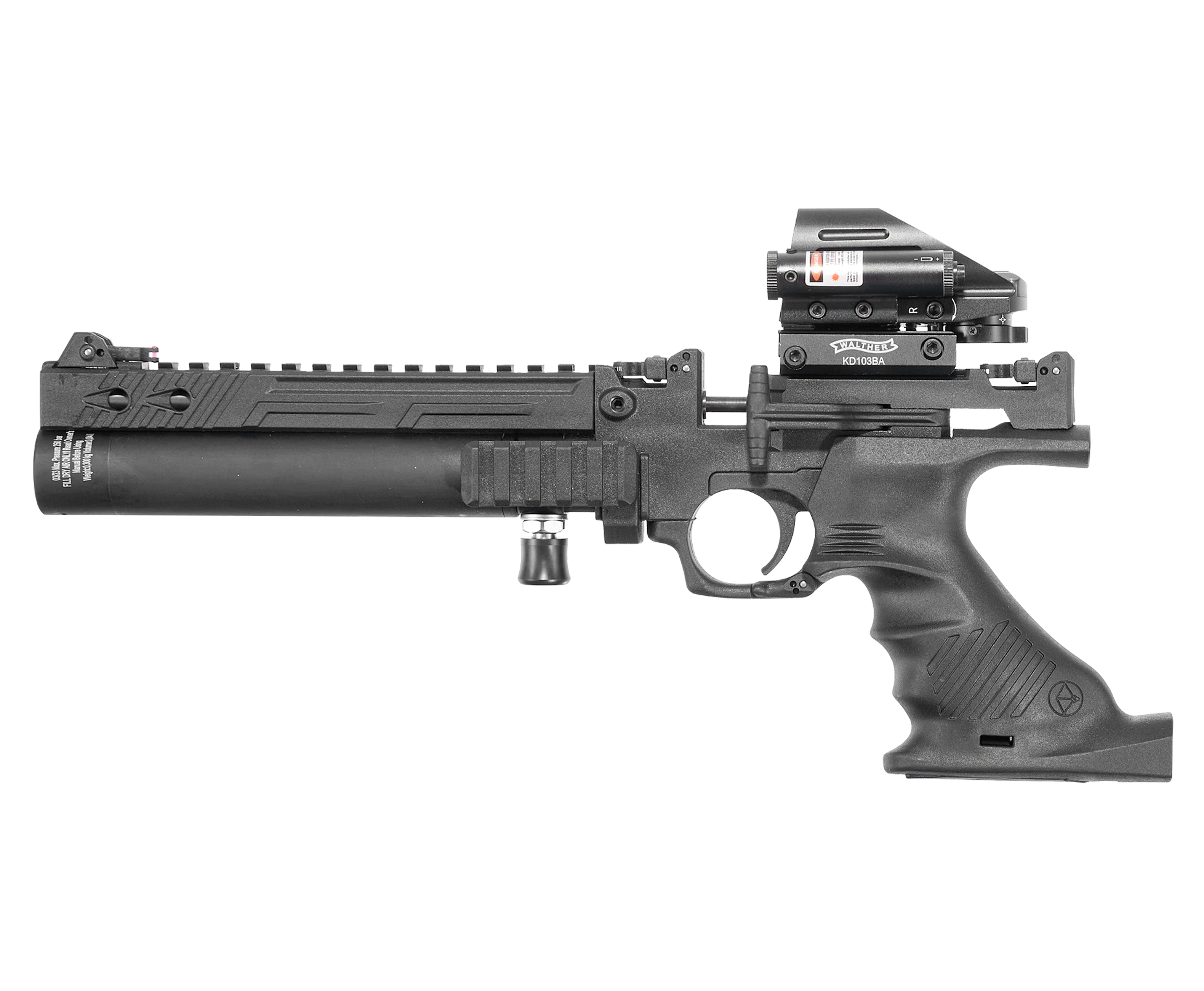 Штатно на пистолете установлено сразу два складных целика и одна мушка, в конструкцию которых интегрированы светопроводящие маркеры. Таким образом пользователь сможет комфортно работать с моделью Hatsan Jet 1 с установленным прикладом и без него. Для более точной стрельбы на пневматике закрепляется оптический или коллиматорный прицел, которые фиксируются на планке Вивер 22 мм, а для монтажа ЛЦУ и фонарей по бокам ресивера спроектированы две направляющие типа Пикатинни.