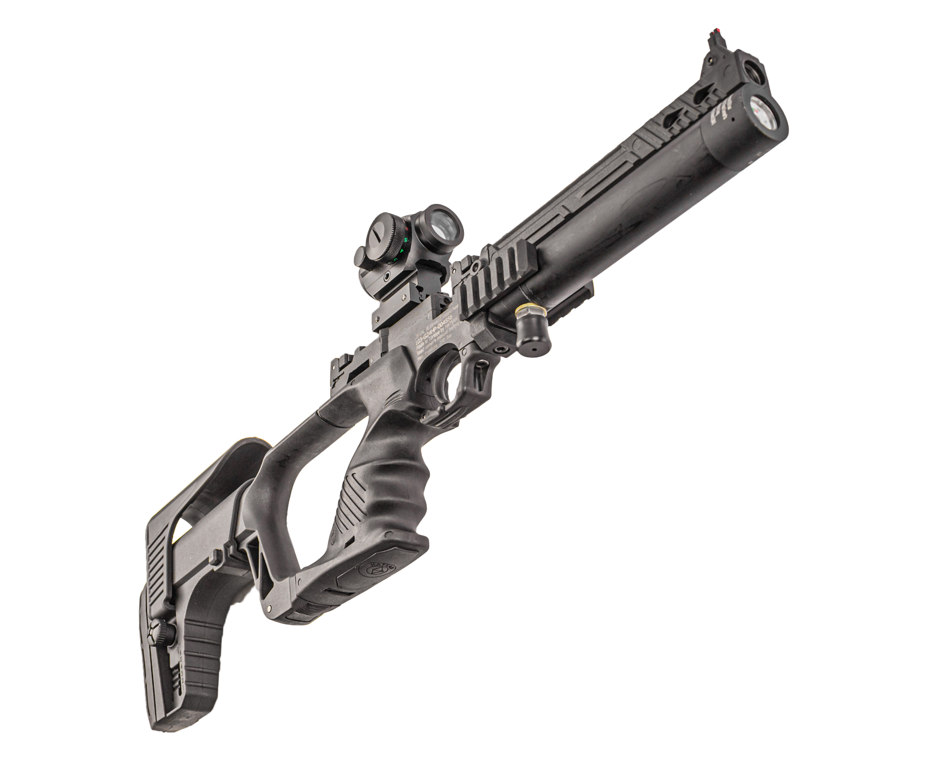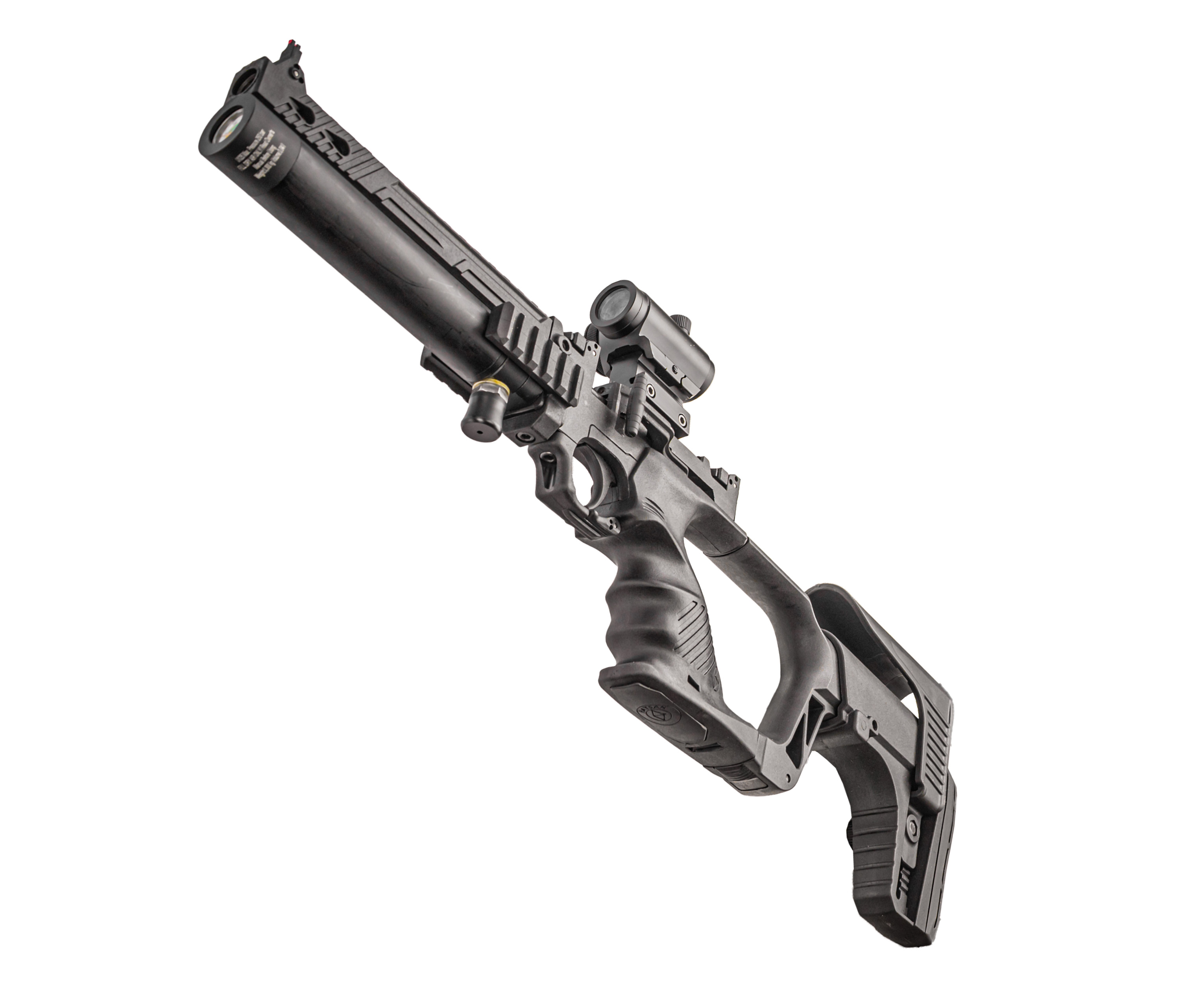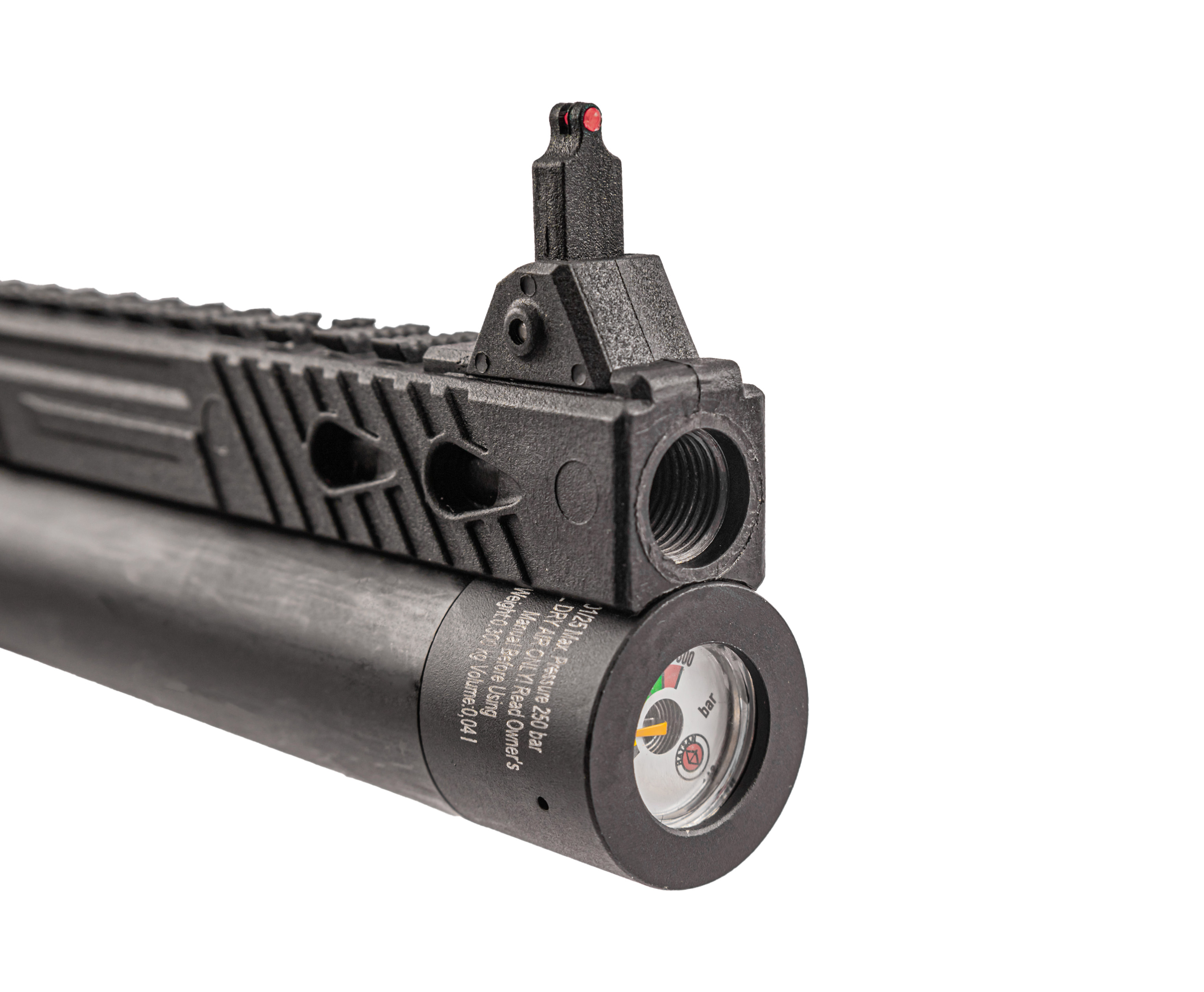 Как утверждает производитель, после процедуры усиления пистолет сможет стрелять свинцовыми пулями 0.25 дюйма разгоняя их до скорости в 197 метров в секунду. В комплекте с изделием идут два магазина на 7 единиц боеприпасов каждый. Поскольку работает оружие в одиночном режиме с левой стороны спроектирован удобный рычаг биатлонного форм-фактора для быстрого взведения пневматики.