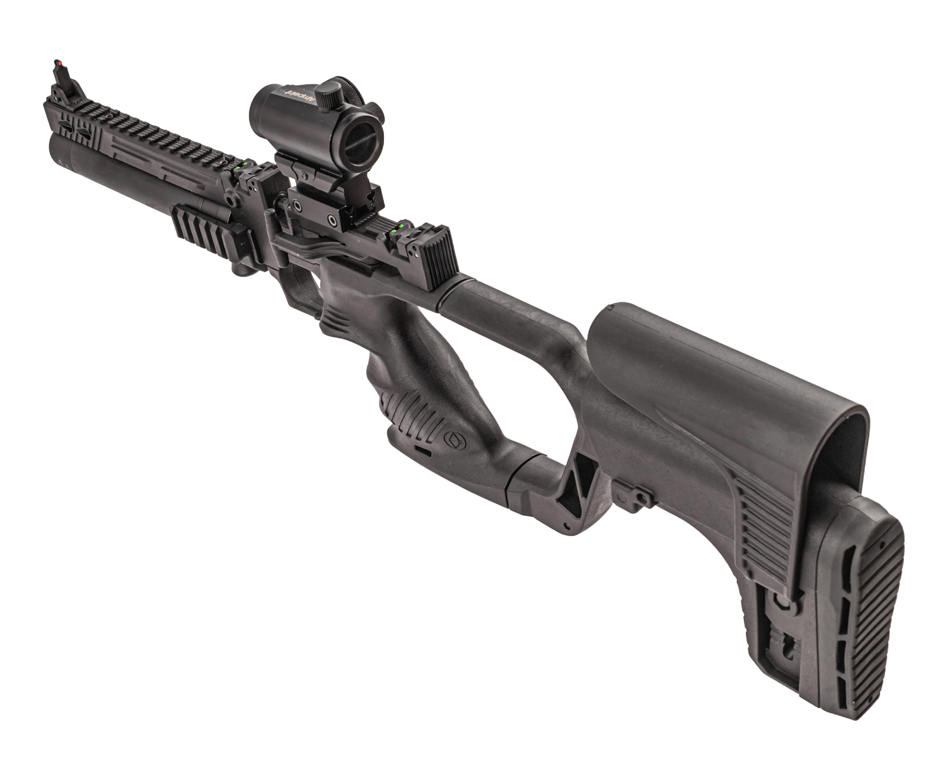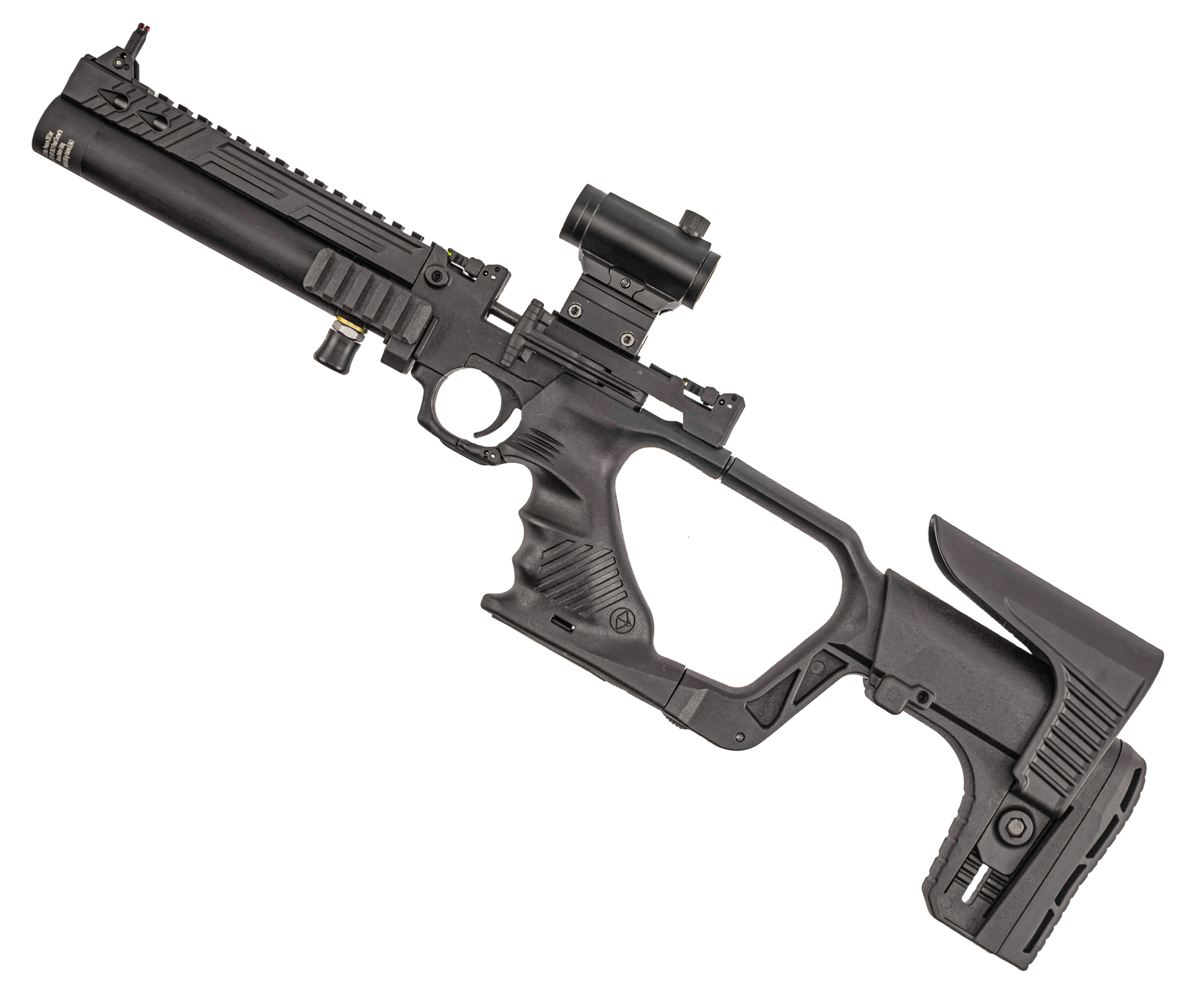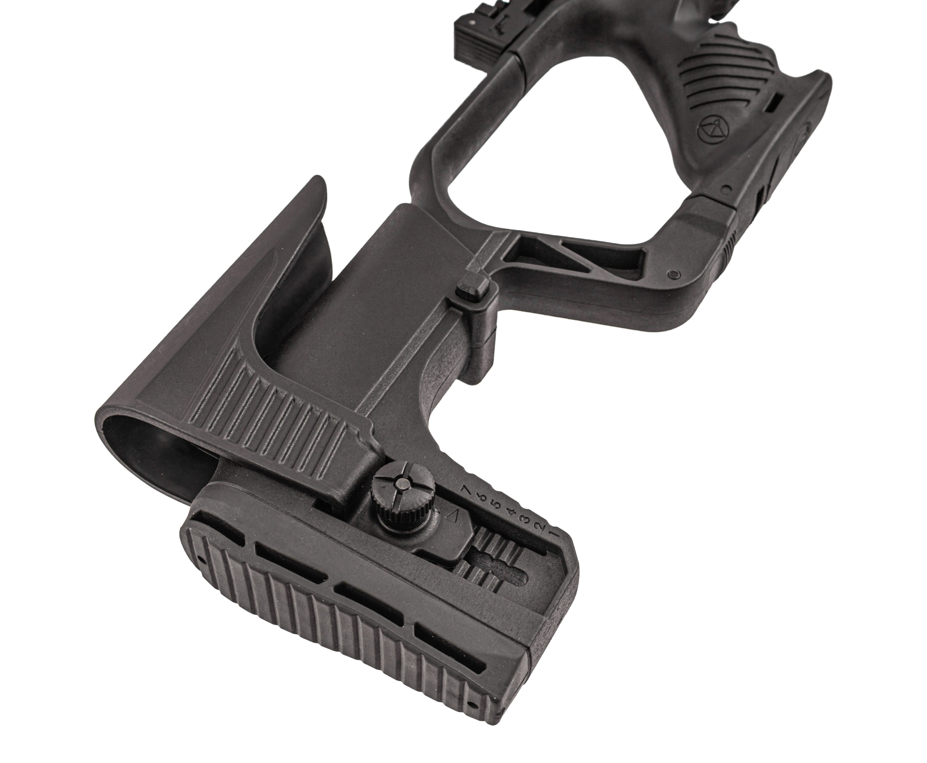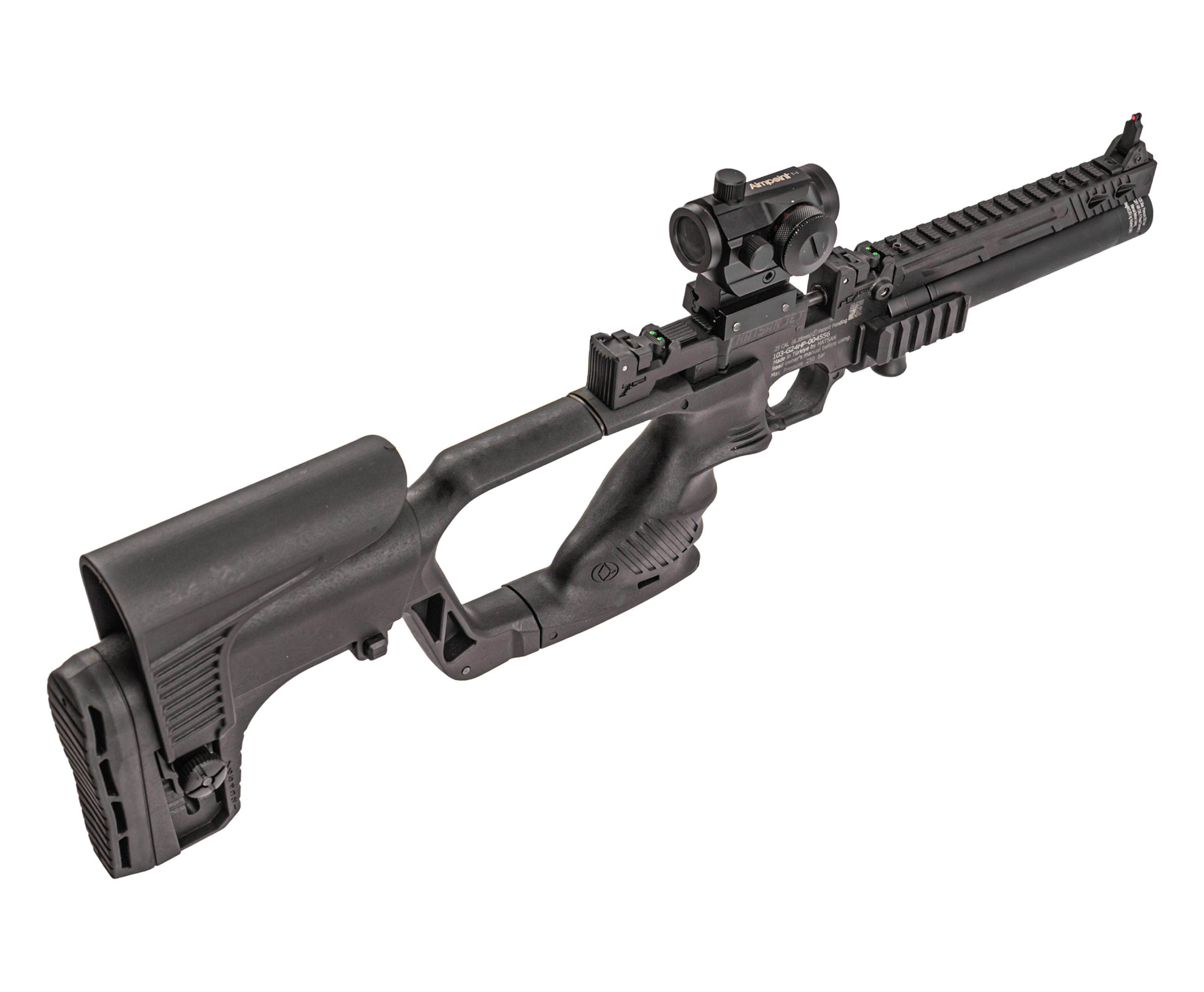 Обозреваемый пистолет обладает массой до 0.9 кг, это возможно благодаря облегченной ортопедической рукояти с подпальцевыми выемками. Длина пистолета составляет 38 см, а если поставить приклад быстросъемного плана размеры устройства увеличатся до 62.5 см, сделав оружие компактным карабином в спортивном дизайне. С помощью упругого тыльника и подщечника с функцией регулировки пользователь получает возможность настроить изделие под себя.