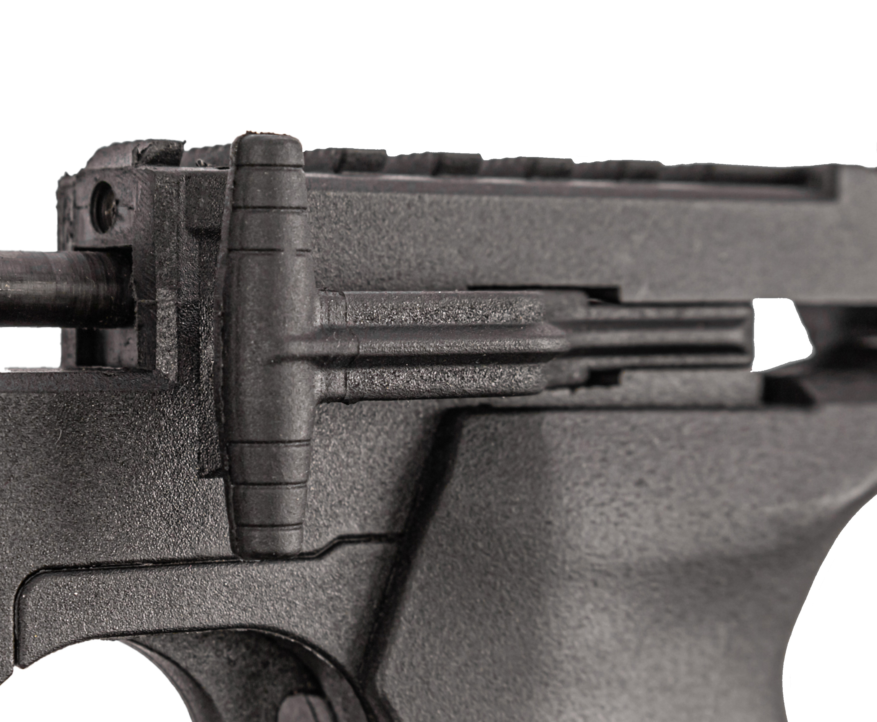 Когда стрелок нажимает на спуск, пневматика дозировано высвобождает давление, которое разгоняет пулю по нарезному каналу 200-миллиметрового ствола. Поскольку Hatsan Jet 1 поступает в Россию с мощностью, не переходящей за рамки 3 Дж, обозреваемая модель приобретается свободно и не требует от будущего владельца получать разрешение в Росгвардии. Чтобы дополнительно обезопасить пользователя, конструкторы Хатсан спроектировали на спусковой скобе двухпозиционный элемент, выполняющий роль предохранителя.