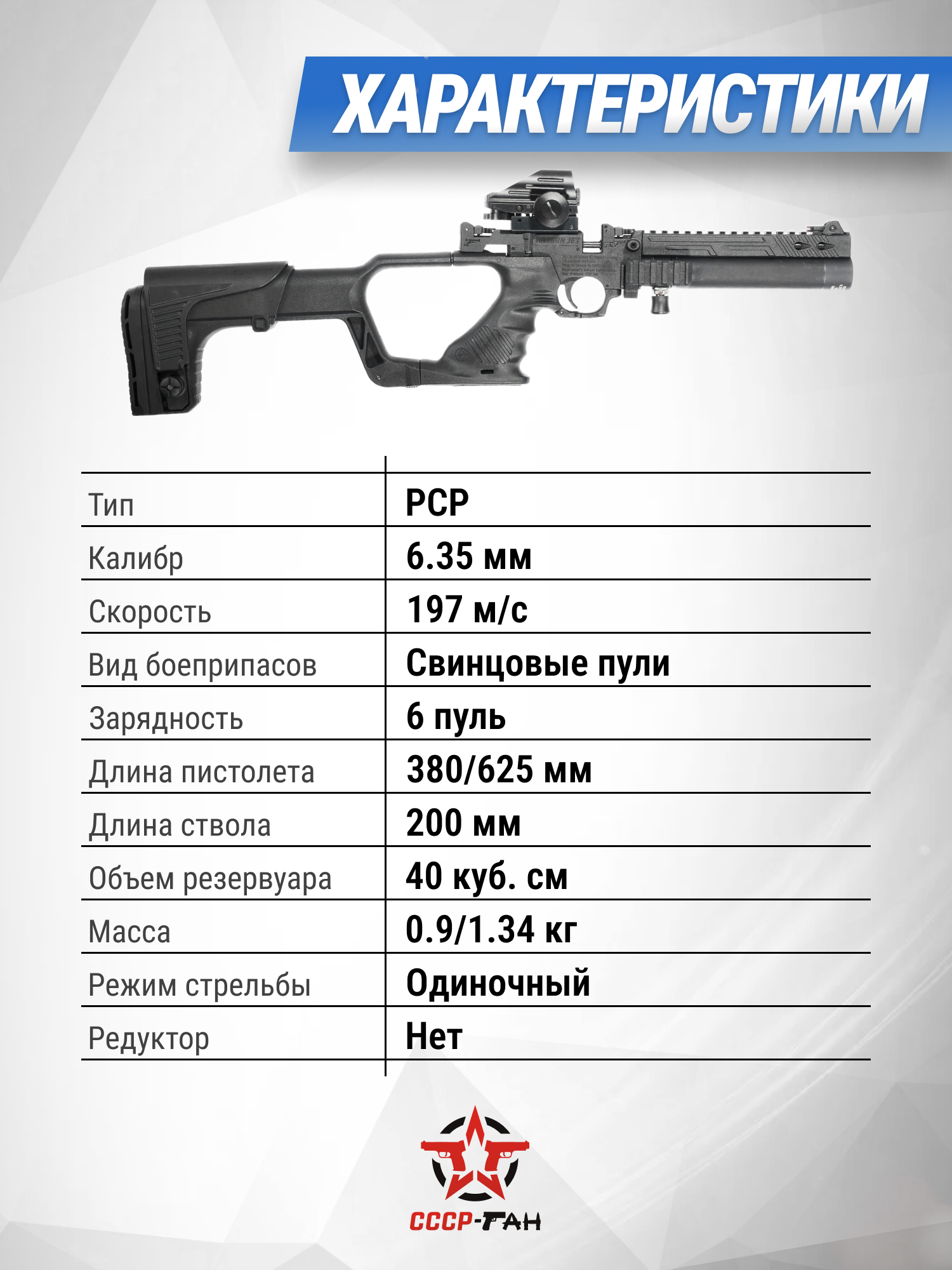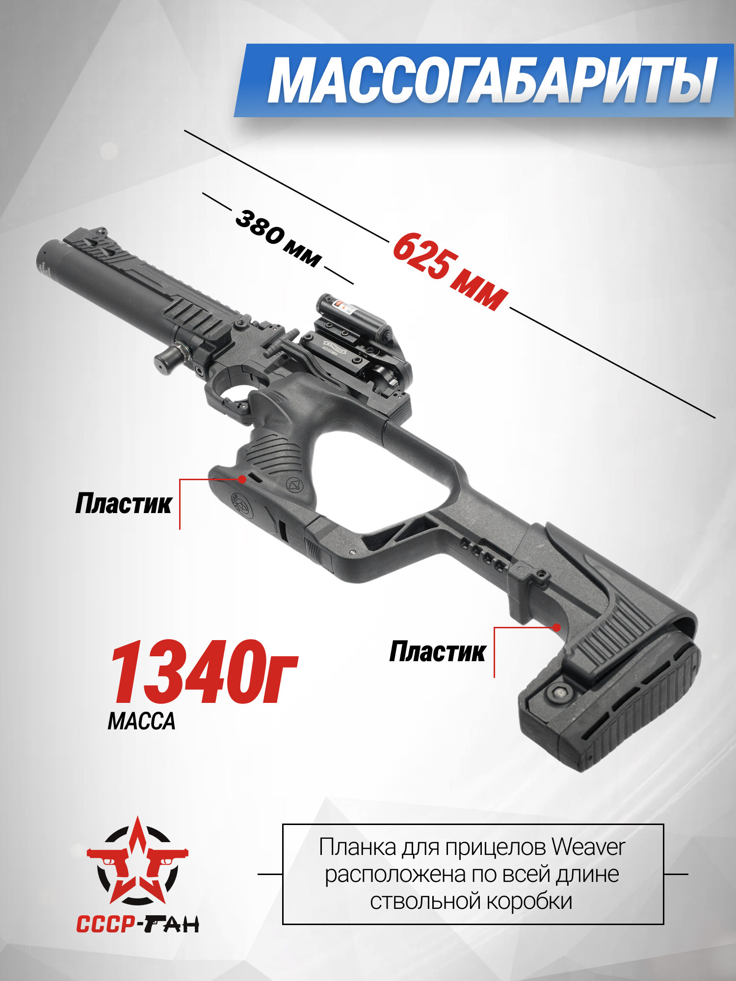 Обозреваемый пистолет обладает массой до 0.9 кг, это возможно благодаря облегченной ортопедической рукояти с подпальцевыми выемками. Длина пистолета составляет 38 см, а если поставить приклад быстросъемного плана размеры устройства увеличатся до 62.5 см, сделав оружие компактным карабином в спортивном дизайне. С помощью упругого тыльника и подщечника с функцией регулировки пользователь получает возможность настроить изделие под себя.