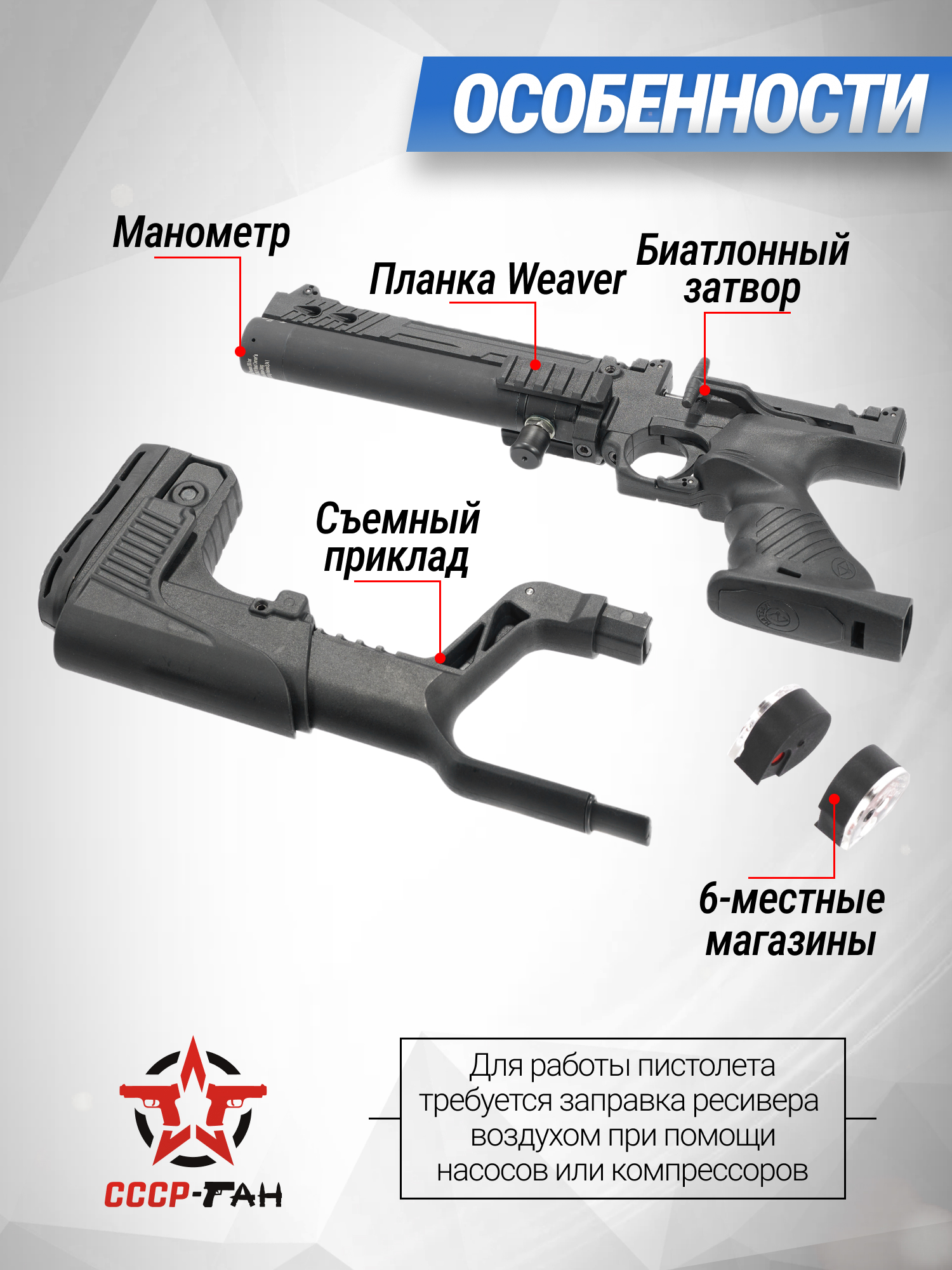 Как утверждает производитель, после процедуры усиления пистолет сможет стрелять свинцовыми пулями 0.25 дюйма разгоняя их до скорости в 197 метров в секунду. В комплекте с изделием идут два магазина на 7 единиц боеприпасов каждый. Поскольку работает оружие в одиночном режиме с левой стороны спроектирован удобный рычаг биатлонного форм-фактора для быстрого взведения пневматики.