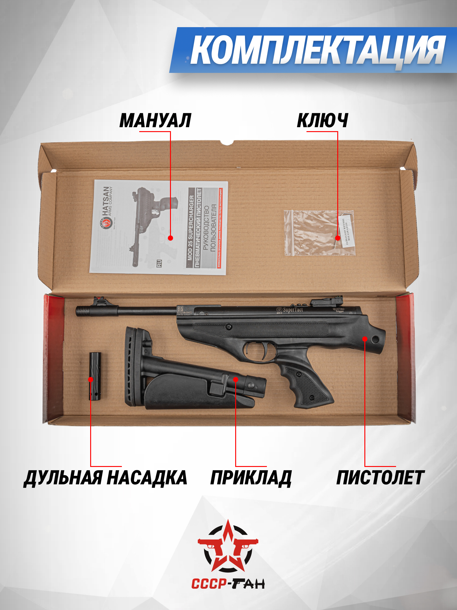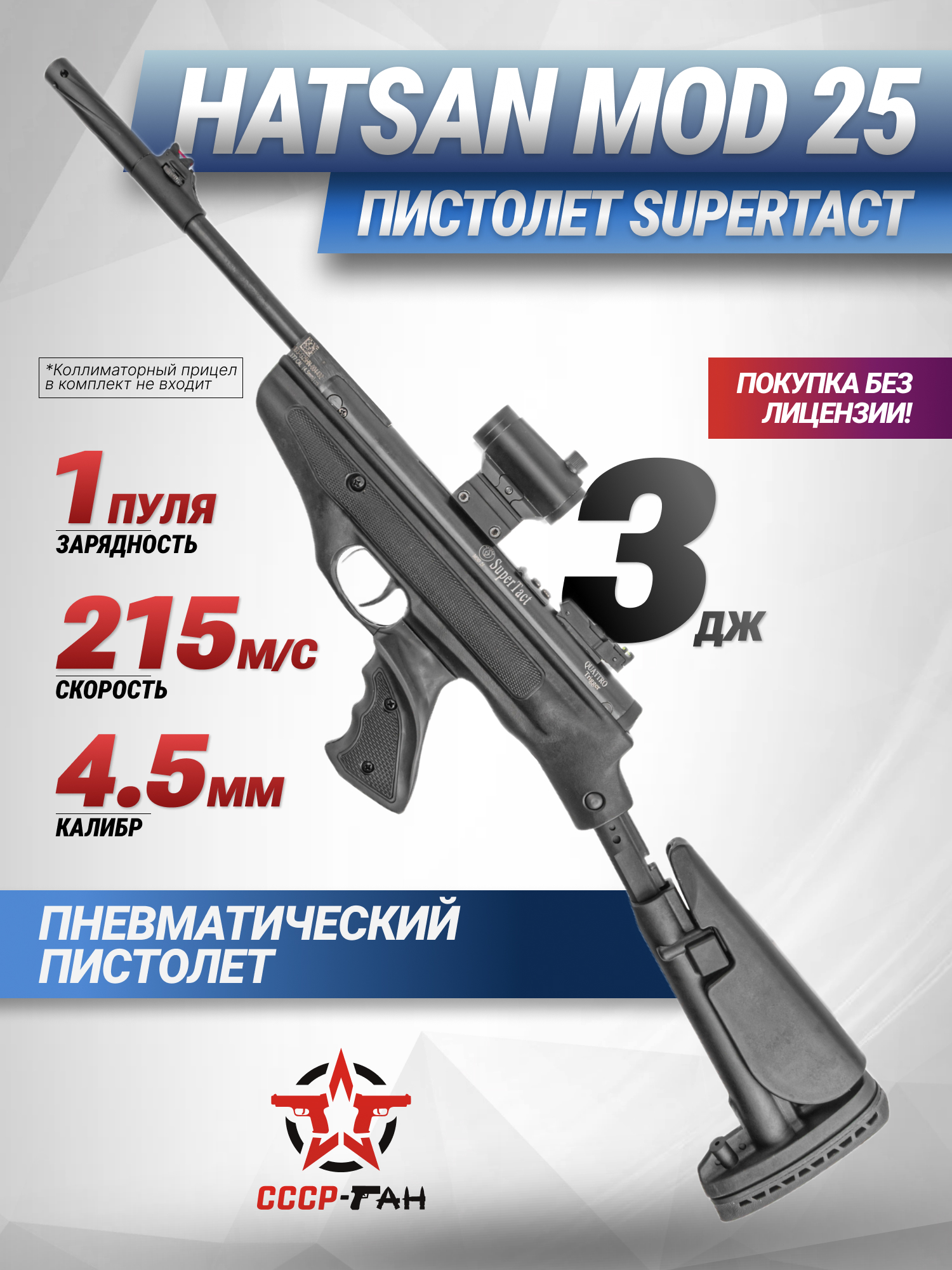 Ради повышения радиуса эффективного применения стрелок может смонтировать дополнительное оптическое оборудование. Интеграция прицела производится на верхнюю платформу «Ласточкин хвост» 11 мм. Пневматический пистолет Хатсан МОД 25 снабжен бланком из стали, что увеличило эксплуатационный период, а монтаж плечевого упора выполняется в полевых условиях без обращения к инструментам.