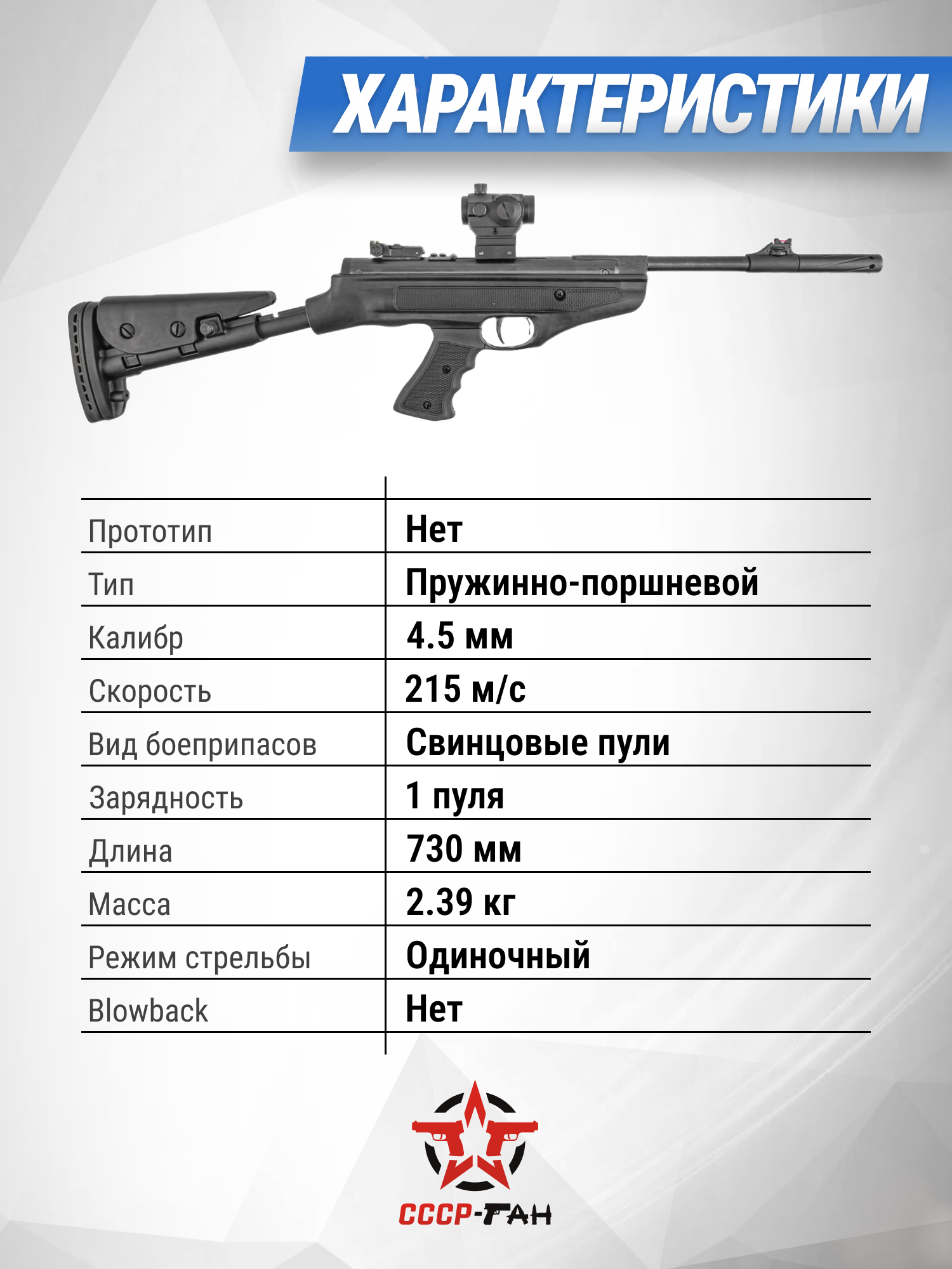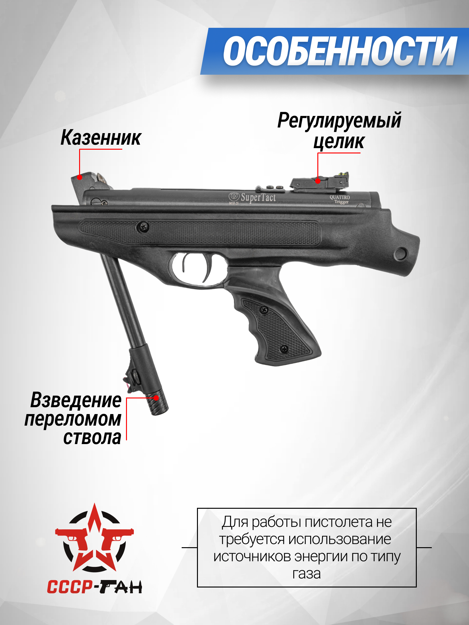 Внимание! Данная модель поставляется в разрешенной мощности для свободного приобретения на территории Российской Федерации. При этом в модели имеется возможность увеличения мощности путем замены части деталей или настройки конструкции, однако не стоит забывать о Федеральном законе «Об оружии» № 150 - ФЗ. В случае необходимости, опираясь на данный закон и руководствуясь им, возможно, потребуется получить разрешение от ЛЛР ГУ МВД России после вмешательства в конструкцию.
