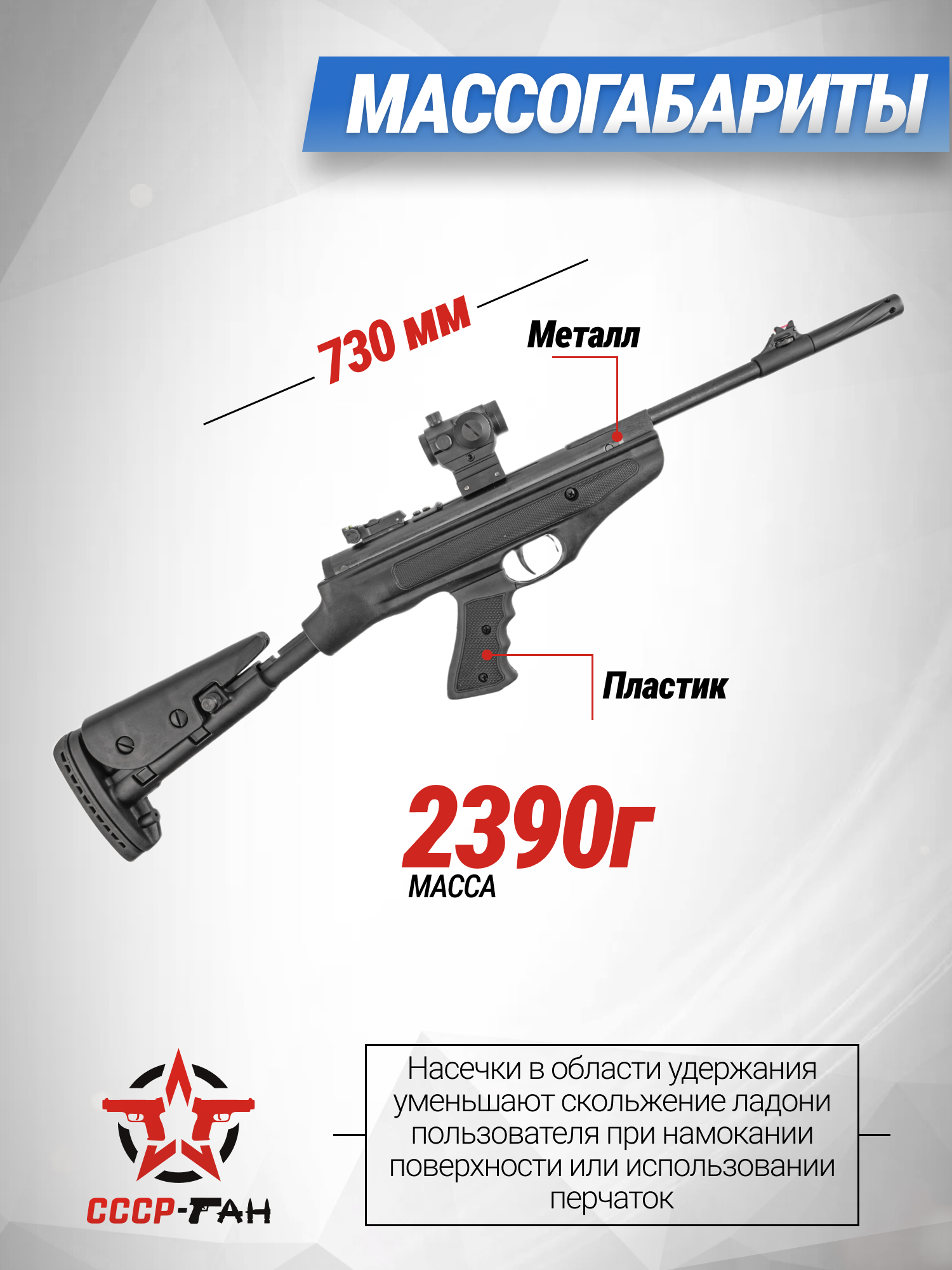 Рамка изготавливается из полимерного сырья. Использование ударопрочного пластика позволило зафиксировать вес пневматики в собранной конфигурации на отметке 2390 г при длине 730 мм. Пистолетная рукоять снабжена анатомическими углублениями под пальцы пользователя, что в комбинации с шероховатым текстурированным покрытием исключает проскальзывание ладони и обеспечивает плотное удержание.