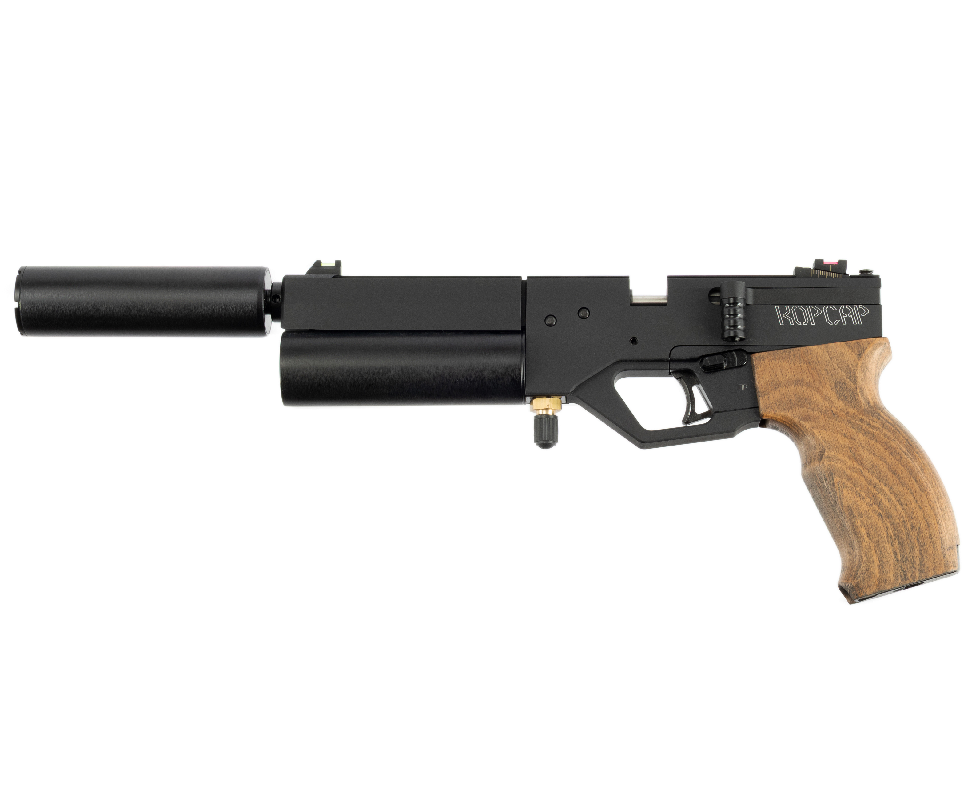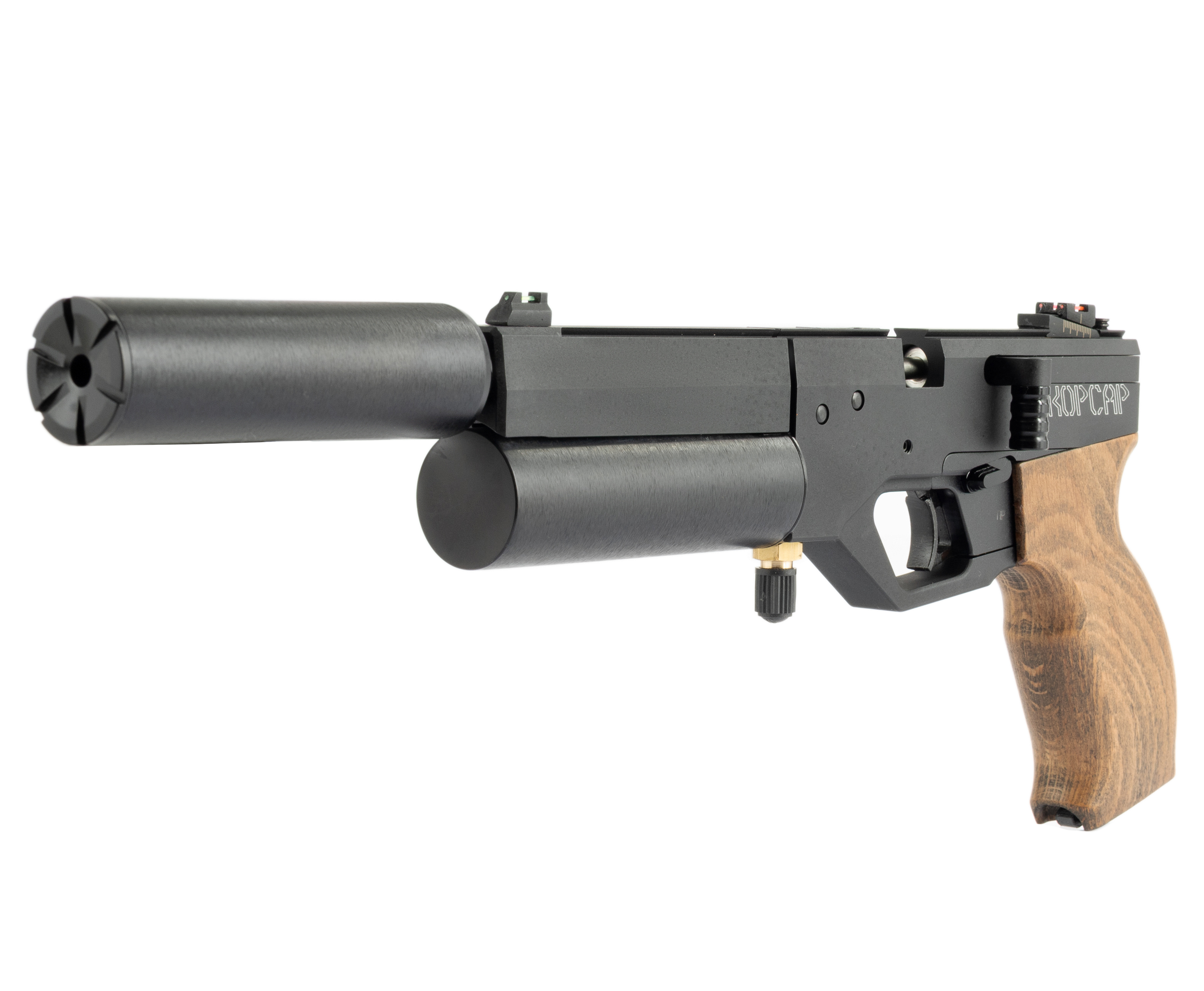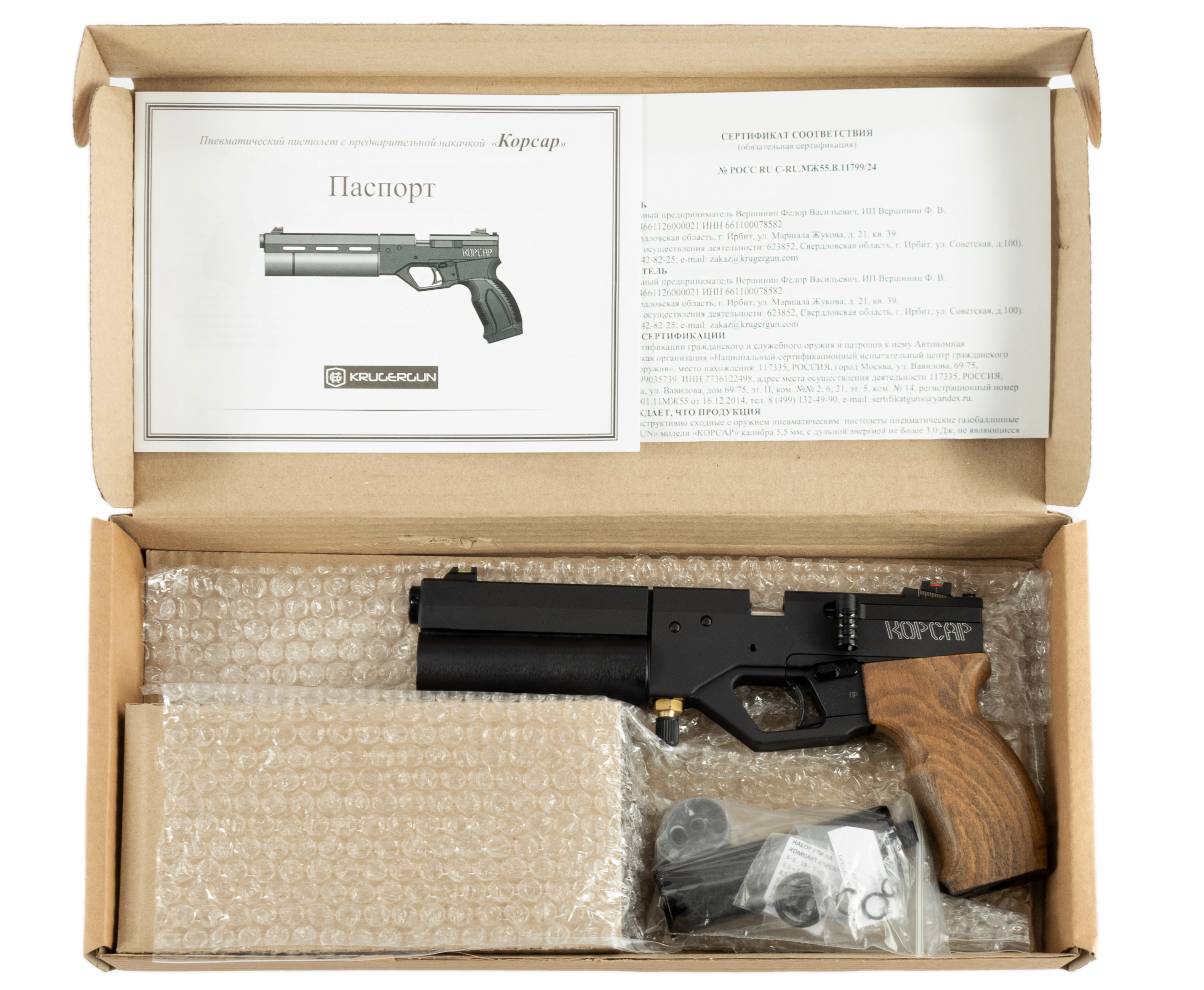 KrugerGun Корсар Компакт 5.5 мм D32 - это пистолет, функционирующий по принципу пневматики с предварительной накачкой воздуха в трубчатый резервуар объемом 42 кубических сантиметра. Перед стрельбой оружие заправляется с помощью насоса или электрического компрессора до рекомендуемого давления в 300 Бар. Для отслеживания этого параметра производитель рекомендует использовать оборудование с встроенным манометром.
