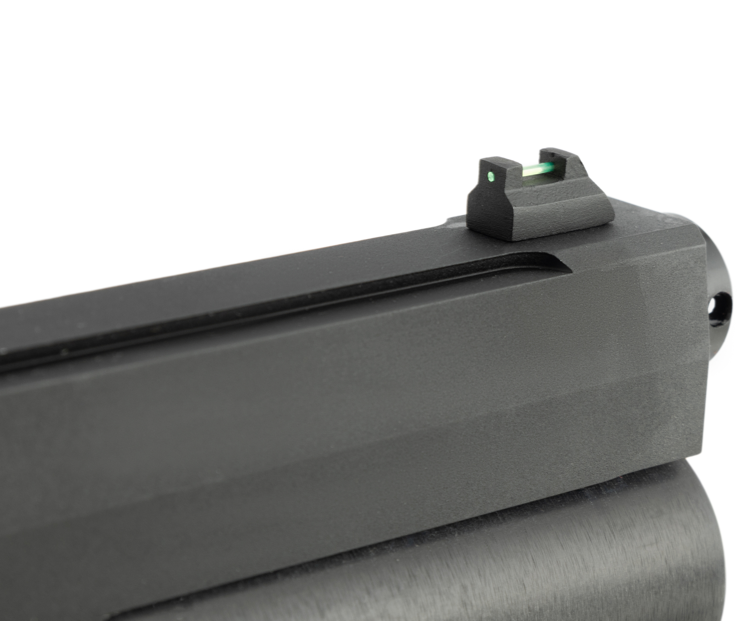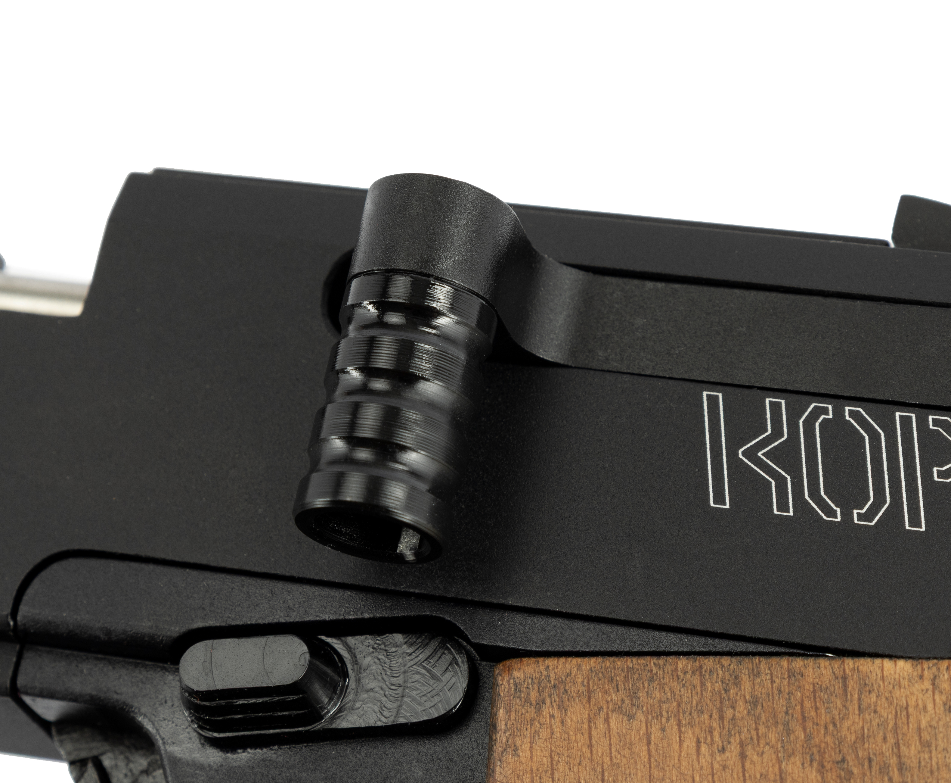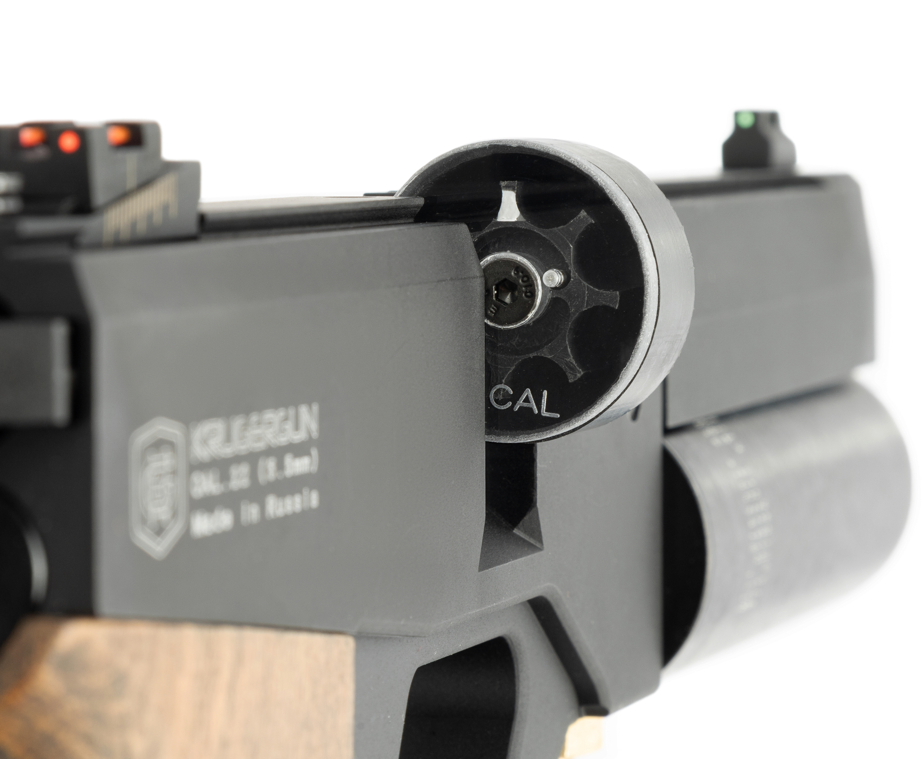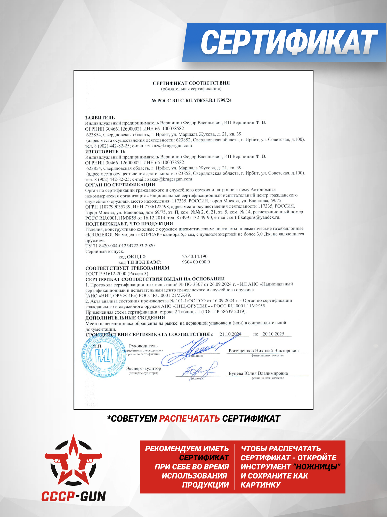 Крюгерган Корсар Компакт светлое дерево работает со свинцовыми пулями калибра 5.5 мм формата воланчик. Заряжаются эти боеприпасы в комплектный барабанный 7-слотовый магазин, помогающий ускорять темп стрельбы поскольку функционирует оружие в одиночном режиме. Чтобы сделать устройство безопасным, на левой стороне корпуса изделия конструкторы KrugerGun разместили флажковый предохранитель.