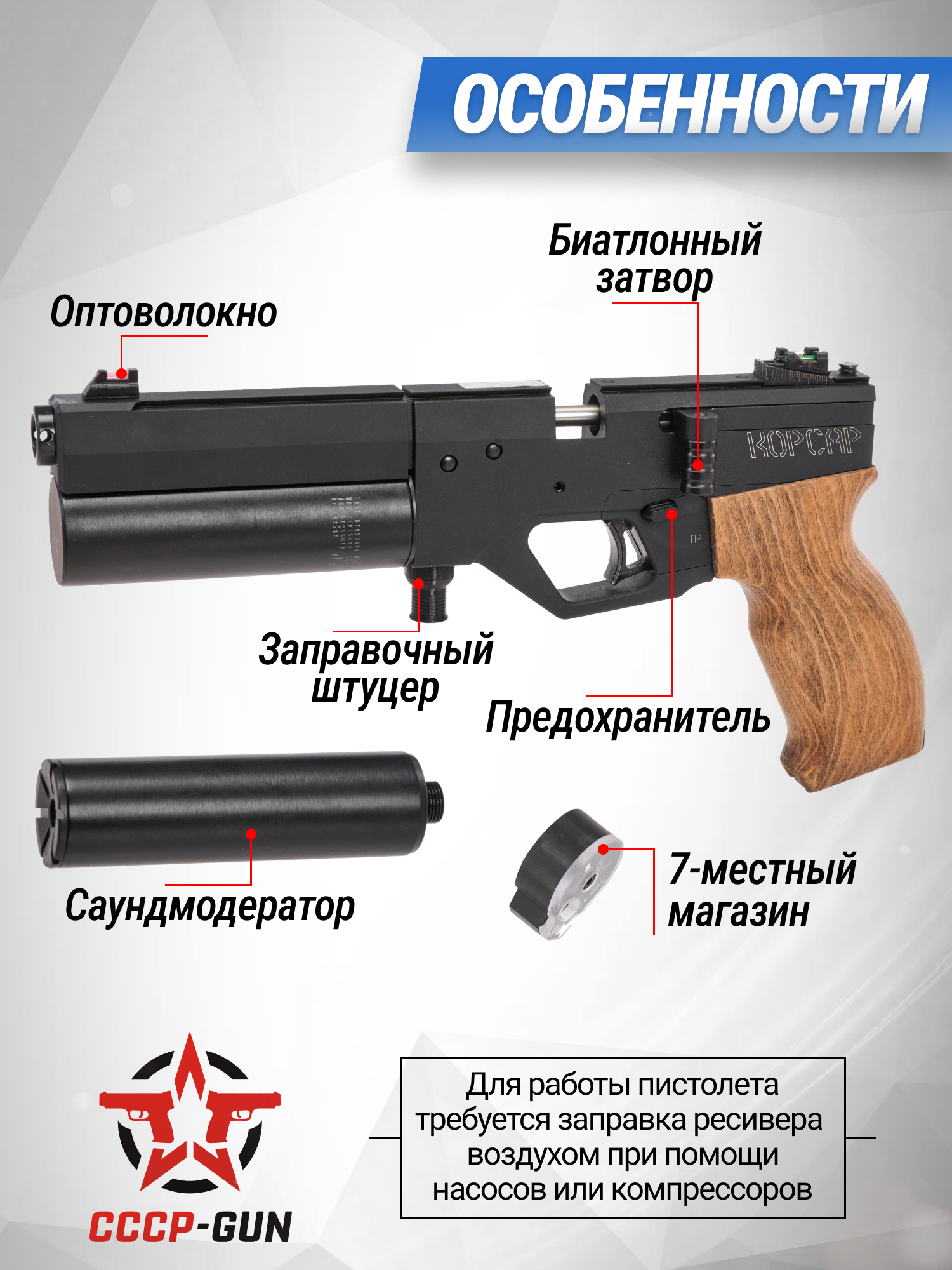 Отличительной особенностью пистолетов серии Корсар является то, что штатно модели оснащены механическими прицельными приспособлениями, в которых мушка и регулируемый целик оборудованы светонакопительными стержнями. Помимо этого, в комплекте с представленным изделием идет звукомодератор и крепеж на рукоять для монтажа, приобретаемого отдельно приклада. Более точную стрельбу помогают реализовать коллиматорные прицелы, которые устанавливаются на проработанную планку типа «Ласточкин хвост» 11 миллиметров.