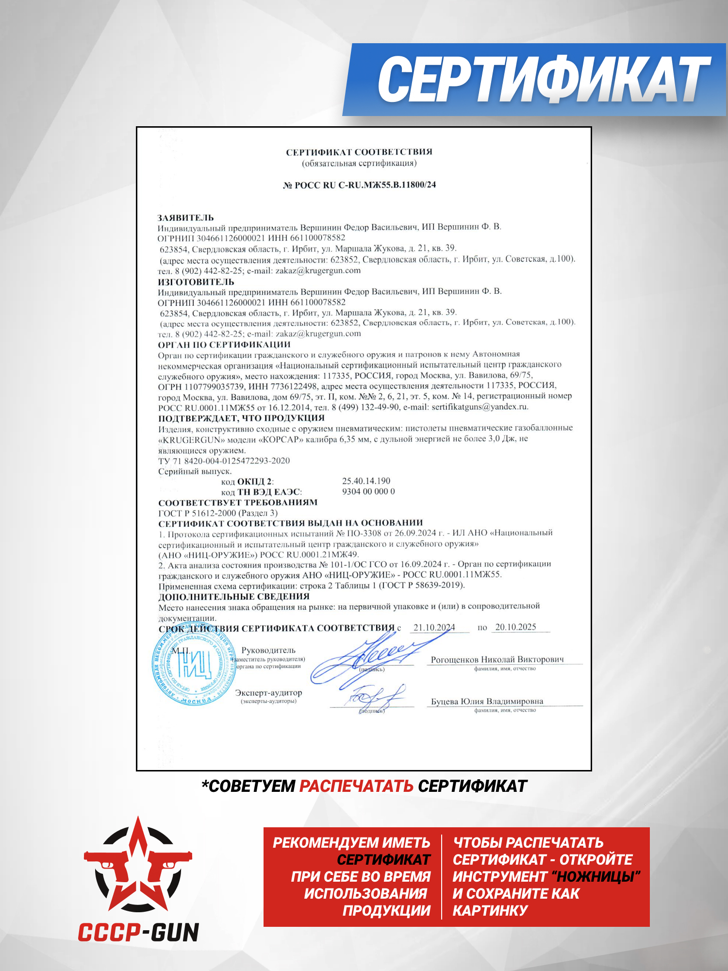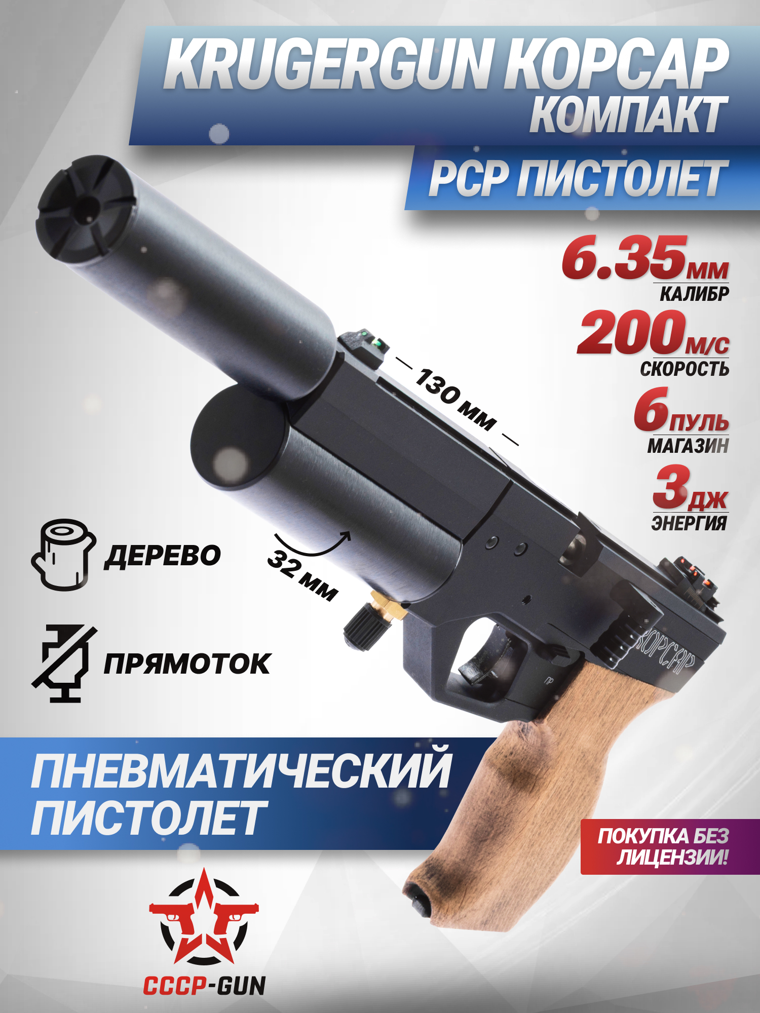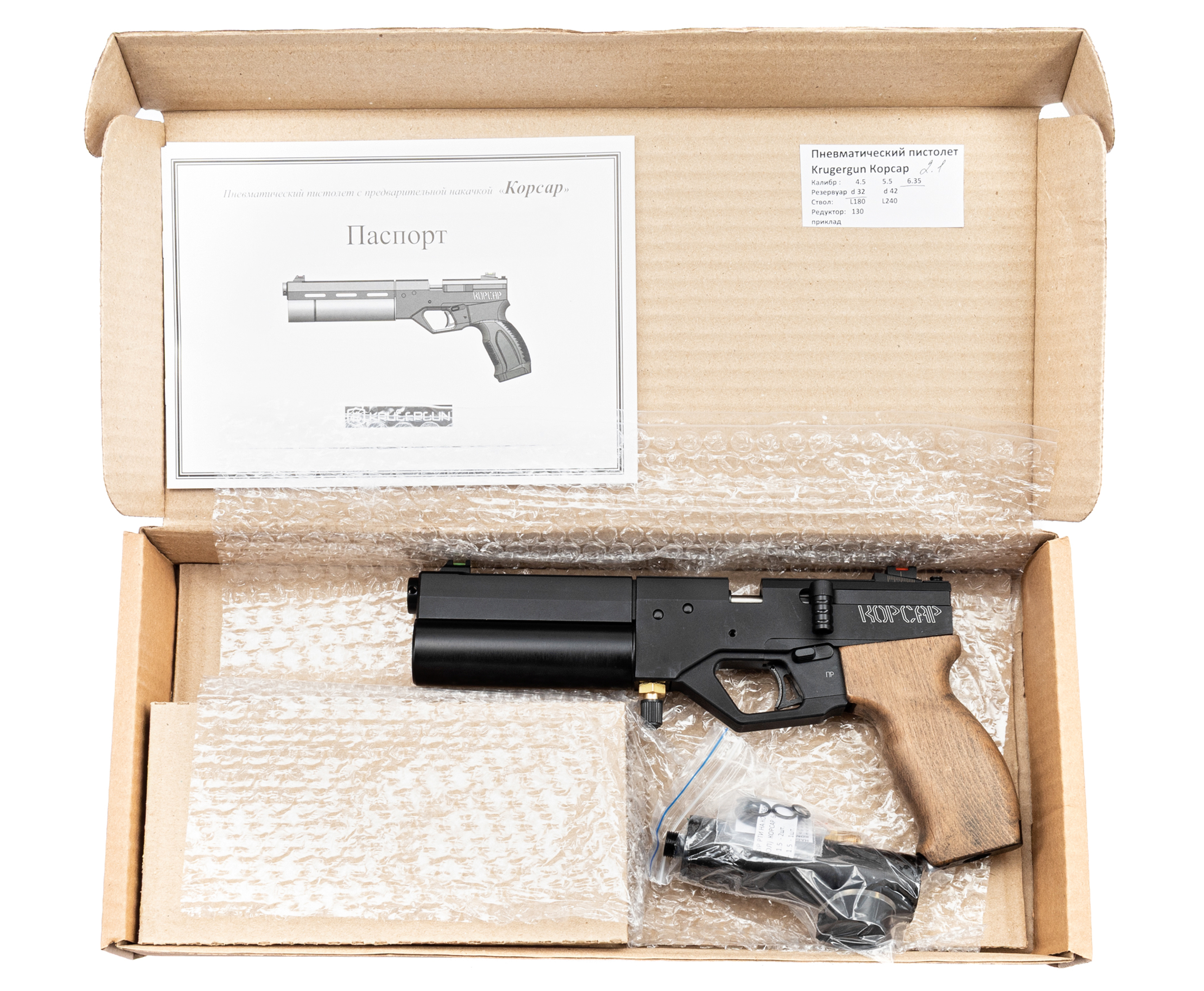 Крюгерган Корсар Компакт Д32 с деревянной рукоятью свободно продается в России по той причине, что производитель выпускает пистолеты с дульной энергией не переходящей за рамки показателя 3 J. Это позволяет приобретать изделия начинающим спортсменам из стрелковых дисциплин, которые пока не получили оружейную лицензию. После усиления обозреваемый пистолет будет разгонять боеприпасы до скорости равной 200 метров в секунду. Для безопасности стрелка и его окружения инженеры Krugergun спроектировали на пистолете надежный флажковый предохранитель.