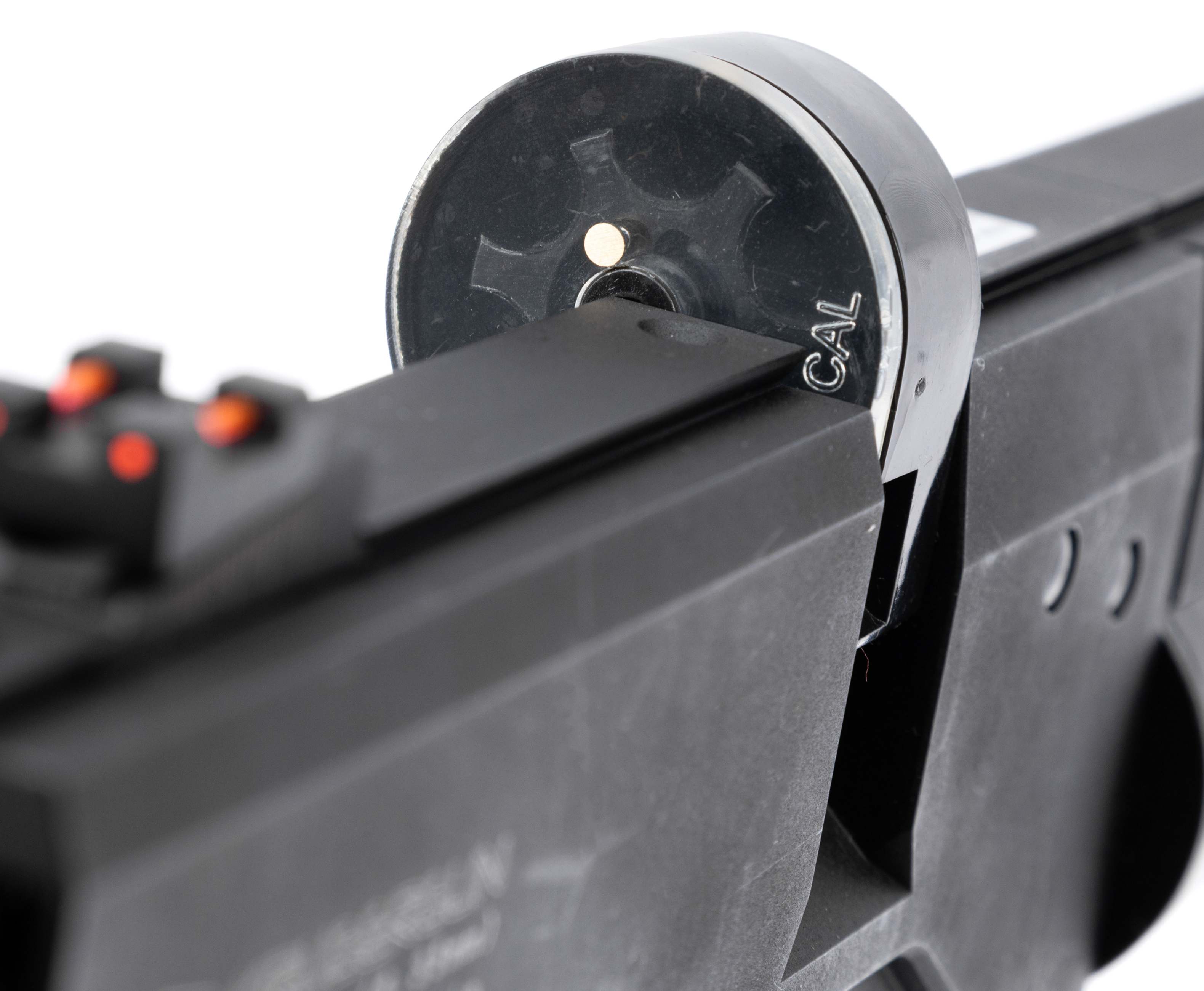 Рассматриваемая пневматика стреляет свинцовыми пулями калибра 6.35 мм, по форме напоминающими воланчик. Такие снаряды правильно распределяют давление воздуха, толкающее их по каналу 130-миллиметрового нарезного ствола, за счет специальной юбки на тыльной части боеприпаса. Поскольку функционирует оружие в одиночном режиме стрельбы, ускорить темп помогает отъемный барабанный магазин на 6 единиц пуль, который автоматически прокручивается при взведении оружия с помощью компактной ручки с левой стороны корпуса пистолета.