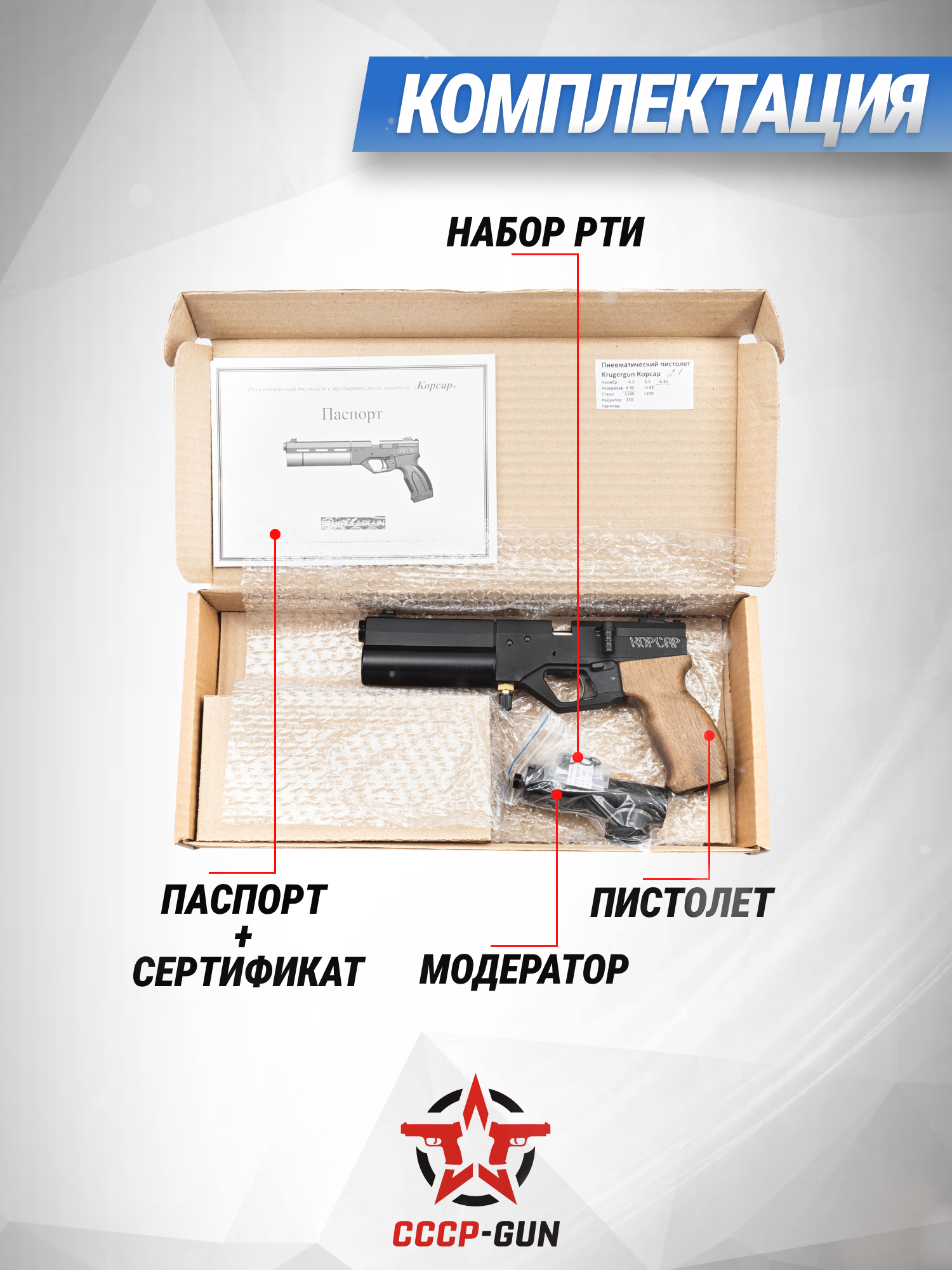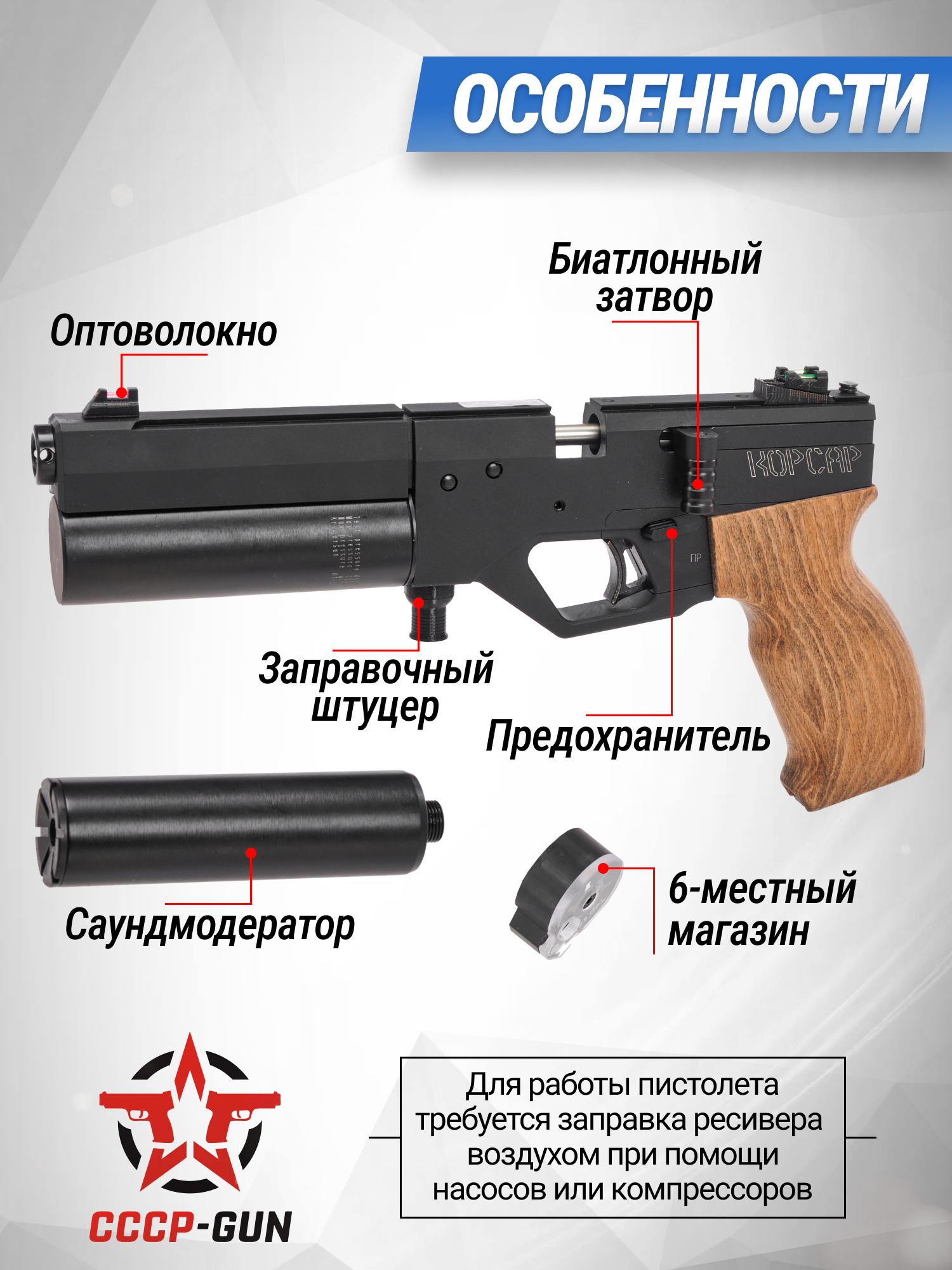 Обозреваемая модель из серии Корсар выделяется компактными габаритами, которые составляют 250x140x35 мм, при этом масса изделия равна 755 г. Длина оружия с комплектным съемным звукомодератором увеличивается до 400 мм. Изготавливается корпус пистолета из прочного металлического сплава, а рукоять эргономичной формы выполнена в вариации светлого дерева, что добавляет модели брутальный внешний вид.