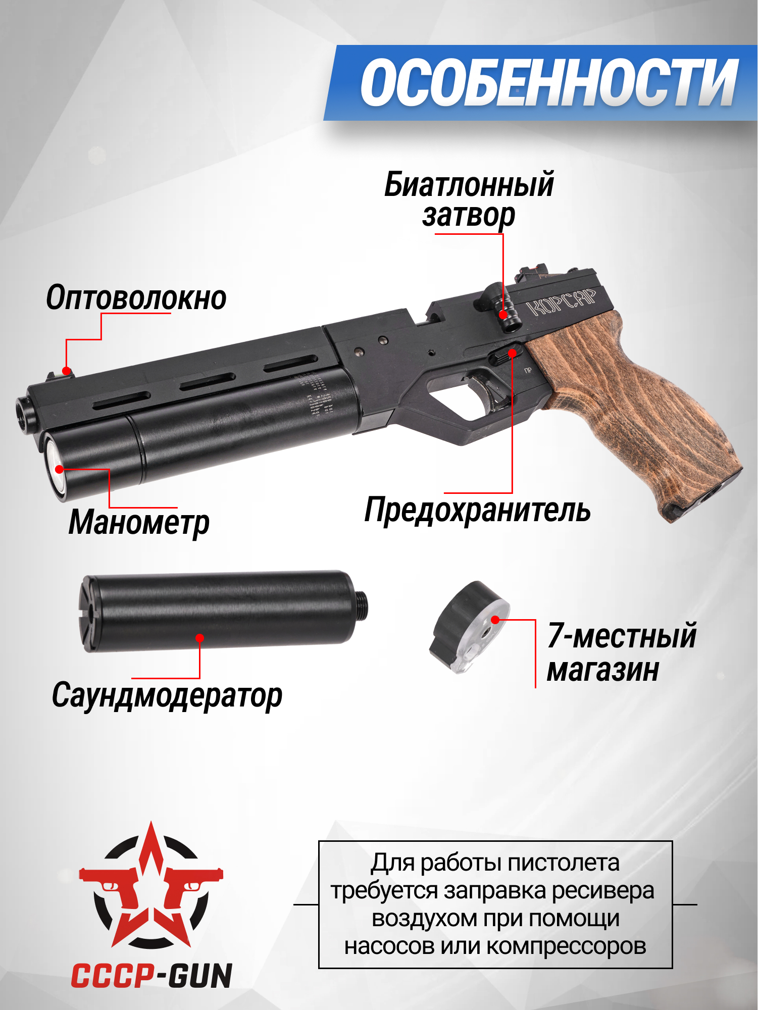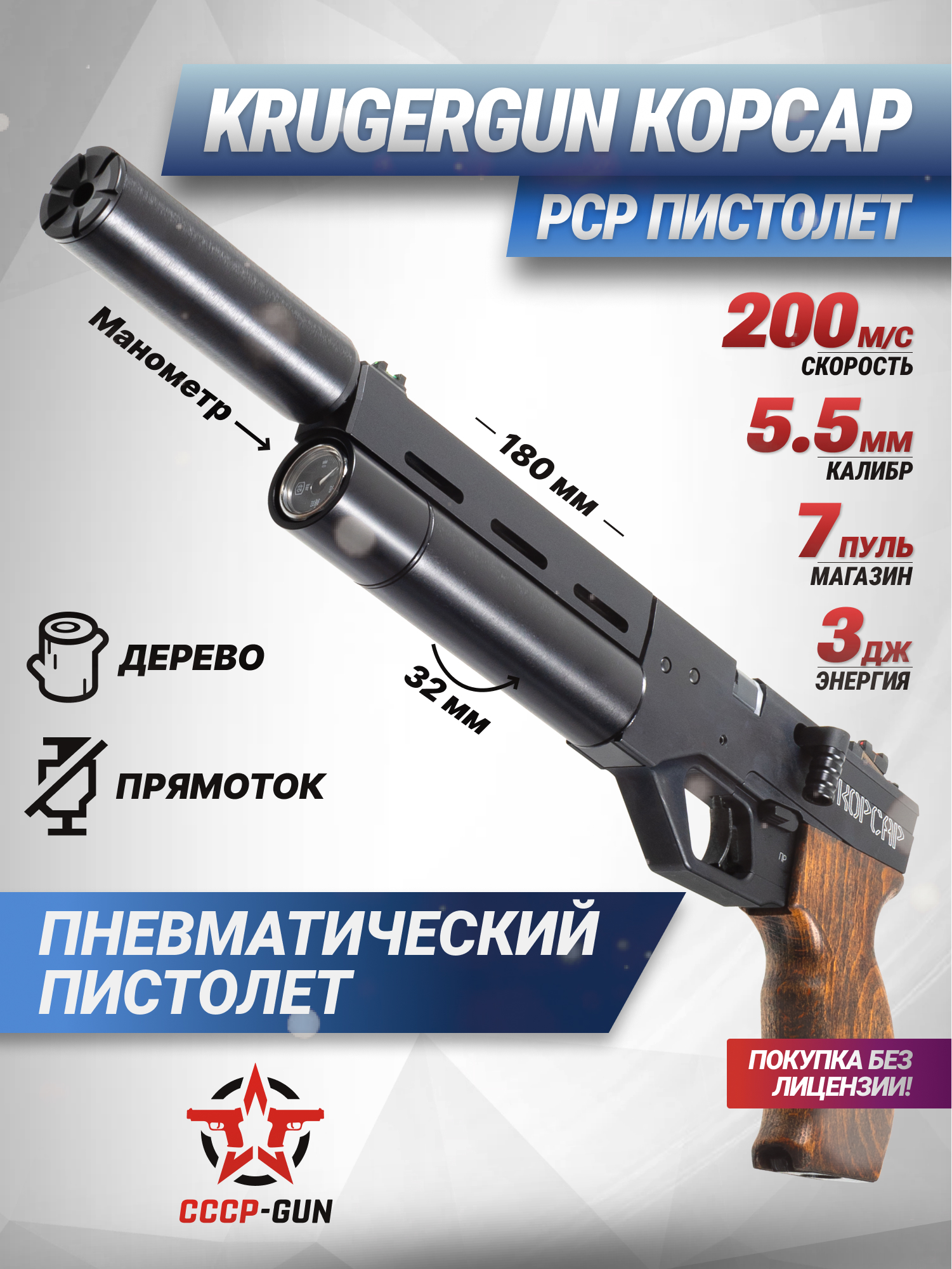 Чтобы сохранить возможность приобретать пневматический пистолет KrugerGun Корсар 5.5 мм без лицензии, изготовитель ограничивает его дульную энергию выстрела на значении не выше трех Джоулей, требуемом российским законодательством. Однако отмечается, что усиленные версии исполнения пневматики способны демонстрировать скорость движения пулевого снаряда в полете выше двухсот метров в секунду.