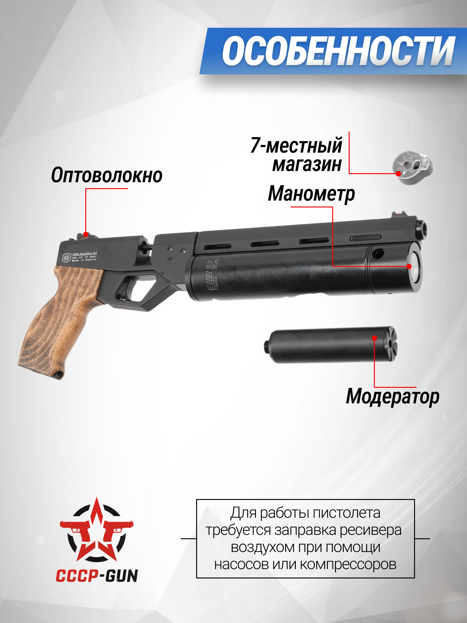 Пневматический пистолет KrugerGun Корсар 5.5 мм (240 мм, D32, редуктор, дерево, с манометром)