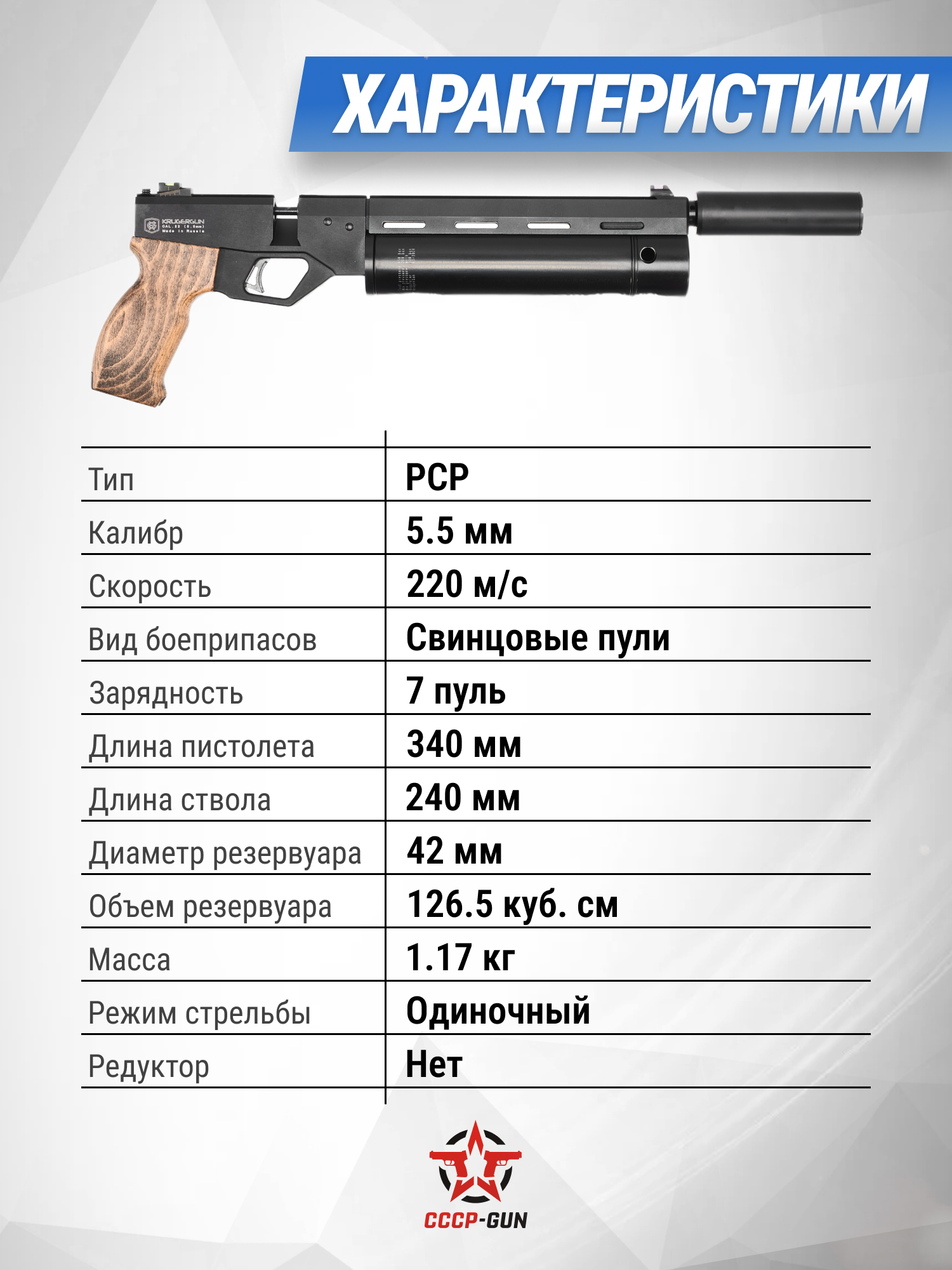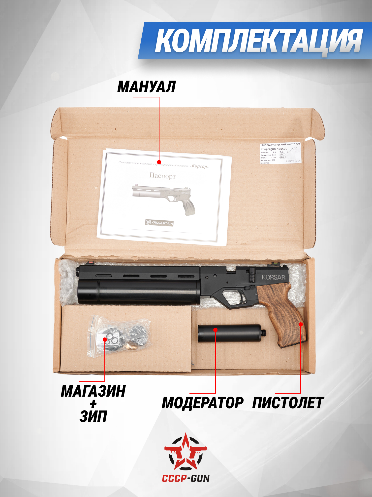 Пневматический пистолет KrugerGun Корсар 5.5 мм (240 мм, D32, редуктор, пластик, с манометром)