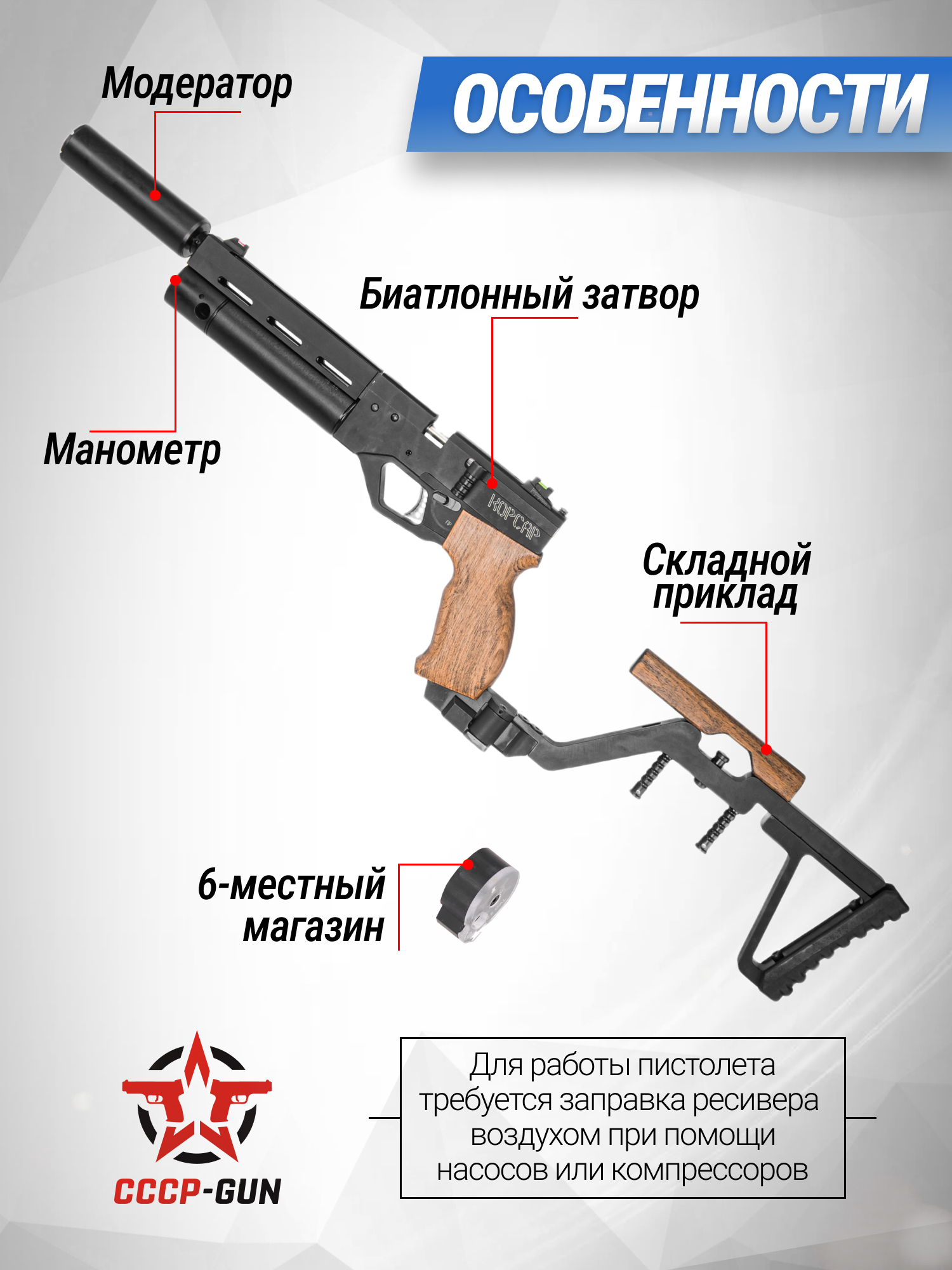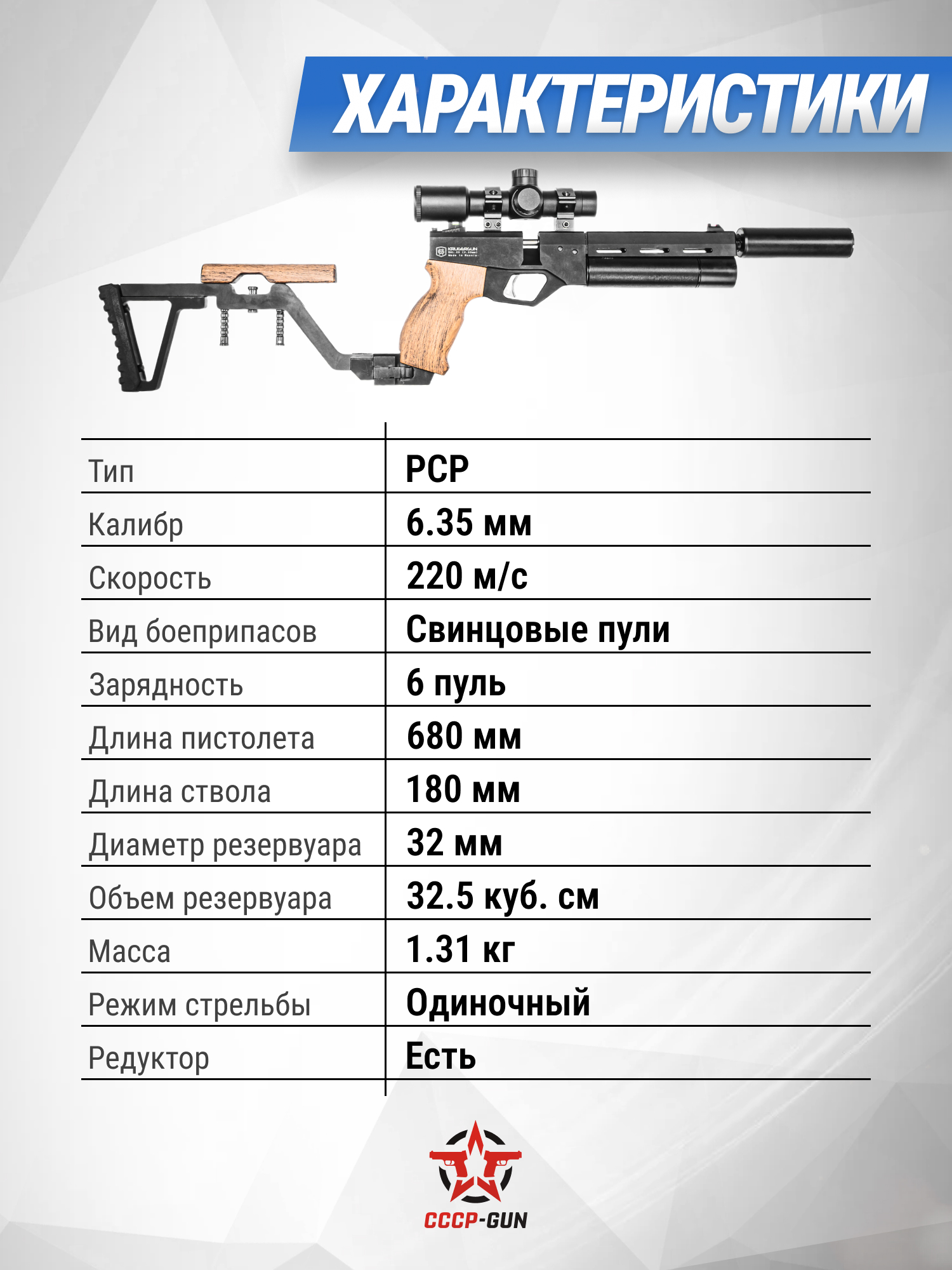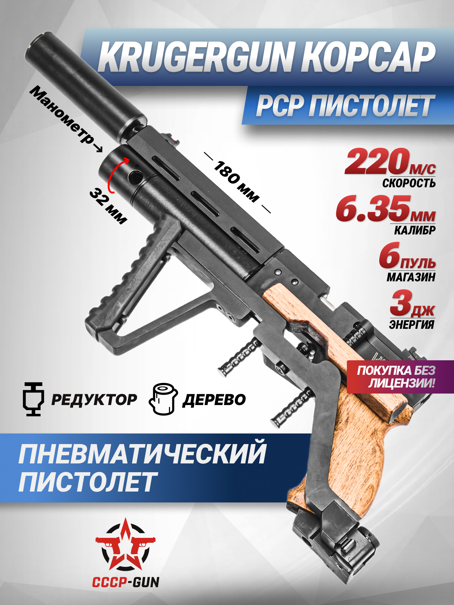 Пневматический пистолет KrugerGun Корсар 6.35 мм (240 мм, D42, приклад, редуктор, дерево, с манометром)