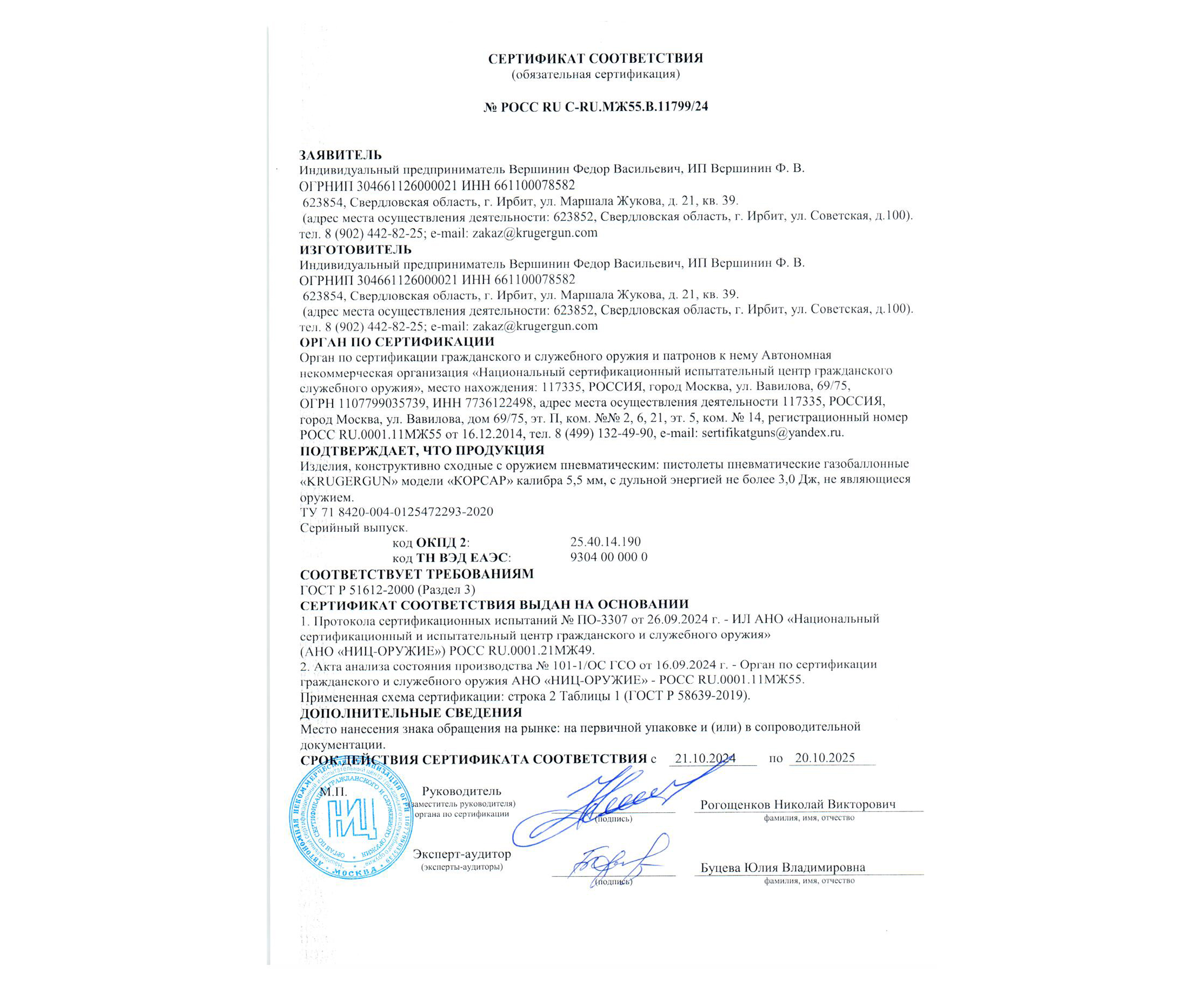 KrugerGun Корсар D32 Hunter Set 5.5 можно приобрести без оформления разрешения на оружие, так как мощность пневматики не превышает 3 Дж, что отвечает требованиям российского законодательства. Для закачки воздуха в подствольный резервуар, оснащенный встроенным манометром, рекомендуется использовать электрический компрессор. Инженеры отмечают, что рекомендуемое рабочее давление в изделии составляет 300 бар, а контролируется этот показатель при помощи манометра.