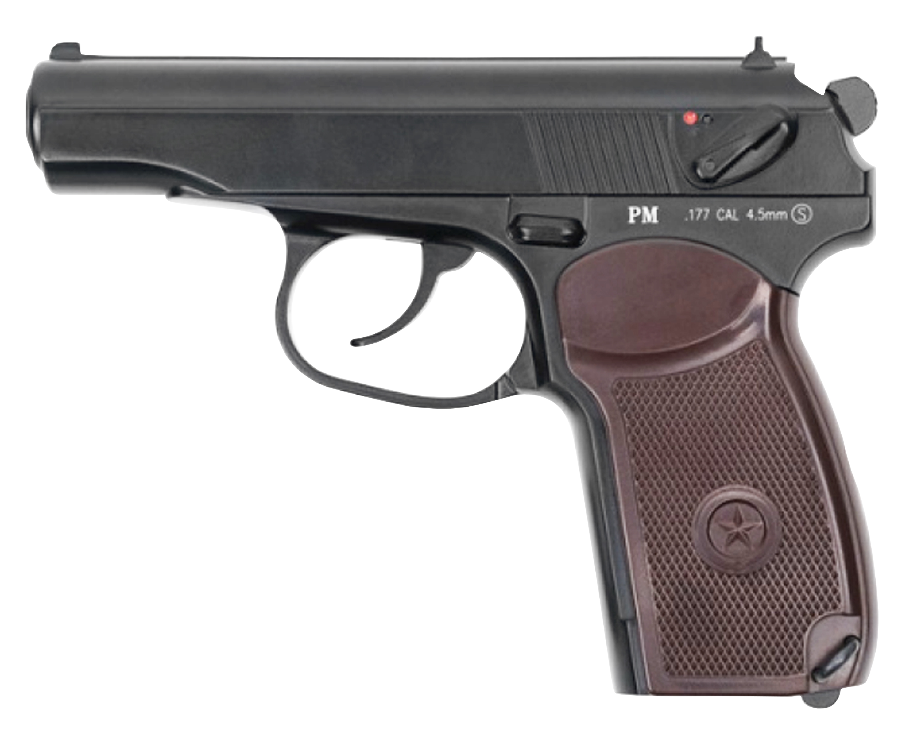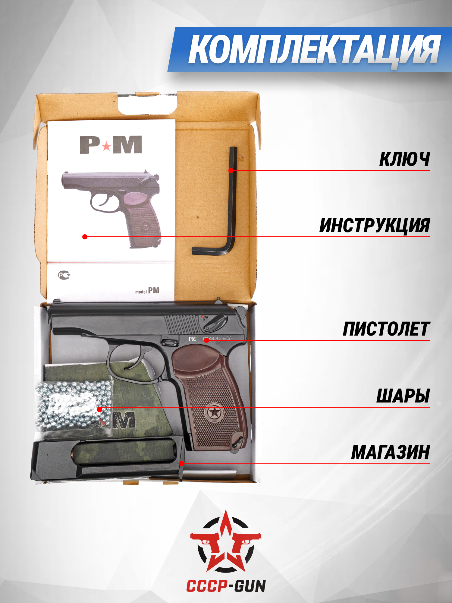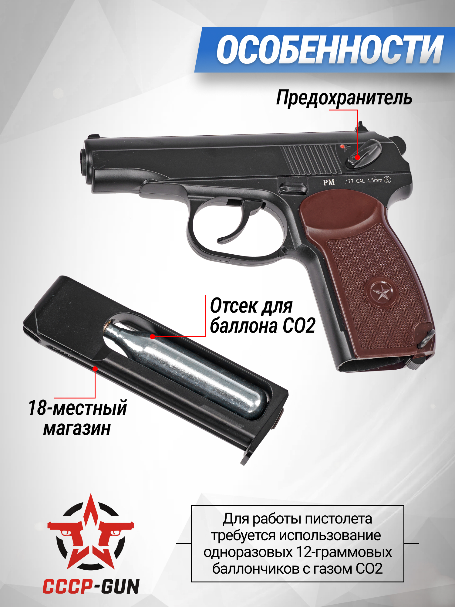 Разрабатывая обозреваемую модель, дизайнеры опирались на образ культового пистолета Макаров, детально повторив его внешний вид для повышения антуража. Указанное оружие известно по фильмам, сериалам и компьютерным играм, поэтому станет отличным дополнением в коллекцию многих людей увлекающихся стрелковой тематикой. Габариты обозреваемого пневматического варианта равны 160x130x30 мм, а масса отличается комфортным для активной стрельбы параметром в 0.78 кг.