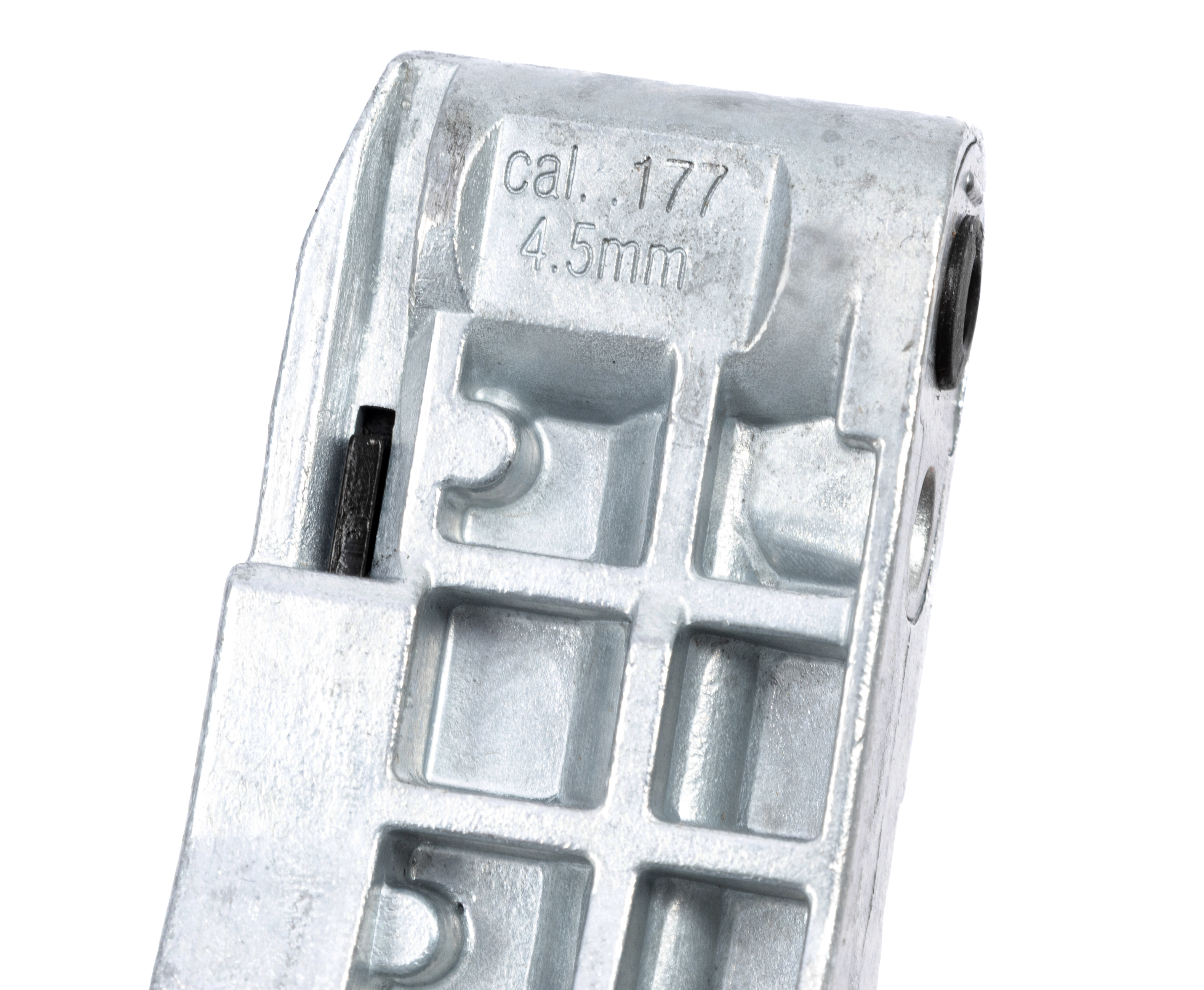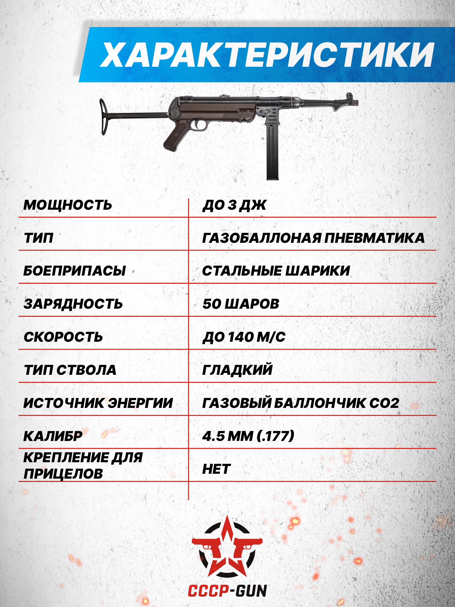 Платформа построена по принципу газобаллонной пневматики и применяет углекислый газ в стандартных 12-граммовых баллончиках. Для работы Умарекс MP-40 требуется два таких резервуара, которые устанавливаются в полноразмерный магазин вместе с боезапасом. При этом емкость элемента боепитания вмещает 50 стальных шариков диаметра 4.5 мм, что гарантирует продолжительную стрельбу без необходимости частой перезарядки.