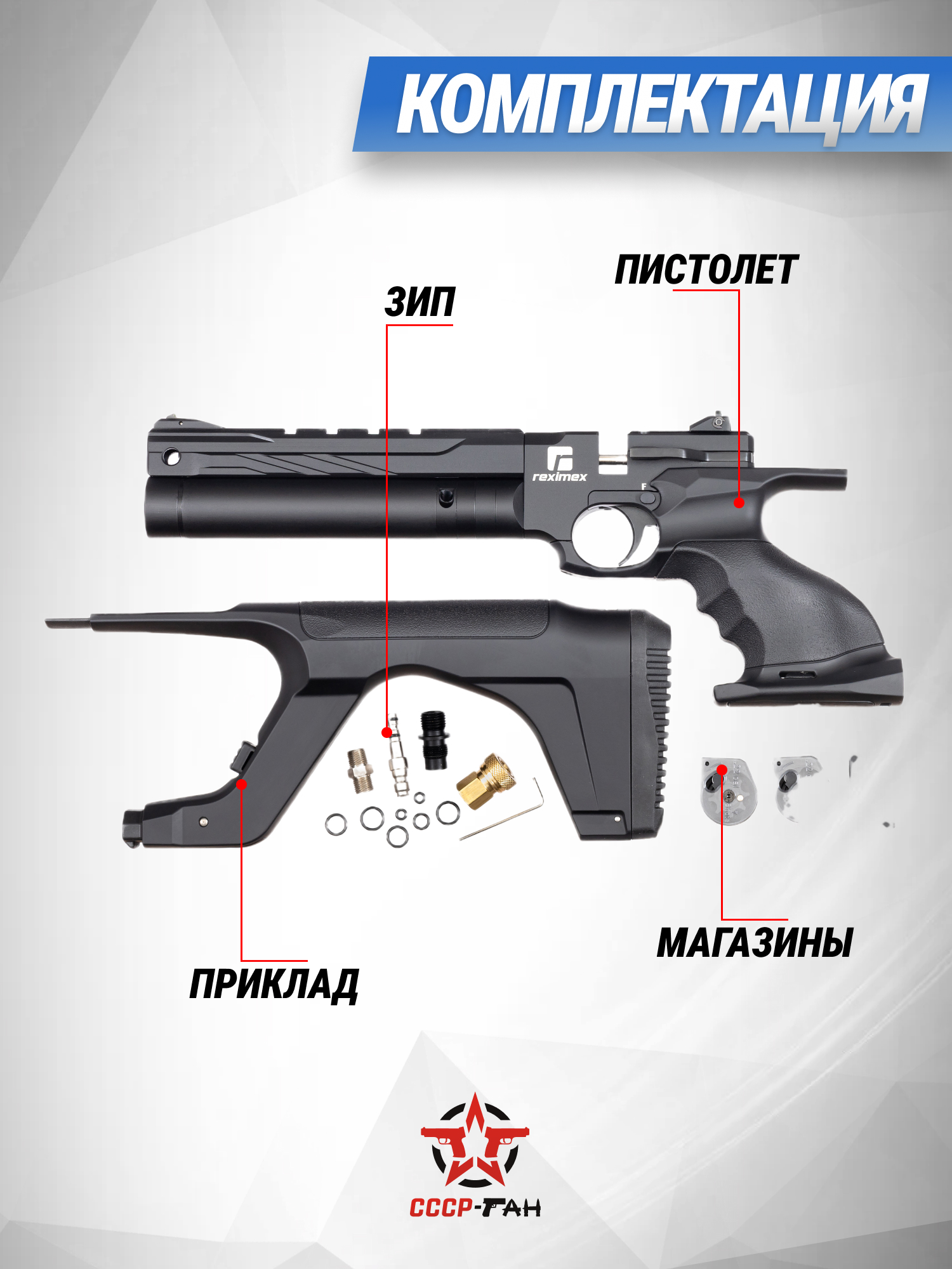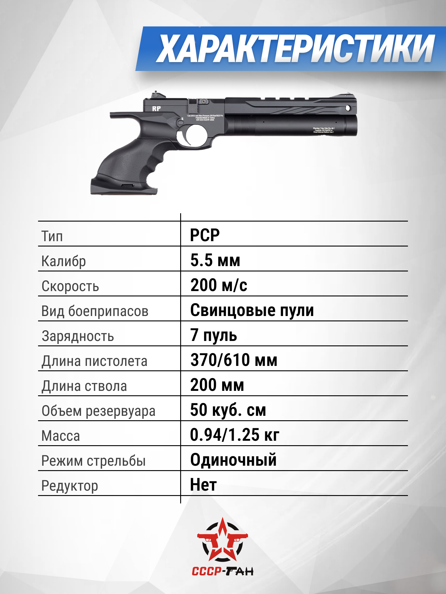 Представленная модель Reximex RP 5.5 выделяется футуристичным дизайном, что обусловлено модернизацией привычной формы в сторону повышения эргономики оружия. Поскольку материалом корпуса выступает металлический сплав, а ортопедическая рукоять изготовлена из ударостойкого полимера, полная масса изделия снижена до 0.94 кг. Длина пистолета составляет 330 миллиметров, а за счет комплектного быстросъемного приклада этот показатель может увеличиться до 610 миллиметров, делая из обозреваемой пневматики компактный карабин.