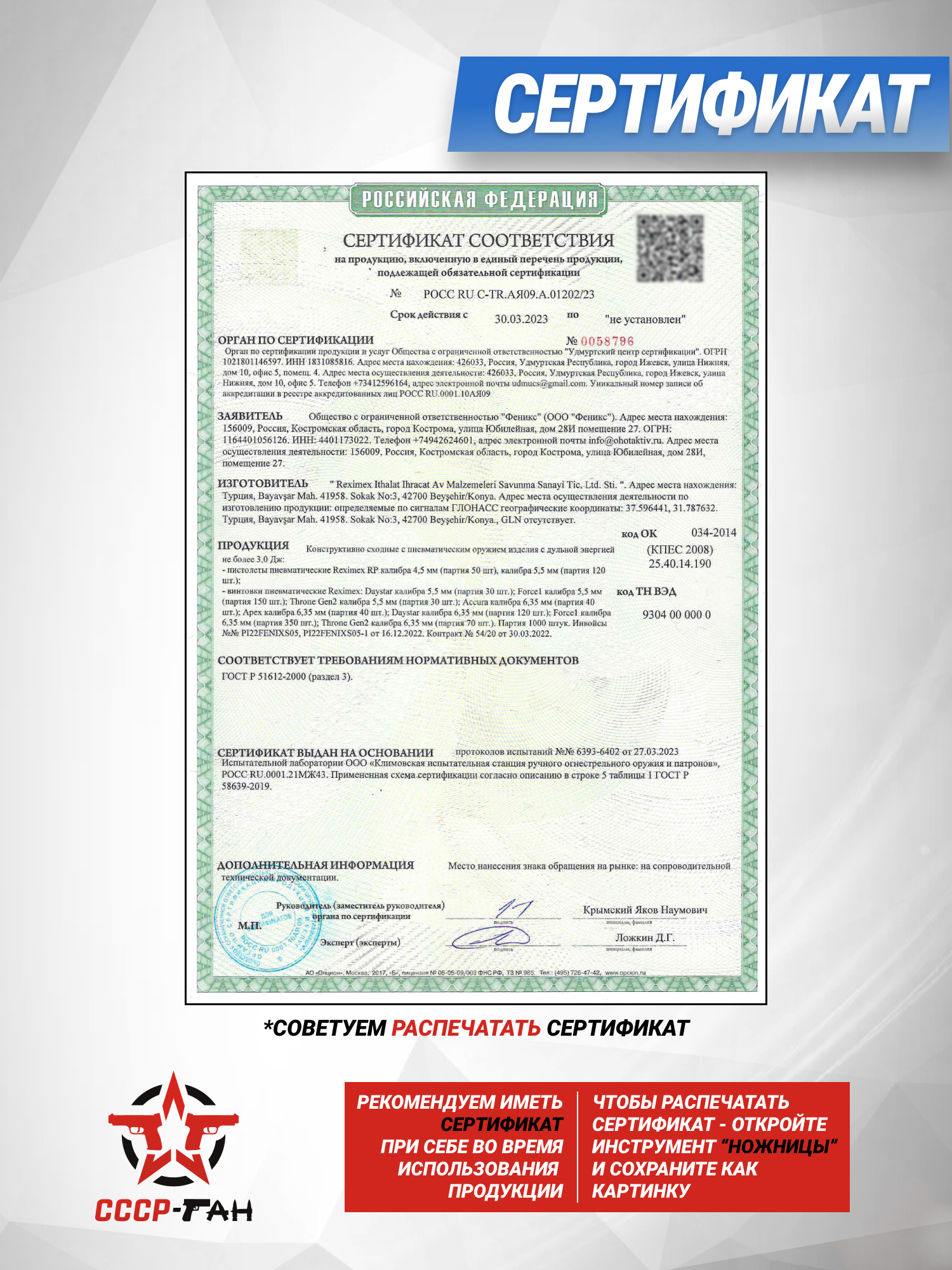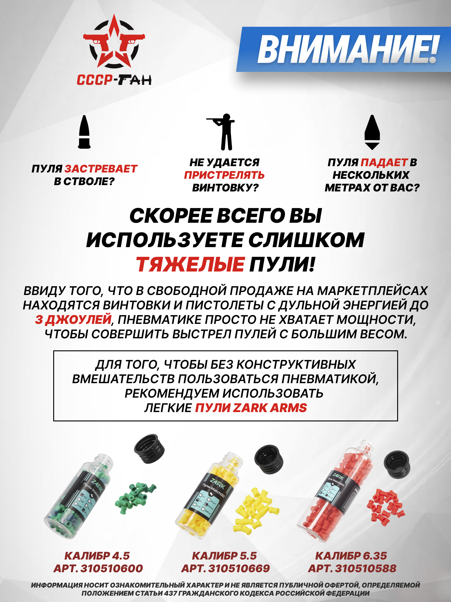 Внимание! Данная модель поставляется в разрешенной мощности для свободного приобретения на территории Российской Федерации. При этом в модели имеется возможность увеличения мощности путем замены части деталей или настройки конструкции, однако не стоит забывать о Федеральном законе «Об оружии» № 150 - ФЗ. В случае необходимости, опираясь на данный закон и руководствуясь им, возможно, потребуется получить разрешение от ЛЛР ГУ МВД России после вмешательства в конструкцию.