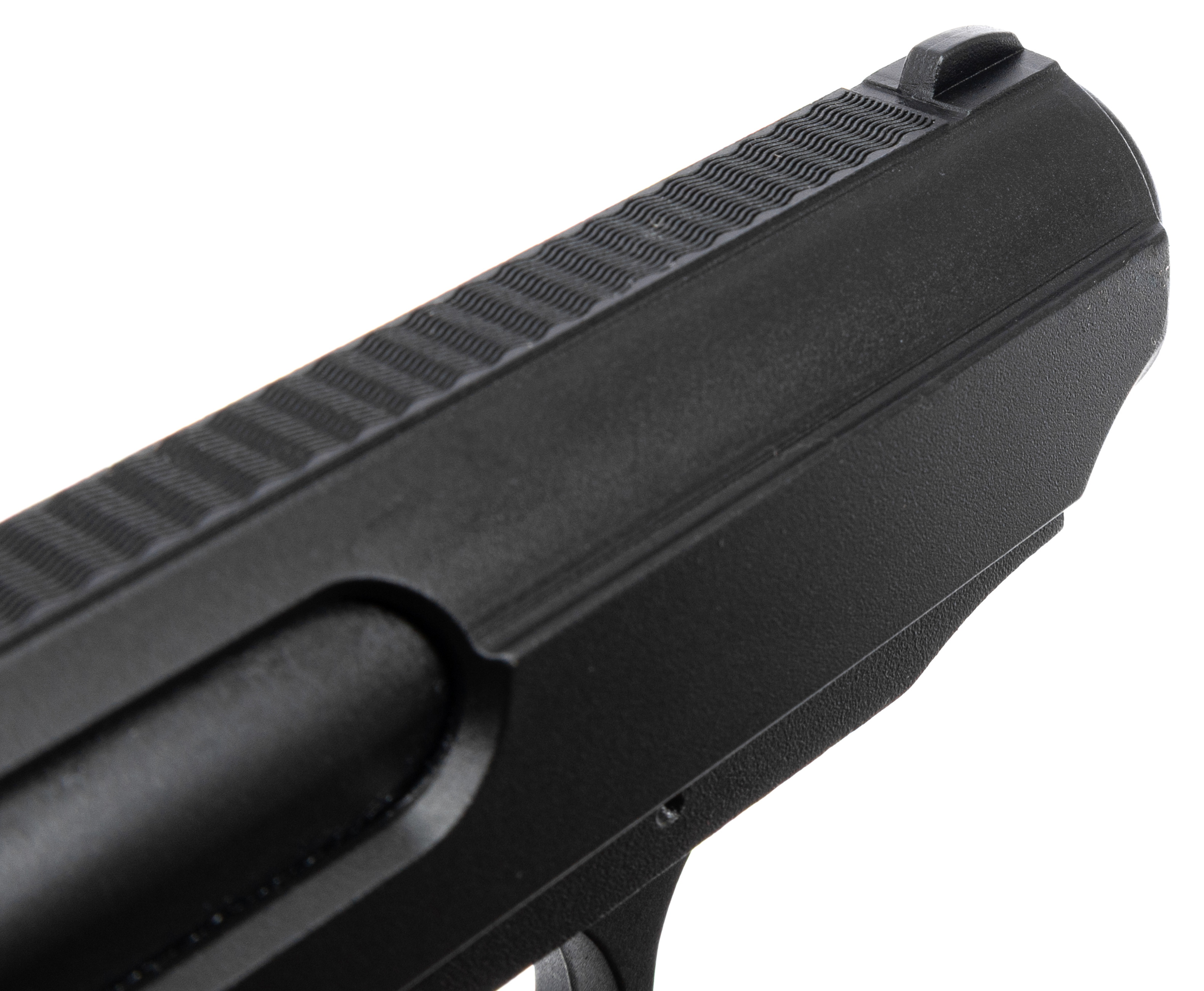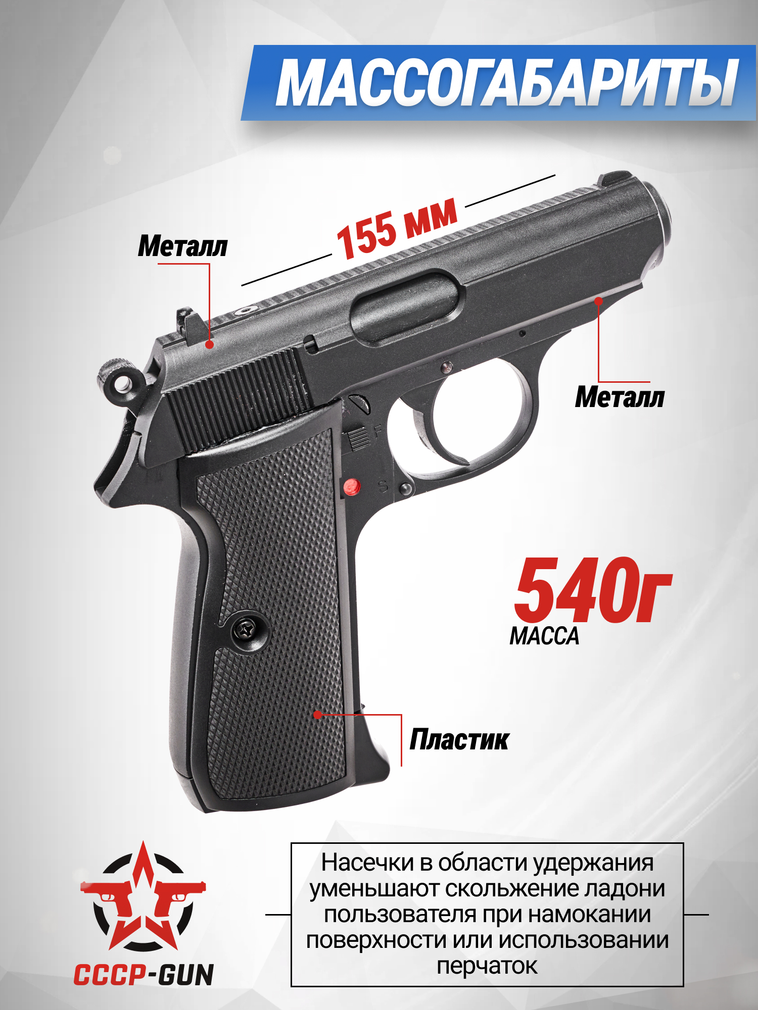 Пневматика изготавливается из металла, поэтому изделие характеризуется повышенной прочностью и приближенными массогабаритными характеристиками к боевой модели. Вес пистолета составляет 0.54 кг с учетом полной длины в 155 мм. Для повышения комфорта во время хвата изделия на рукояти предусмотрены полимерные накладки с противоскользящей шероховатой поверхностью.