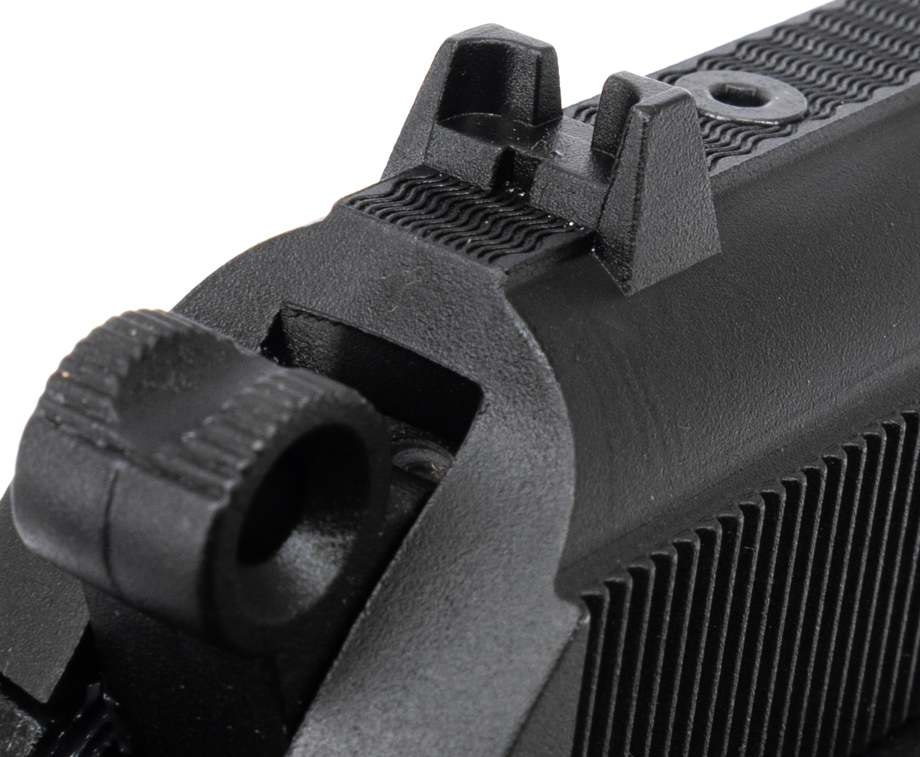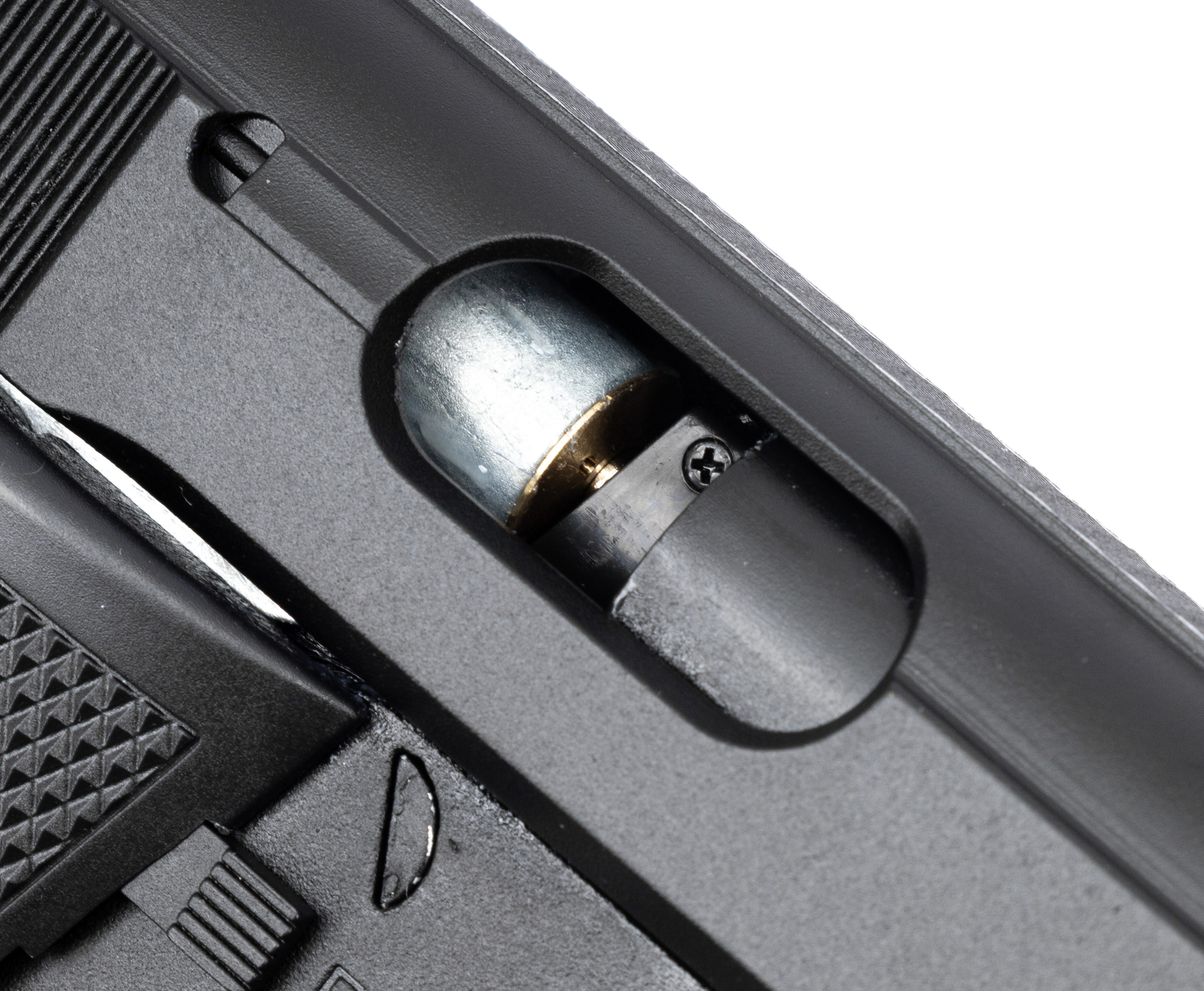 Наводиться по мишеням помогут механические прицельные приспособления в виде литых мушки и целика, находящиеся на затворной раме. Боеприпасами в обозреваемой модели выступают сферические стальные пули калибра 0.177 дюйма, которые заряжаются в компактный магазин на 15 единиц снарядов. Для перезарядки указанный картридж извлекается при нажатии на кнопку, спроектированную с левой стороны корпуса пистолета.