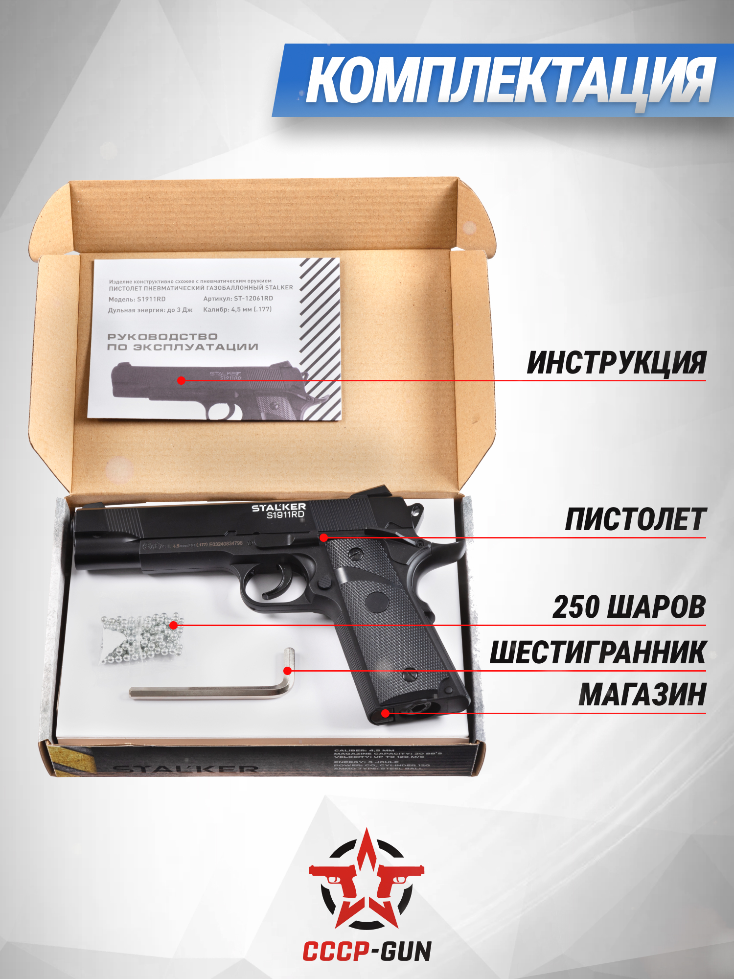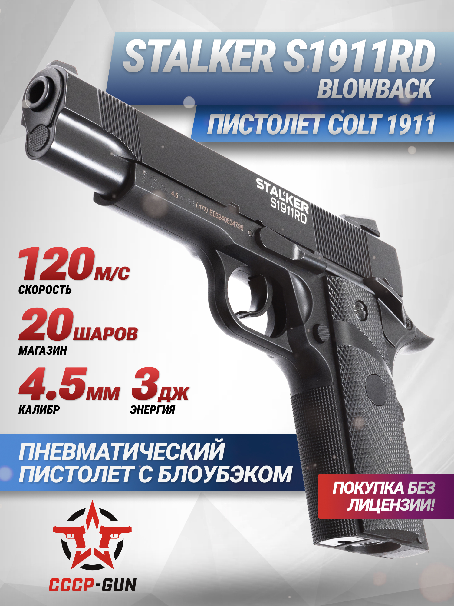 Модель Сталкер S1911RD считается довольно точной пневматикой, которая способна разгонять снаряд до скорости в 120 метров в секунду. Благодаря этому пистолет может использоваться не только как развлекательное, но и как учебное устройство для тренировки начинающих стрелков. Важно отметить, что продается изделие в свободном доступе, потому что его дульная энергия не превышает 3 Джоулей, а по закону для покупки подобных экземпляров от пользователя требуется только паспорт, который подтверждает совершеннолетие гражданина.