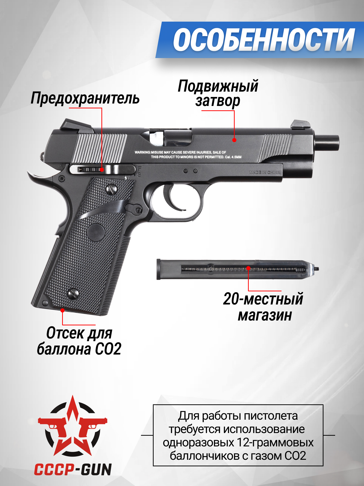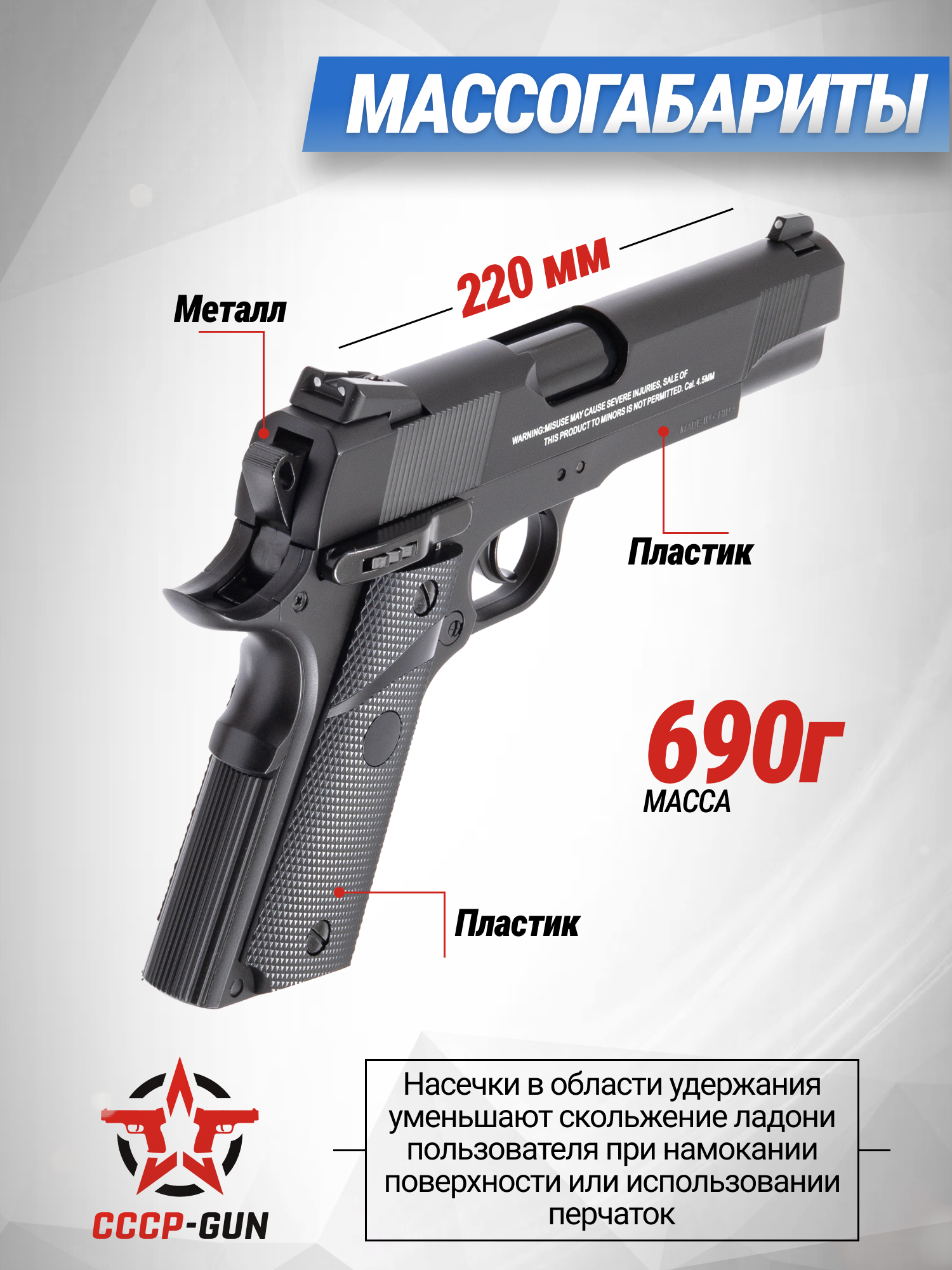 Поскольку при проектировке представленной пневматики инженеры брали за основу образ пистолета Colt M1911, размеры изделия равны 22 сантиметрам. Этот огнестрельный экземпляр укоренился в культуре, так как демонстрируется в фильмах, сериалах и компьютерных играх. Ввиду того, что затворная рама выполнена из сплава, а все остальные части корпуса из прочного полимера вес модели составляет 0.68 килограмма.