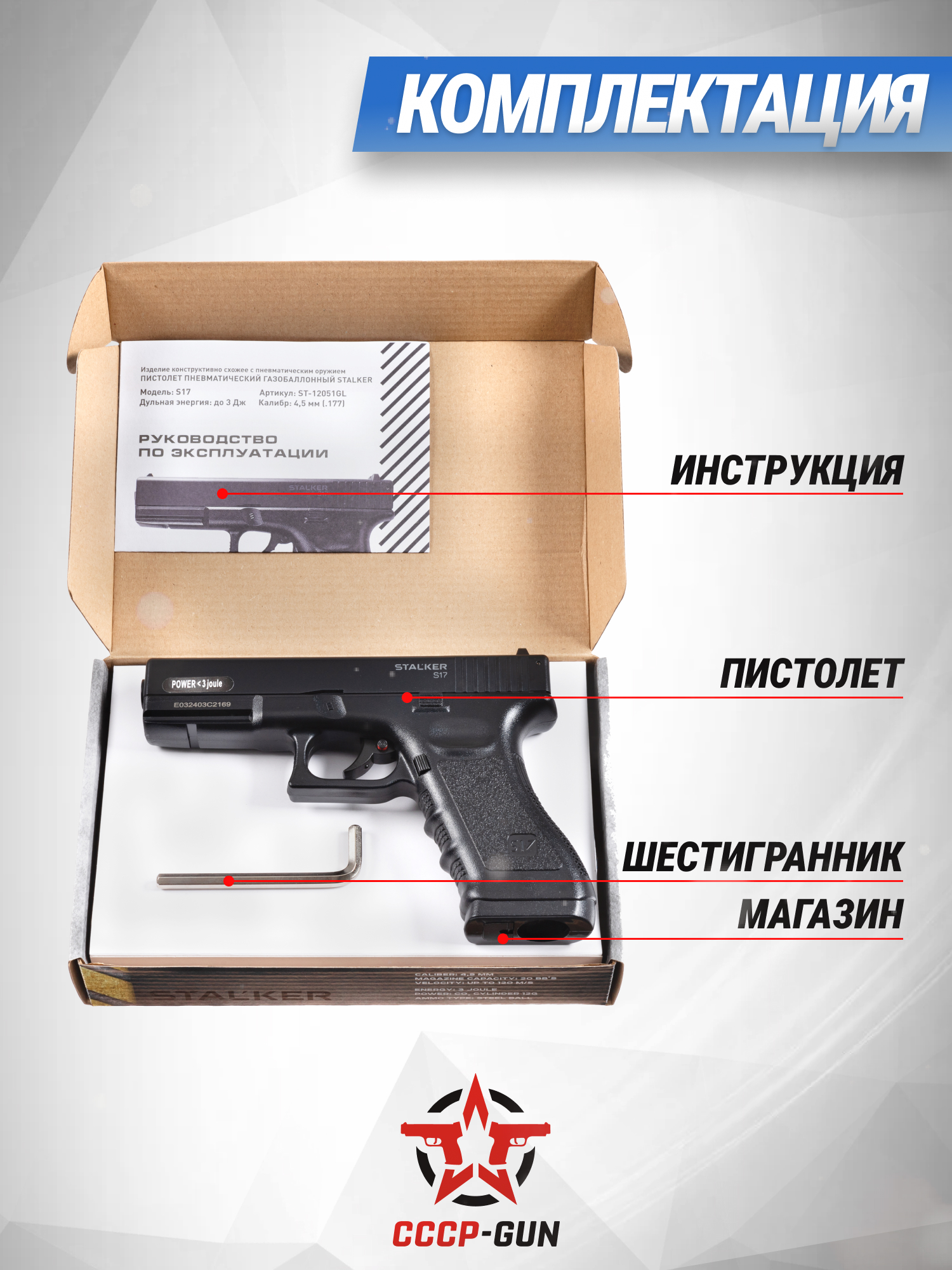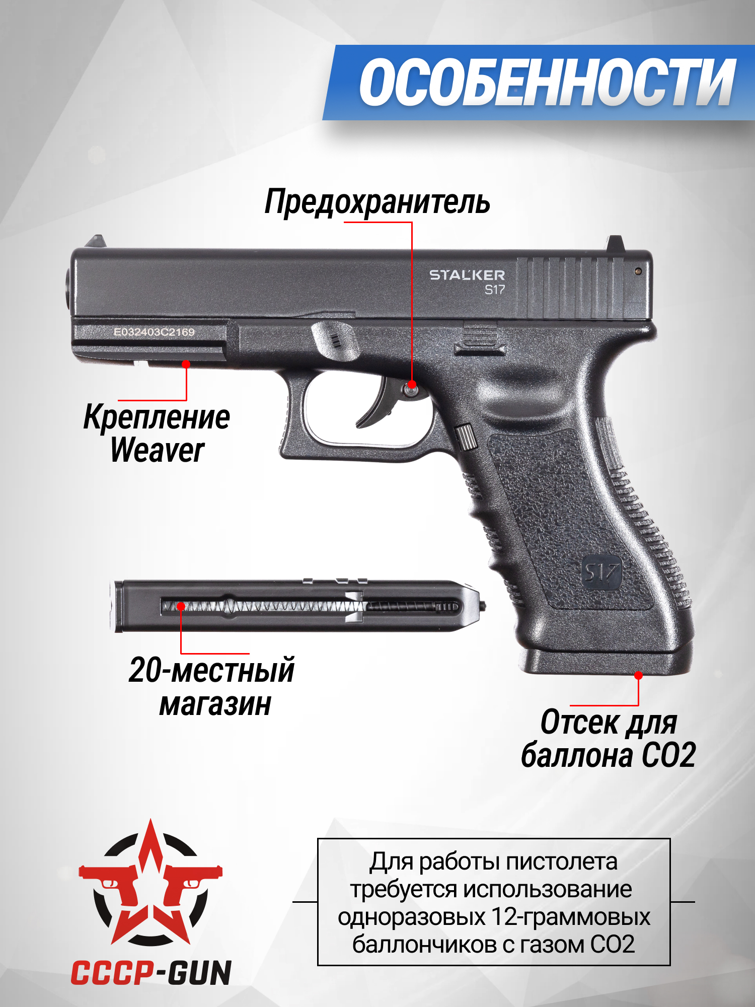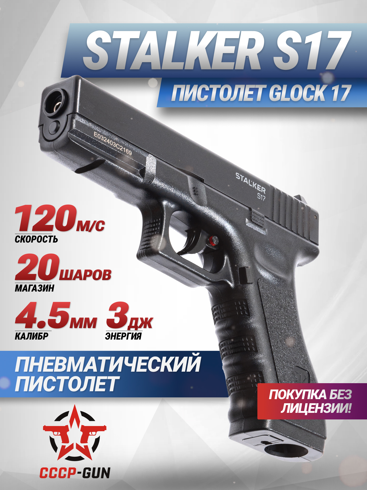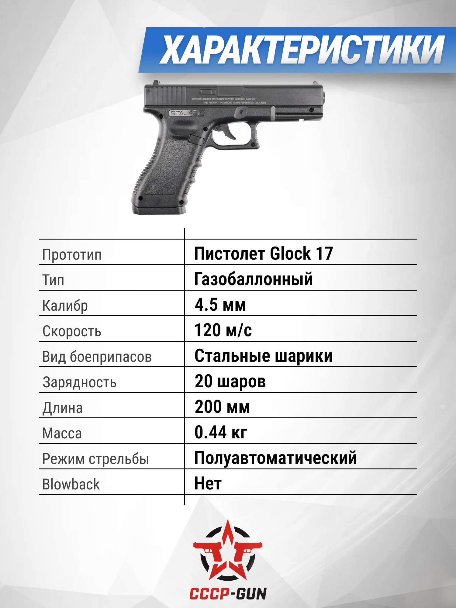 Stalker S17 Glock ST-12051GL стреляет в полуавтоматическом режиме распространенными боеприпасами в виде стальных шариков с калибром 4.5 миллиметров. Перед стрельбой снаряды в количестве двадцати штук заряжаются в компактный магазин, для извлечения которого используется классическая кнопка сброса на рукояти. Приятным бонусом станет то, что в набор производитель добавил пакет на 250 шариков.