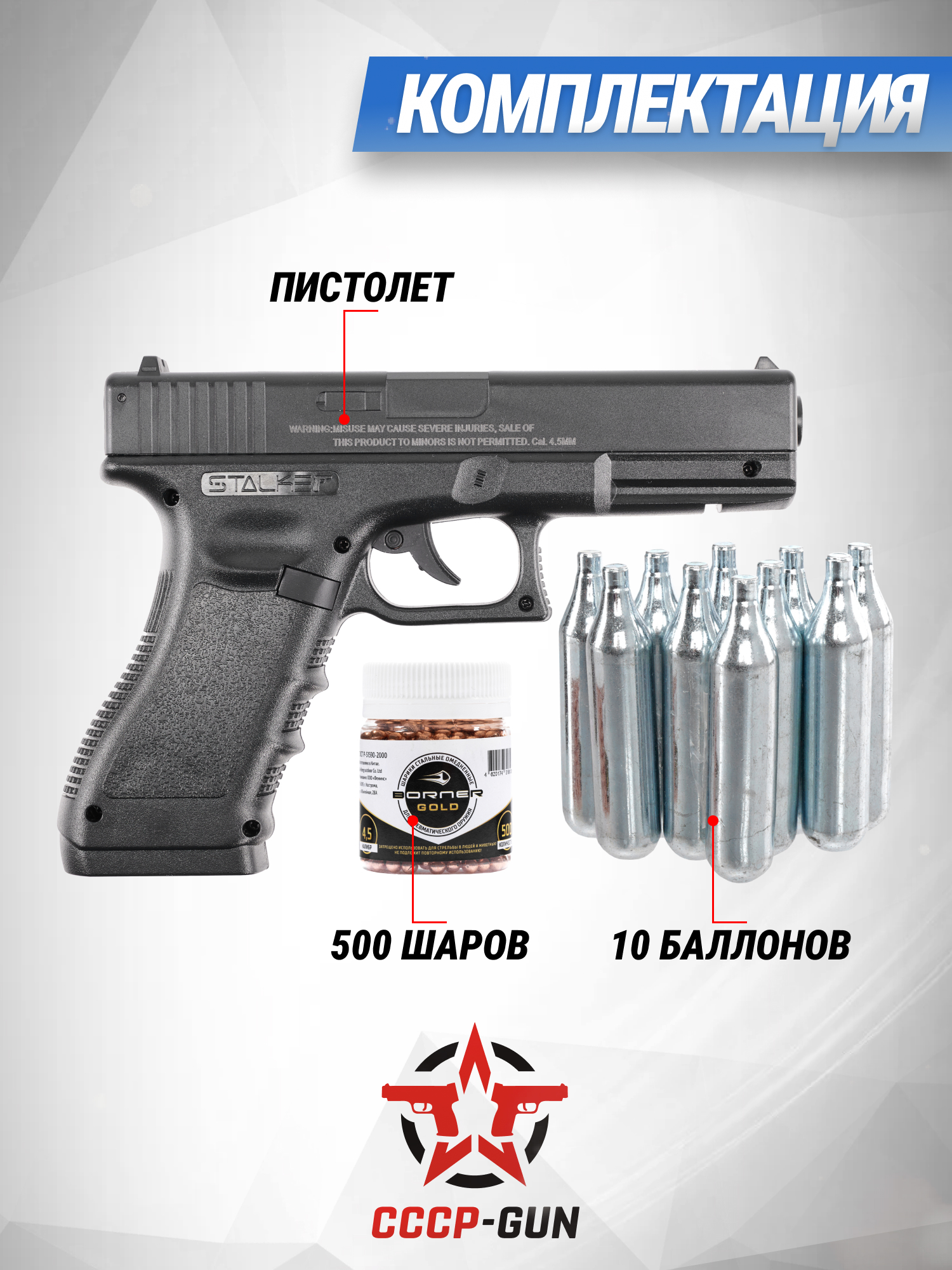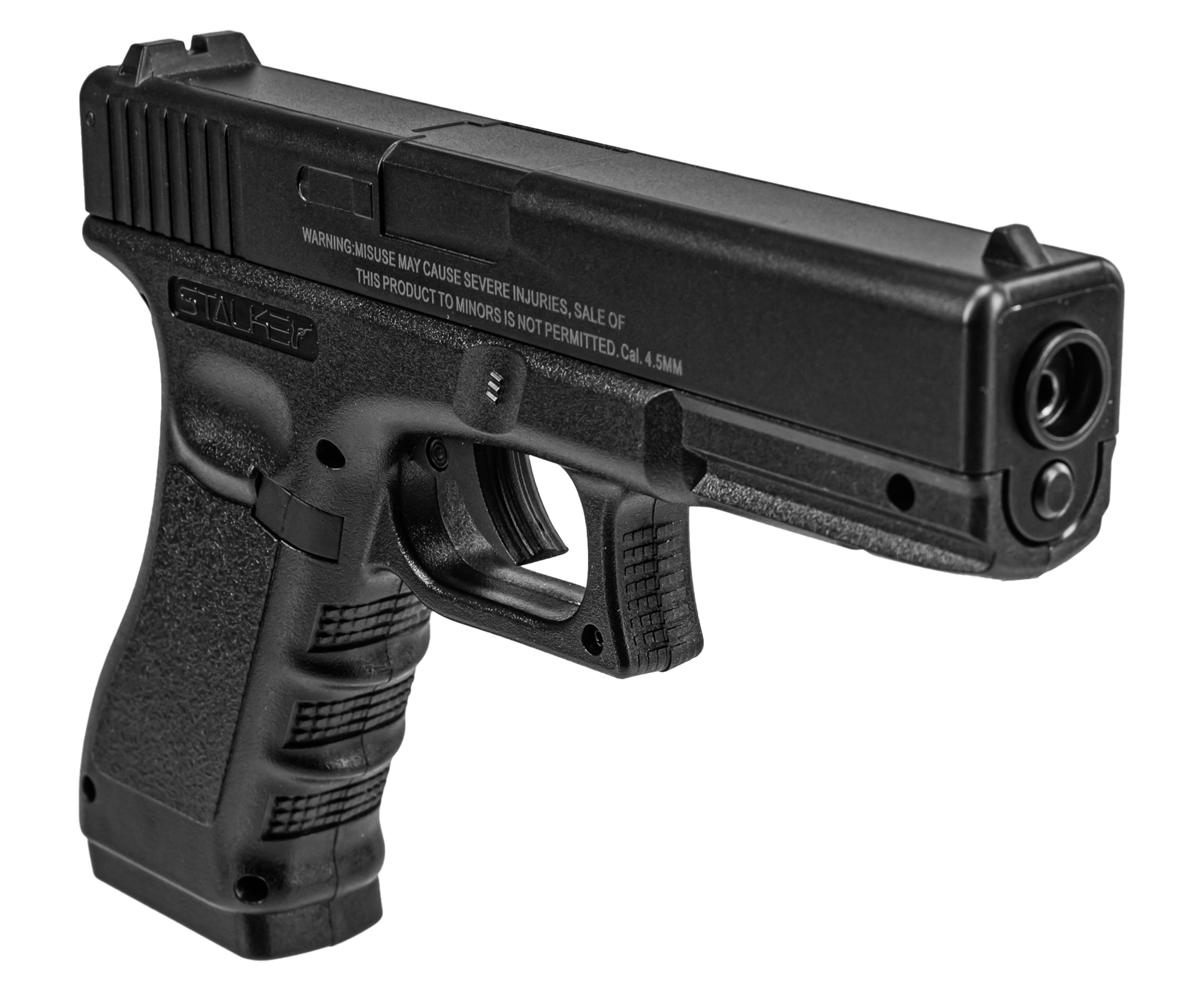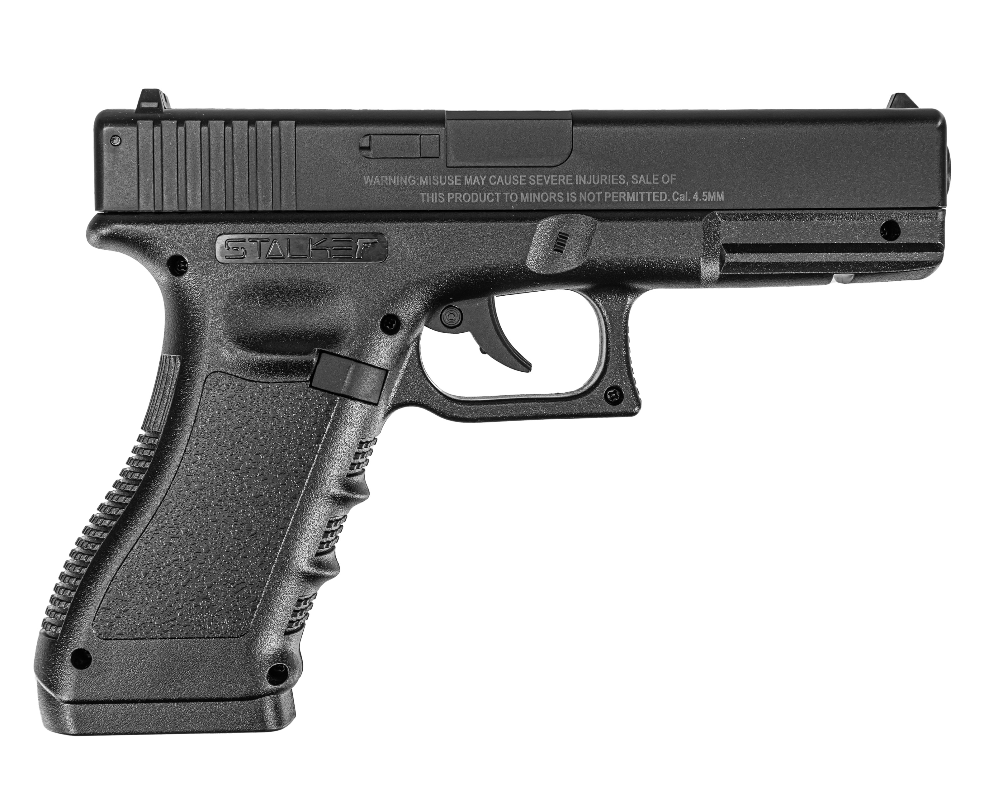 Пневматический пистолет Сталкер Глок использует шарики из стали калибра 4.5 мм. Выступающий элементом боепитания емкий магазин вмещает 20 снарядов. В комплекте поставляется упаковка из 500 штук совместимых боеприпасов, владельцу не придется докупать расходники отдельно.