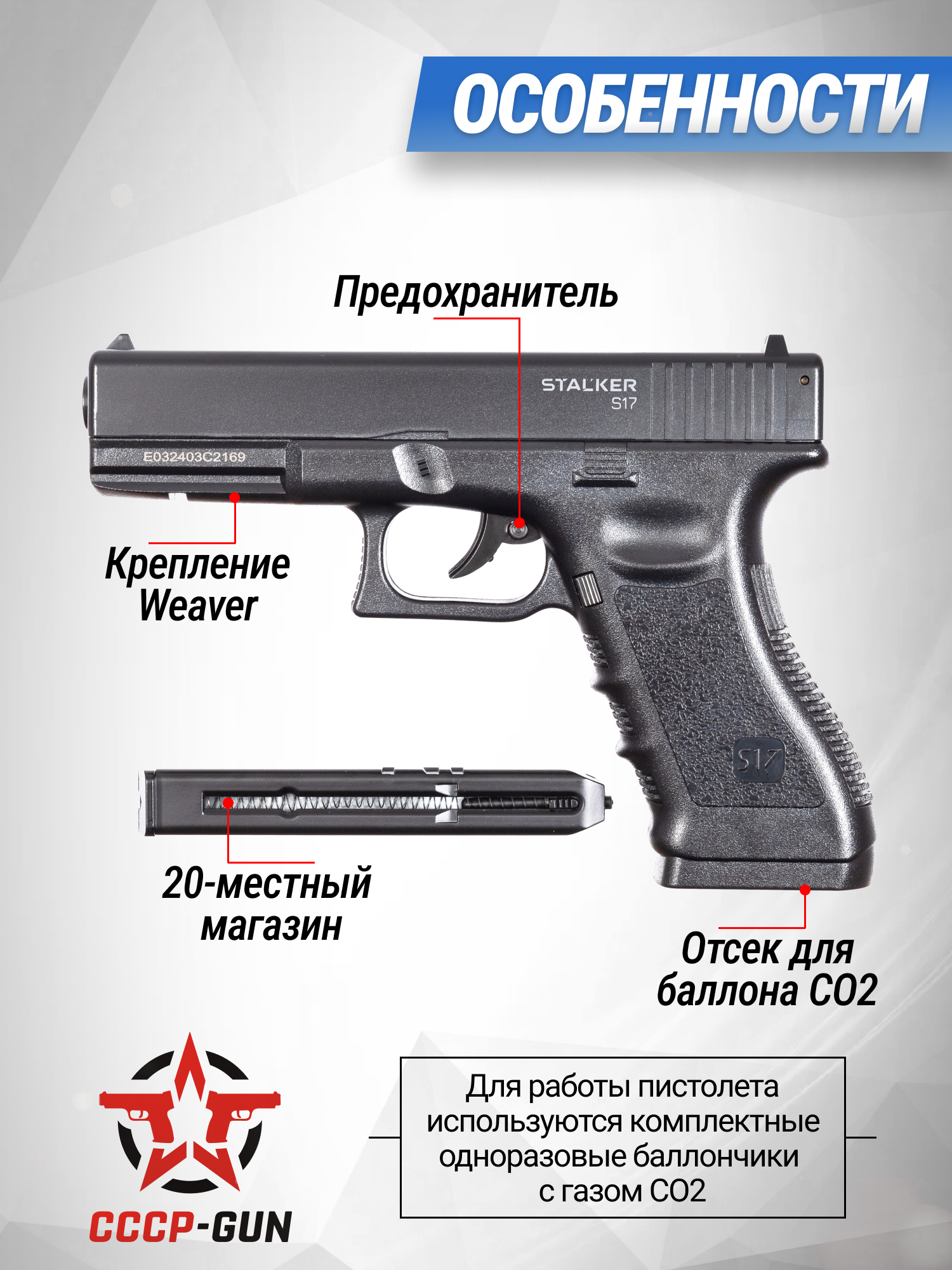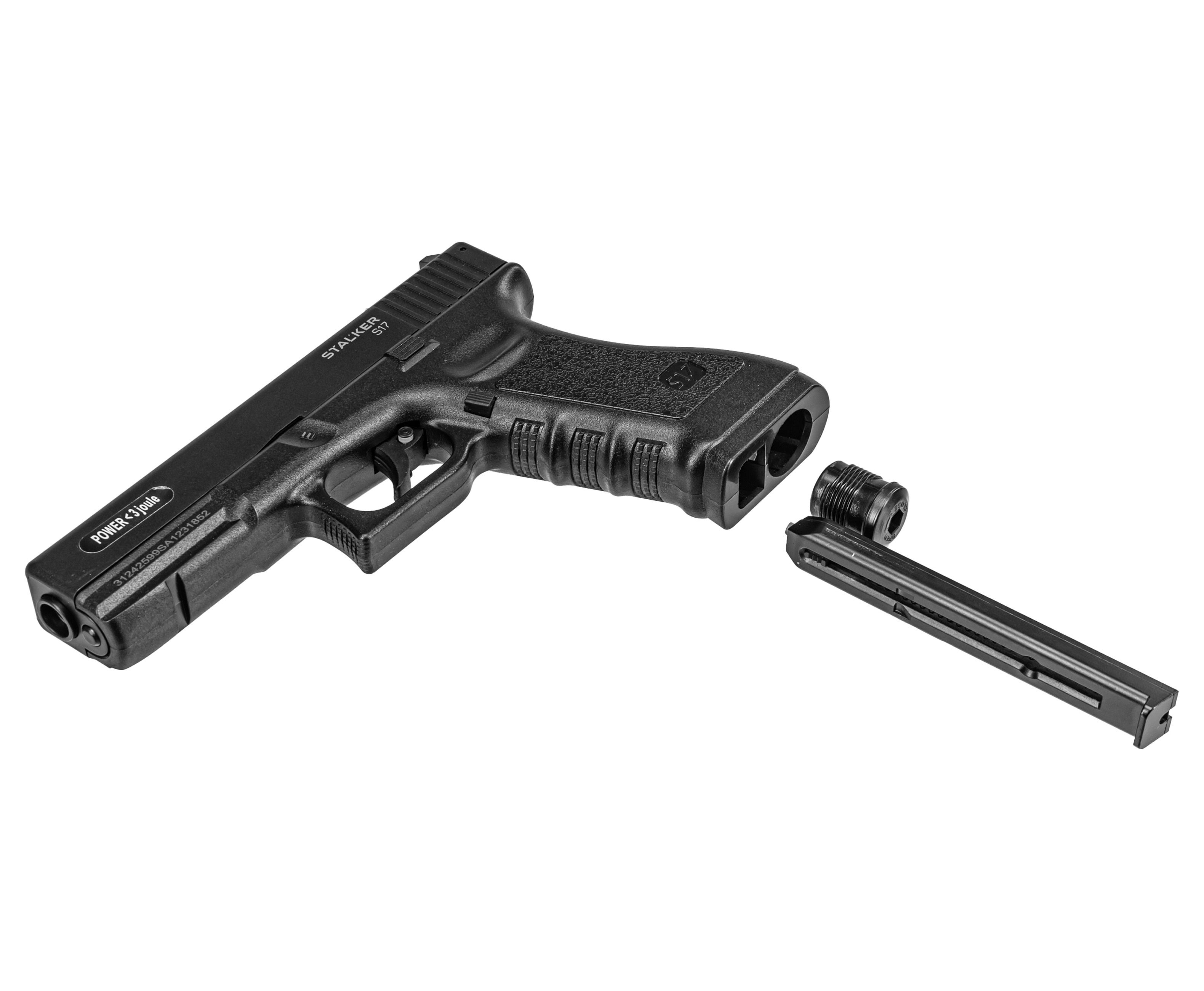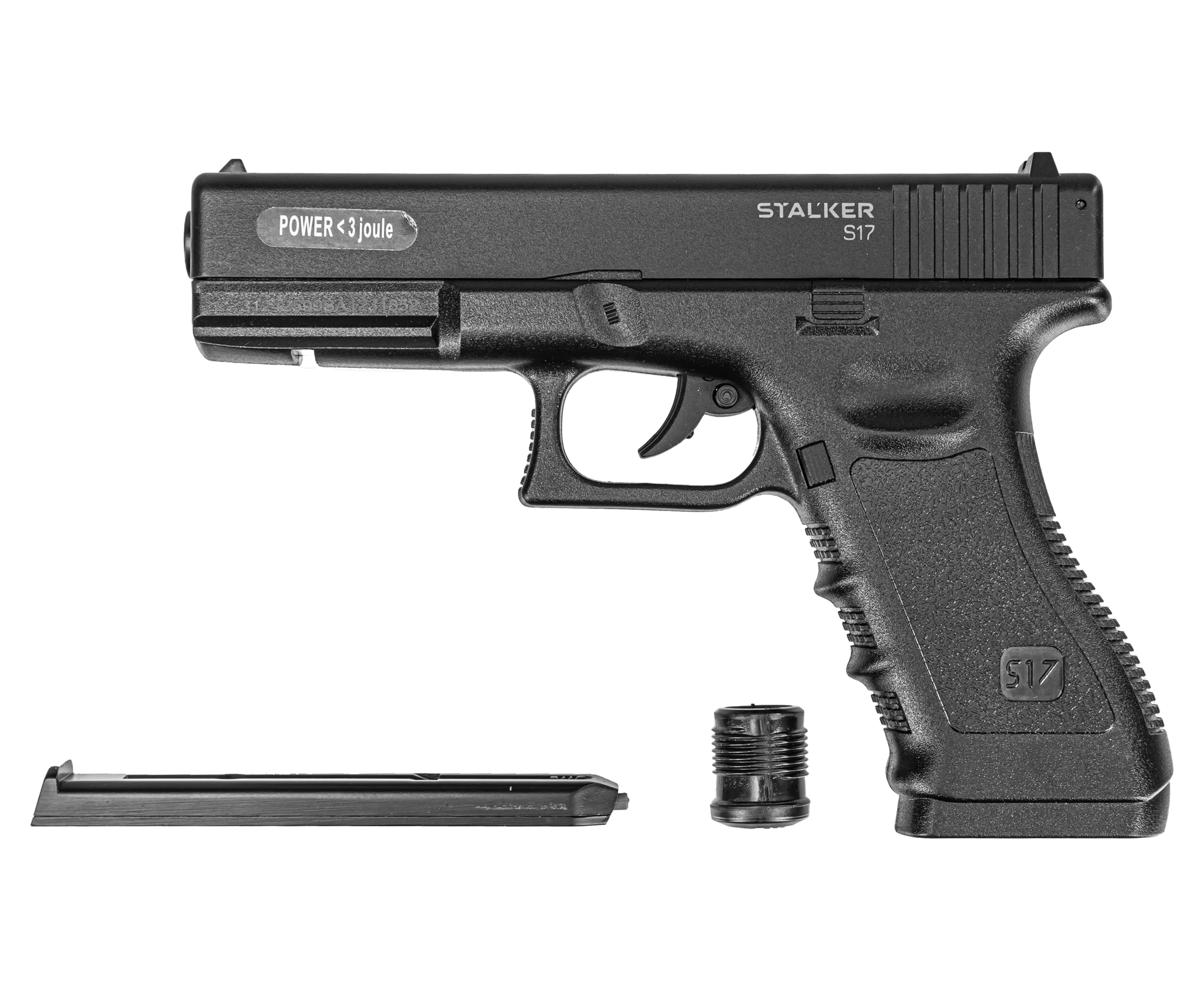 Пневматический пистолет Stalker S17 Glock 17 изготовлен по газобаллонной схеме. Стандартные резервуары CO2 объемом 12 грамм обеспечивают бесперебойное питание механизма, они устанавливаются в рукоять, отдельно от магазина. Комплект включает 10 штук баллончиков с углекислотой, которых хватит на несколько продолжительных тренировок или выезда на открытое стрельбище.