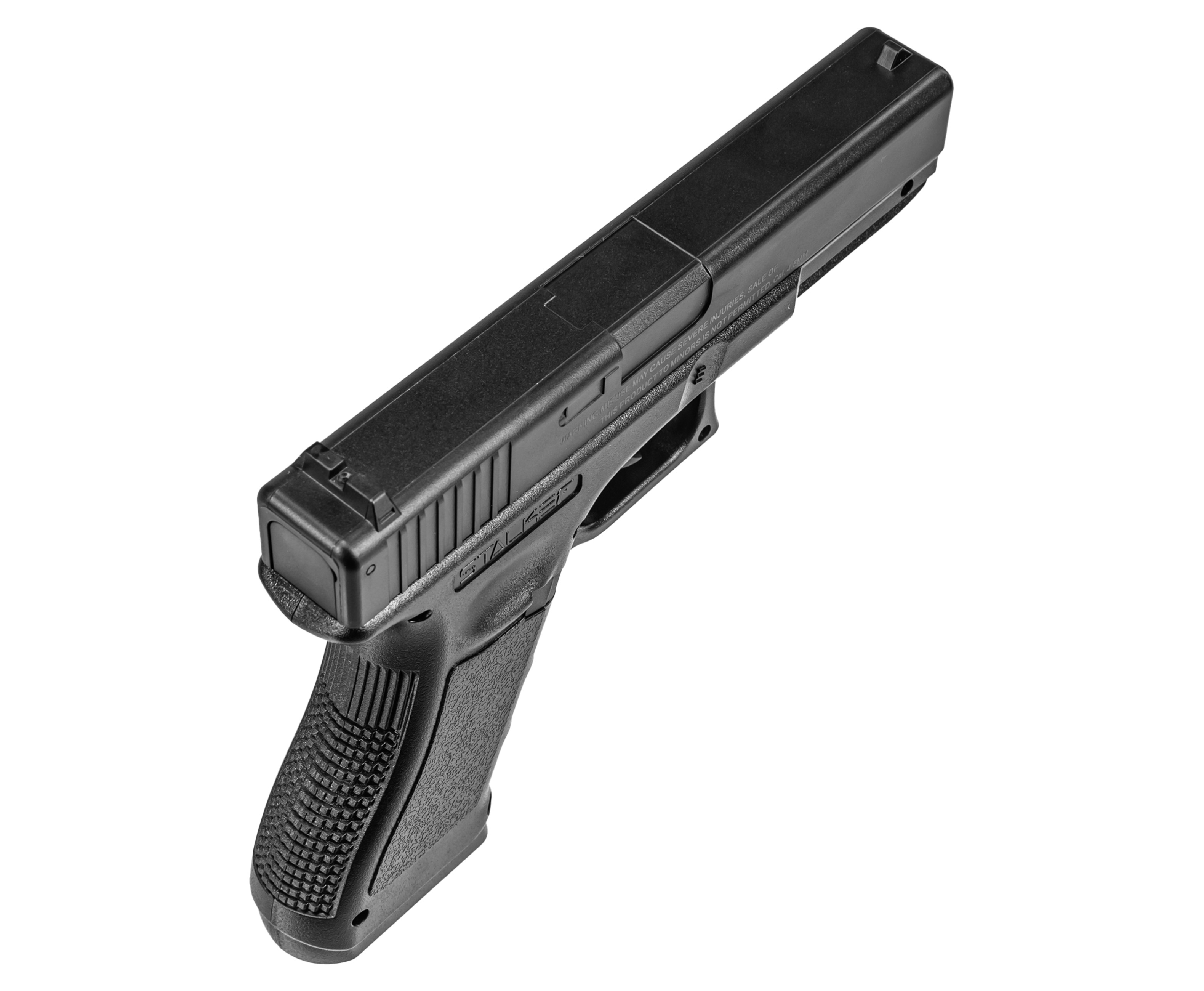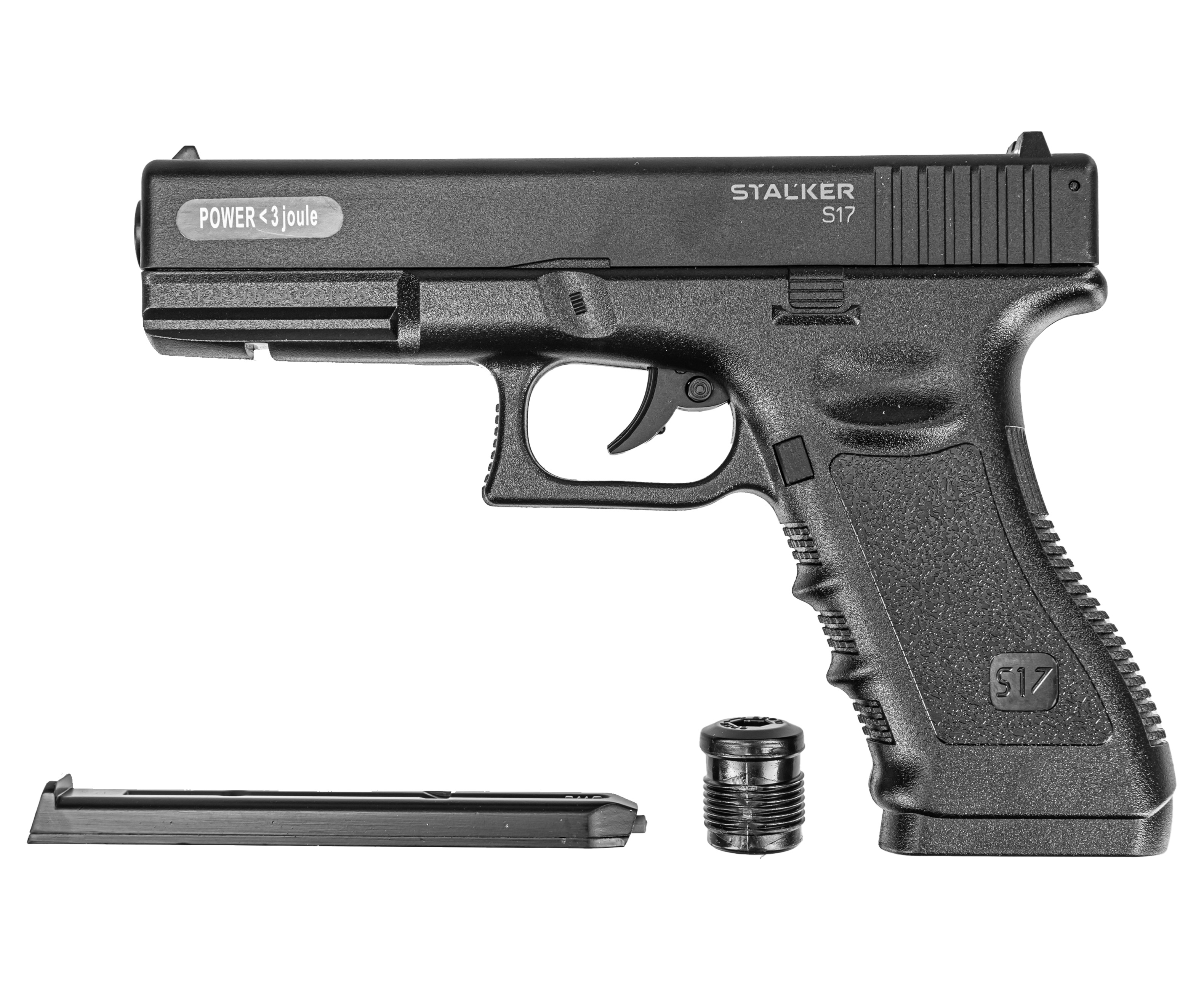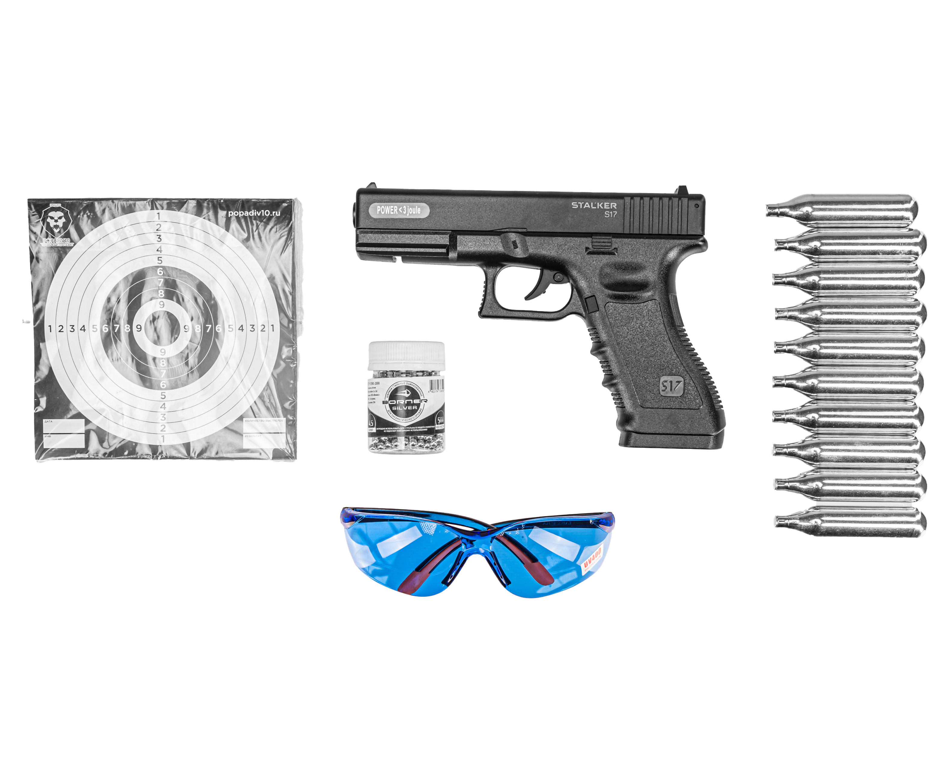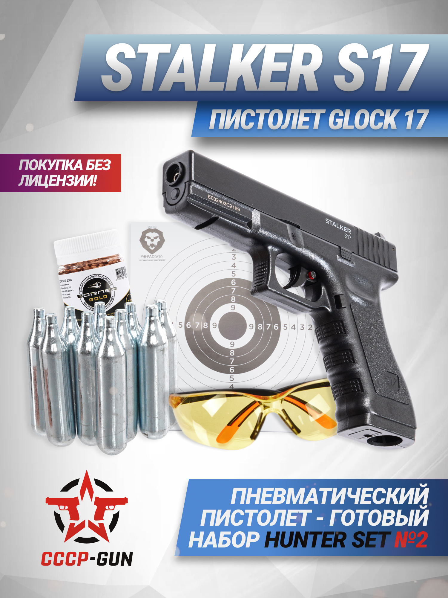 Обозреваемый вариант комплектации Hunter Set 2 включает пневматику S17, выполненную по прототипу Glock. Изделие австрийского происхождения давно заслужило мировую известность и сейчас относится к числу наиболее узнаваемых пистолетов в глобальном масштабе. Его многочисленные версии эксплуатируются полицейскими структурами, вооруженными силами, а также гражданскими в Соединенных Штатах Америки.