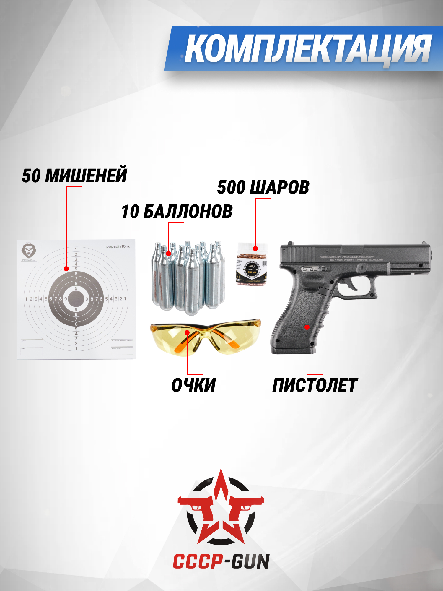 | Комплект поставки | Пистолет, магазин, шарики - 500 шт, баллончики - 10 шт, очки, мишени - 50 шт, упаковка, краткая документация, копия сертификата (по запросу покупателя) |