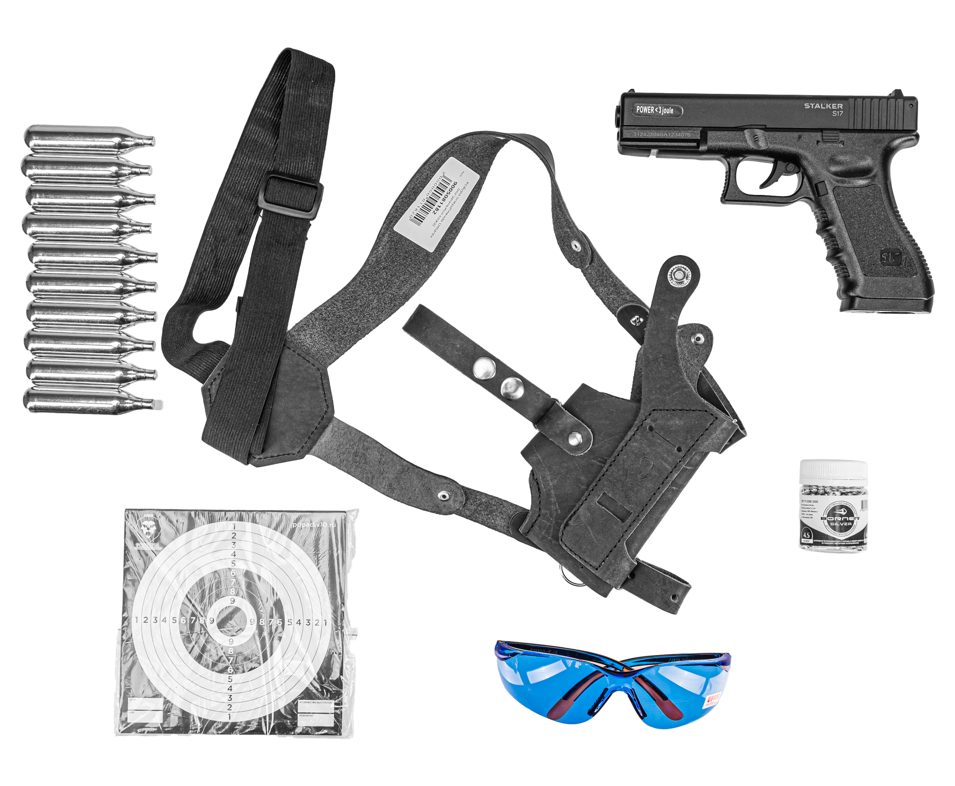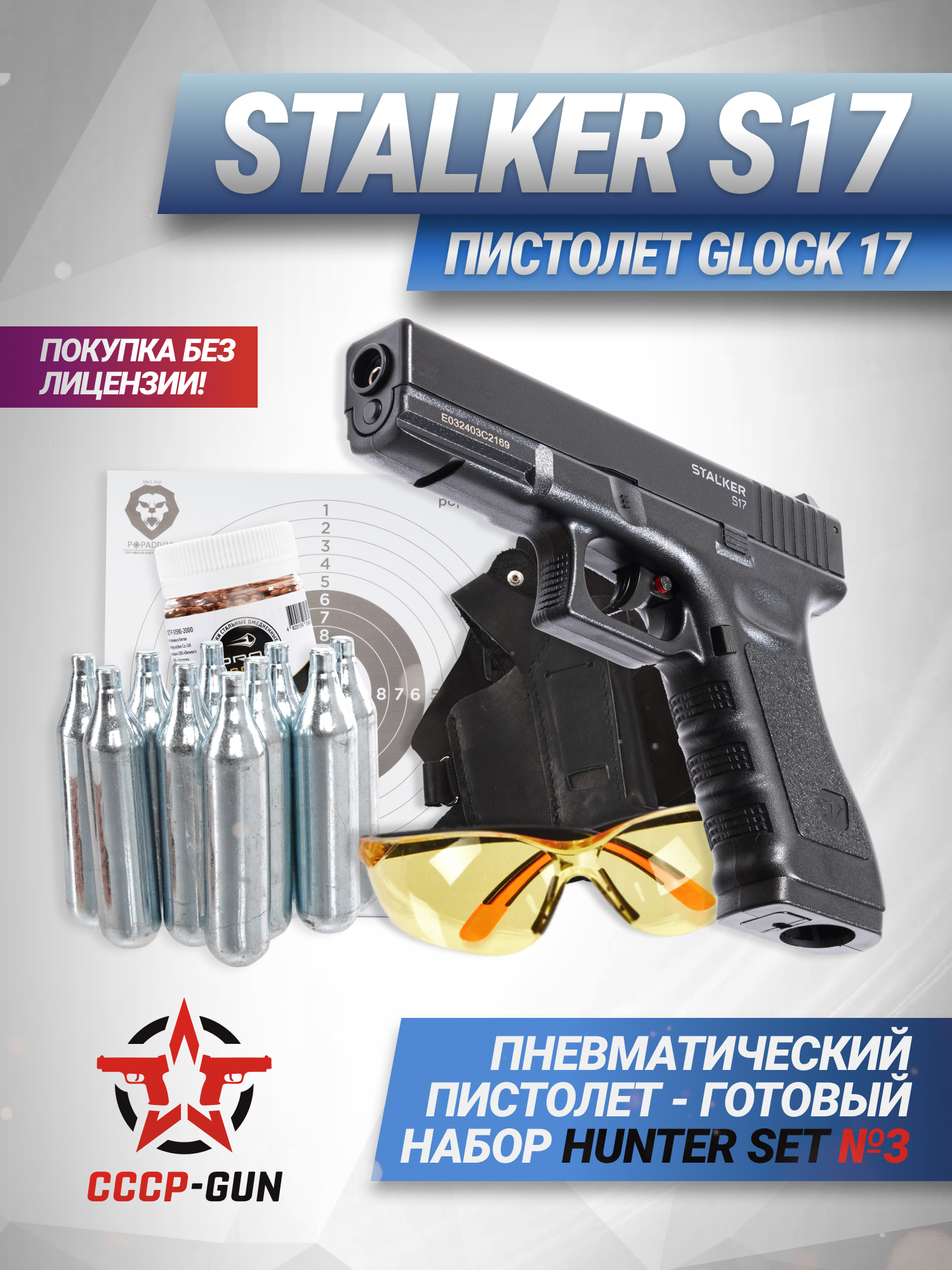 Рассматриваемый пневматический пистолет С17 на основе 17-го Глока из набора Хантер Сет спроектировали для применения одноразовых баллонов, заполненных углекислым газом, и ориентирован на ведение стрельбы стальными сферическими снарядами BB калибром 4.5 мм. Примечательной особенностью комплекта выступает включение всех необходимых сопутствующих элементов для полноценной эксплуатации оружия. Набор содержит шары, 12-граммовые резервуары и мишени, что дает возможность сразу после распаковки тренироваться.