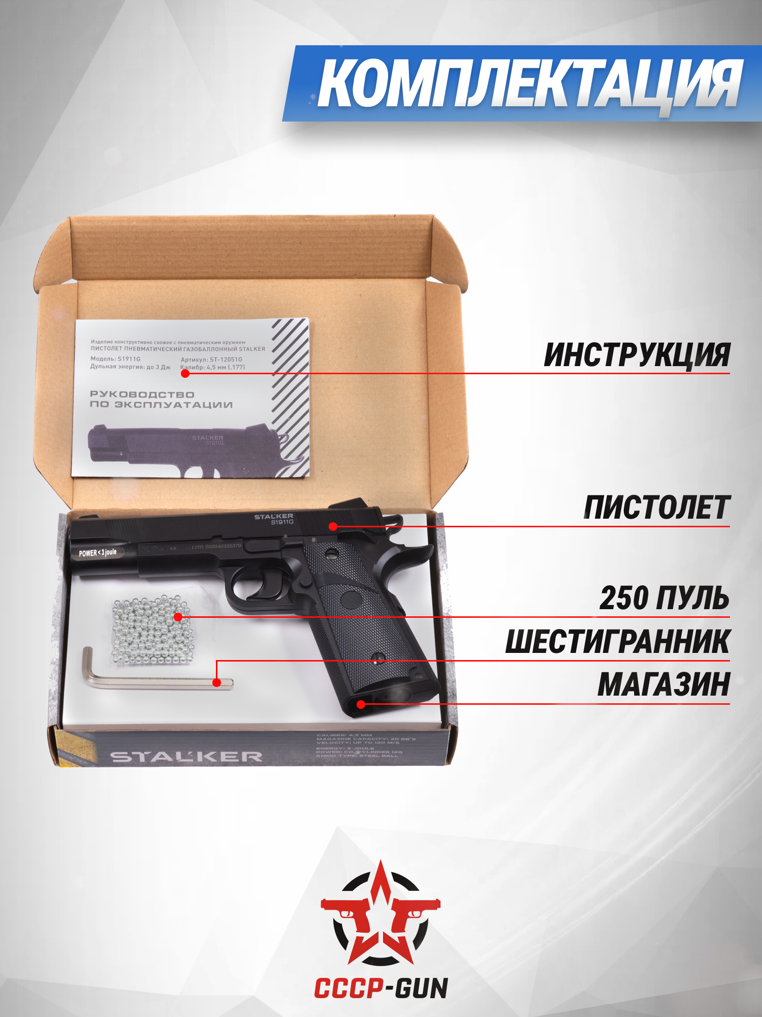 Обозреваемый пистолет Stalker S1911G ST-12051G представляет собой пневматическую версию огнестрельной модели Colt M1911. Габариты пневматики равны 220 миллиметрам, а вес не превышает 470 грамм. Легкость изделия достигнута за счет применения ударопрочного полимера в качестве материалов рамы и затвора. Таким образом пистолет легко держится в руках и может применяться для тренировки детей обращению с оружием.