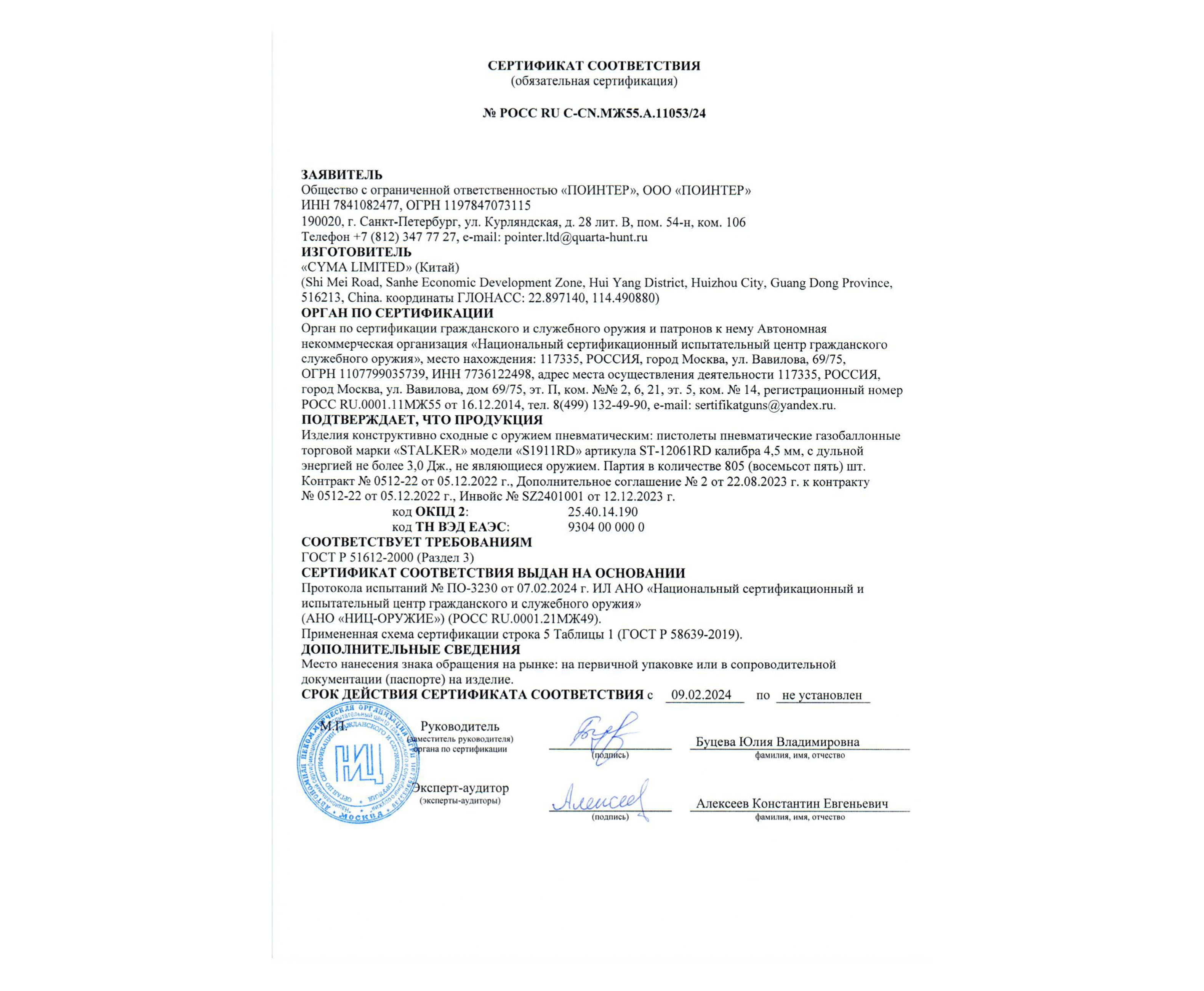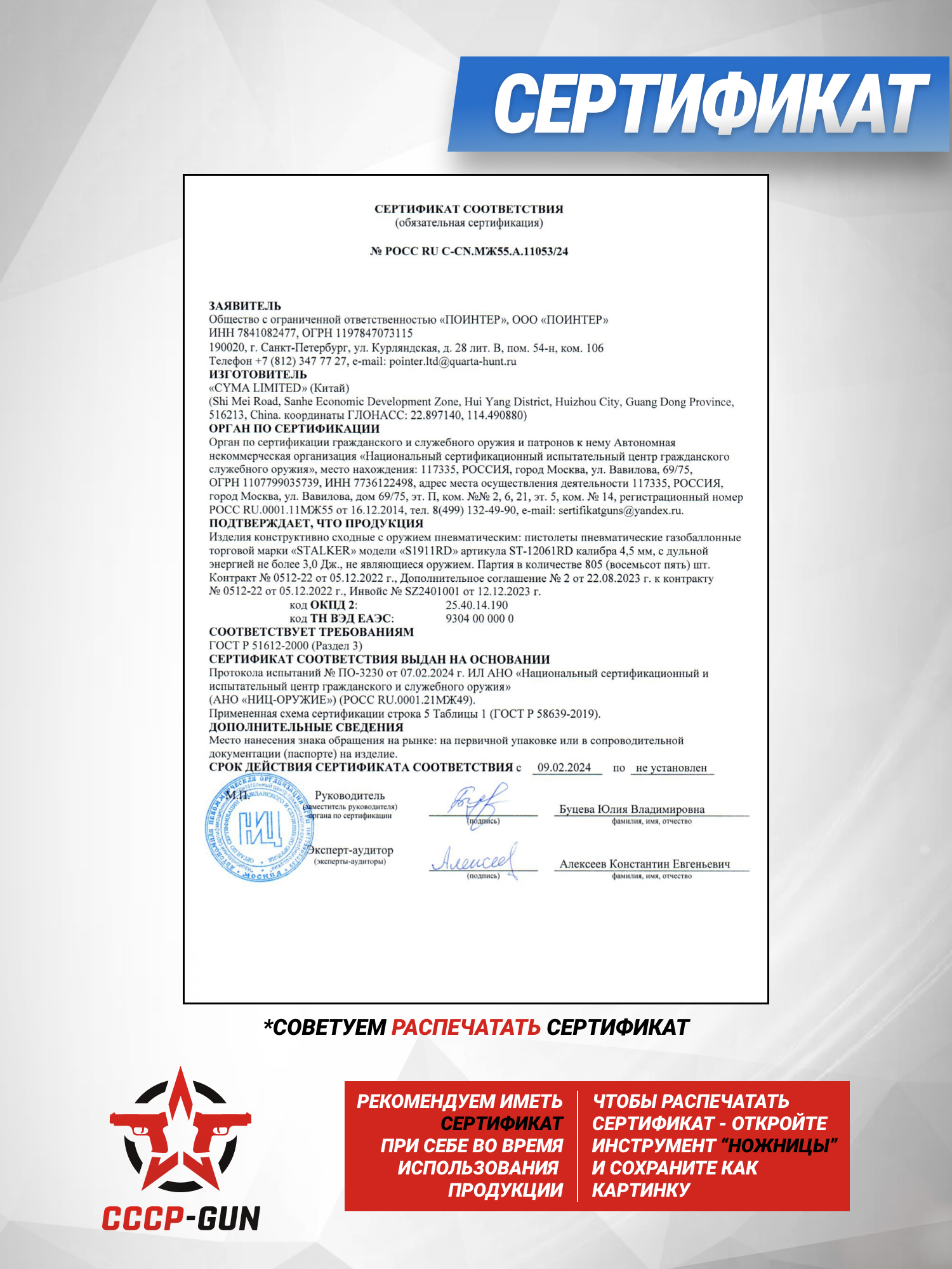 Помимо всего указанного, в комплект также входит упаковка из 50 бумажных мишеней, защитные стрелковые очки и удобная кобура, облегчающая переноску изделия Сталкер. Благодаря этому набору, можно незамедлительно приступать к занятиям.