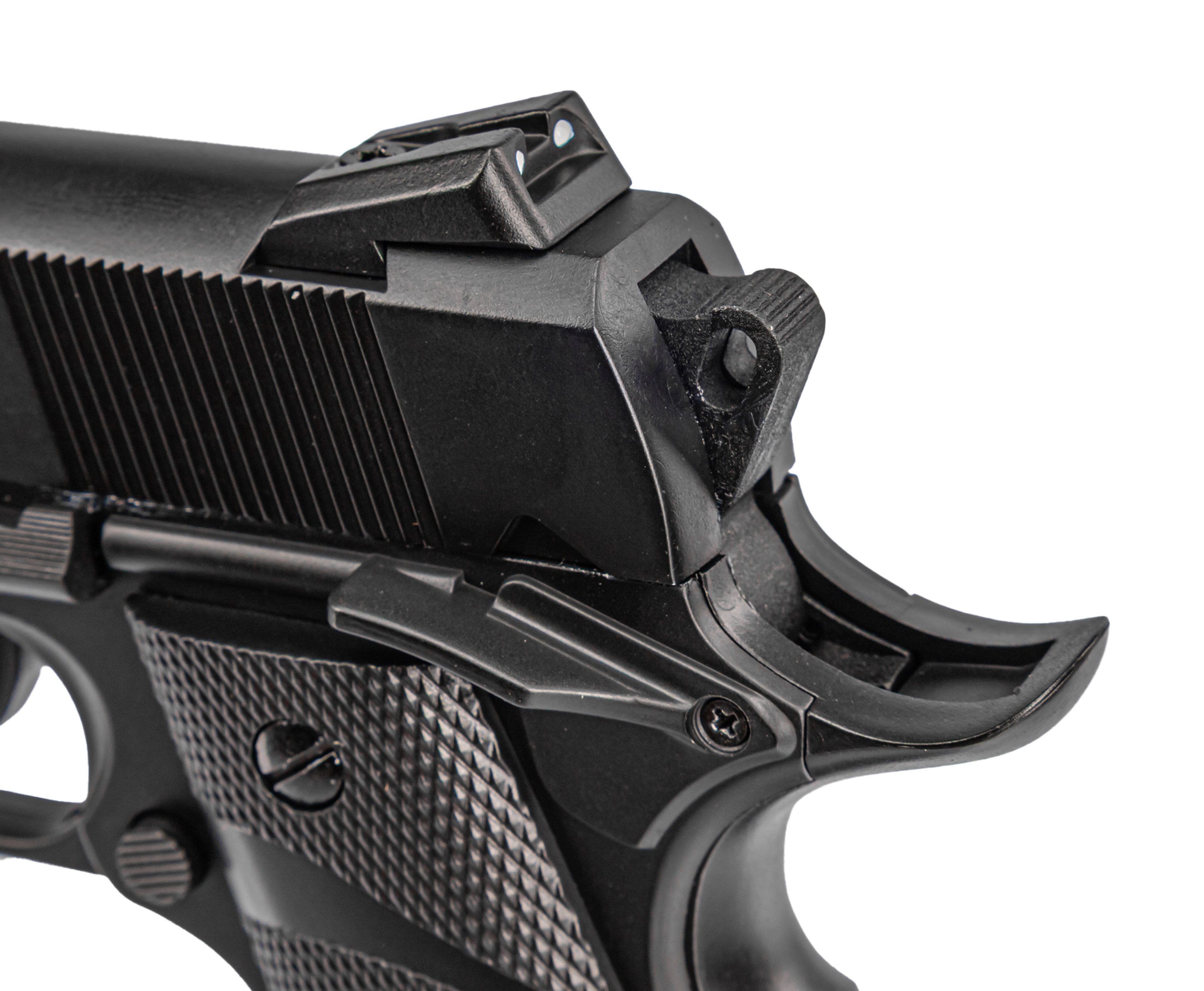 В качестве прототипа для этой модели выбран легендарный американский Colt M1911, применяющийся до сих пор. Его классическая компоновка с характерными очертаниями рамки и накладками на рукояти была точно воспроизведена. Это делает пистолет интересным решением для любителей оружейной истории.