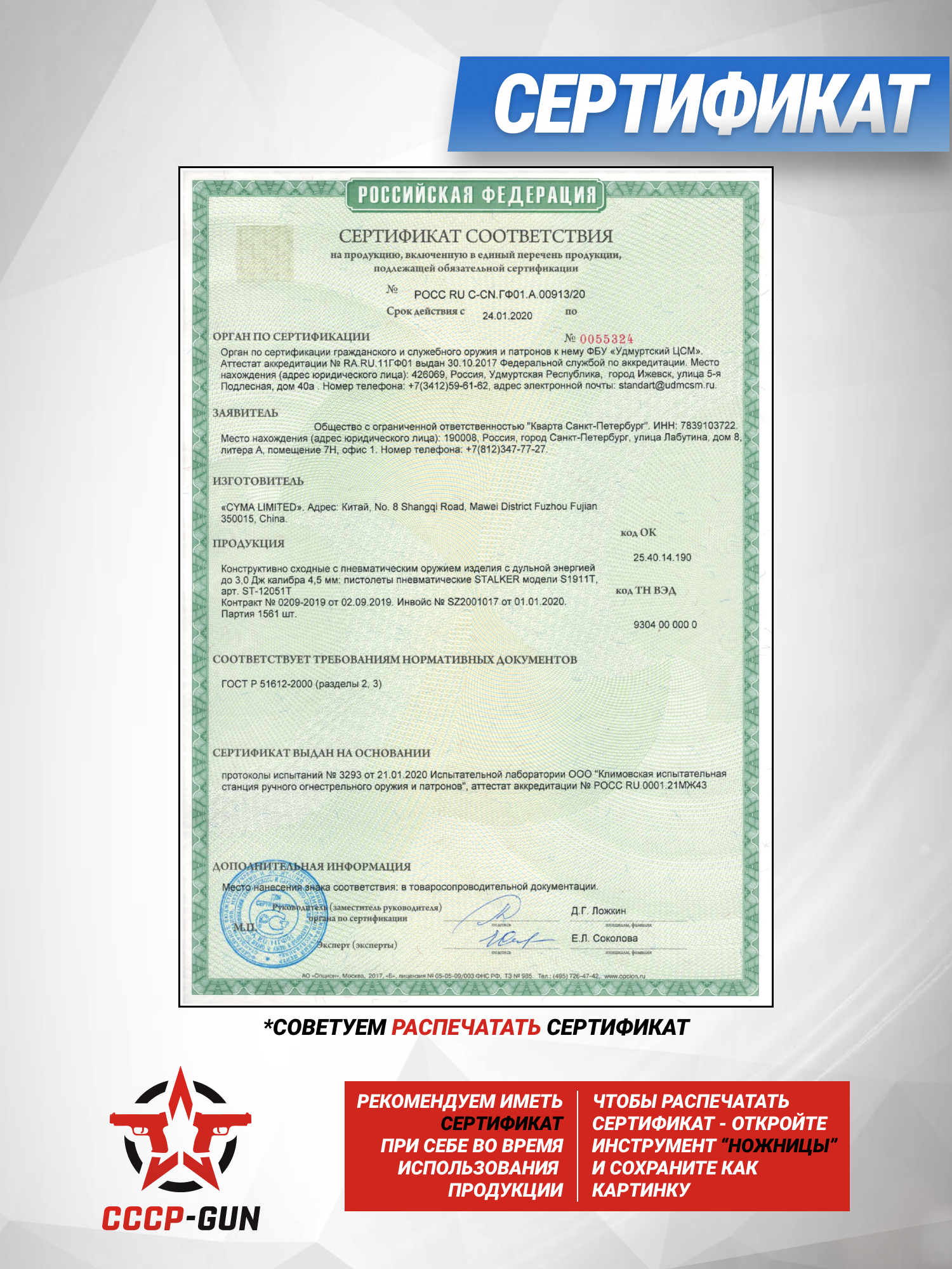 На территории России для приобретения Stalker S1911T от пользователя понадобится только паспорт, поскольку оформление лицензии не требуется. Это возможно благодаря тому, что на тестах пистолет выдает показатель дульной энергии до 3 J. Несмотря на такие характеристики скорость вылета BB снаряда составляет 120 метров в секунду, чего будет достаточно для плинкинга и тренировки меткости при стрельбе по мишеням.