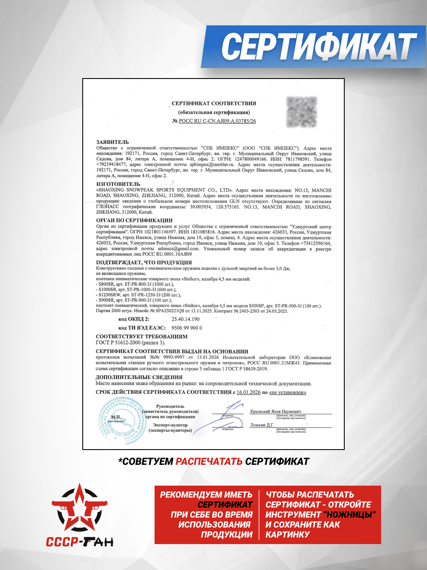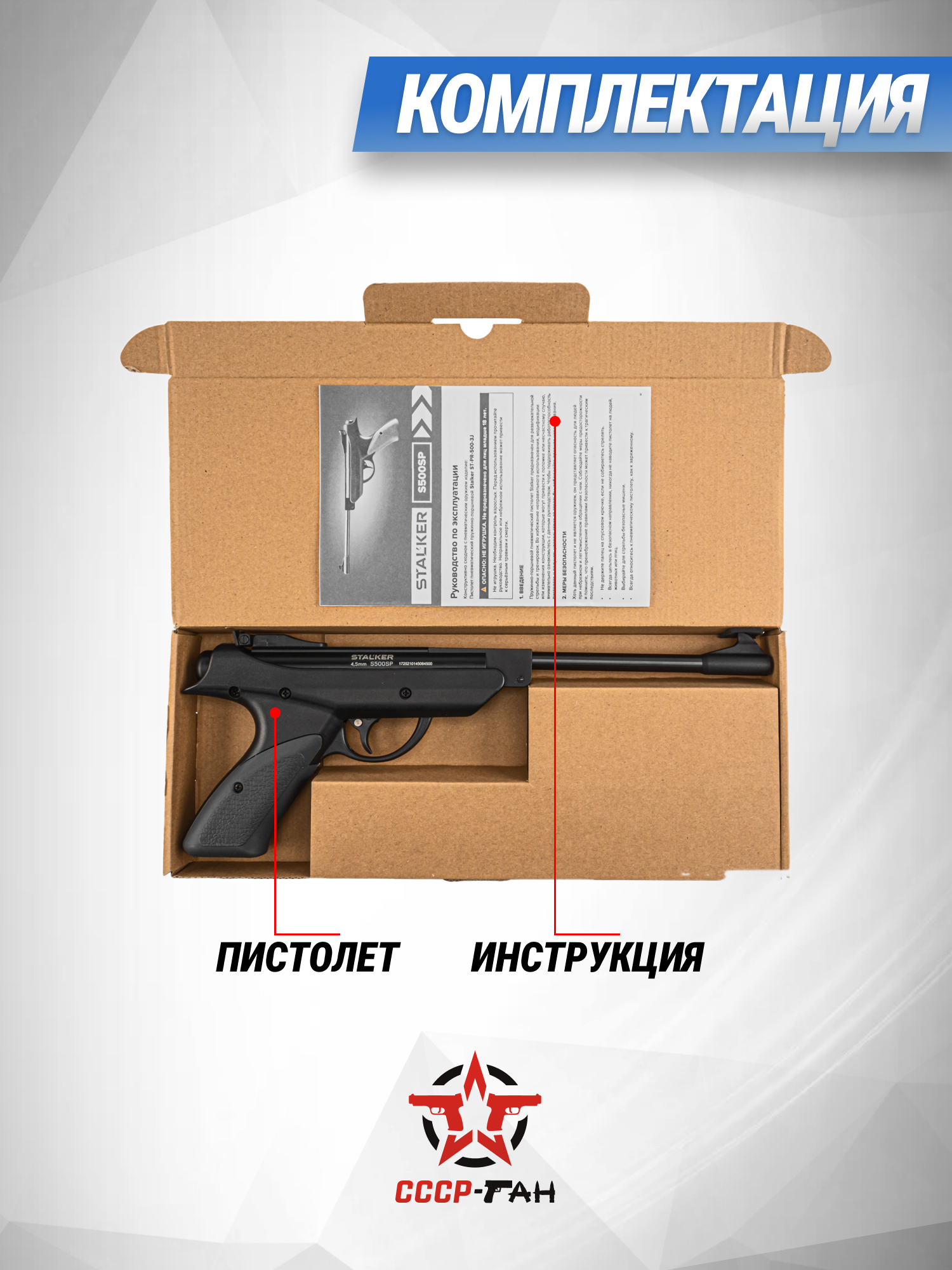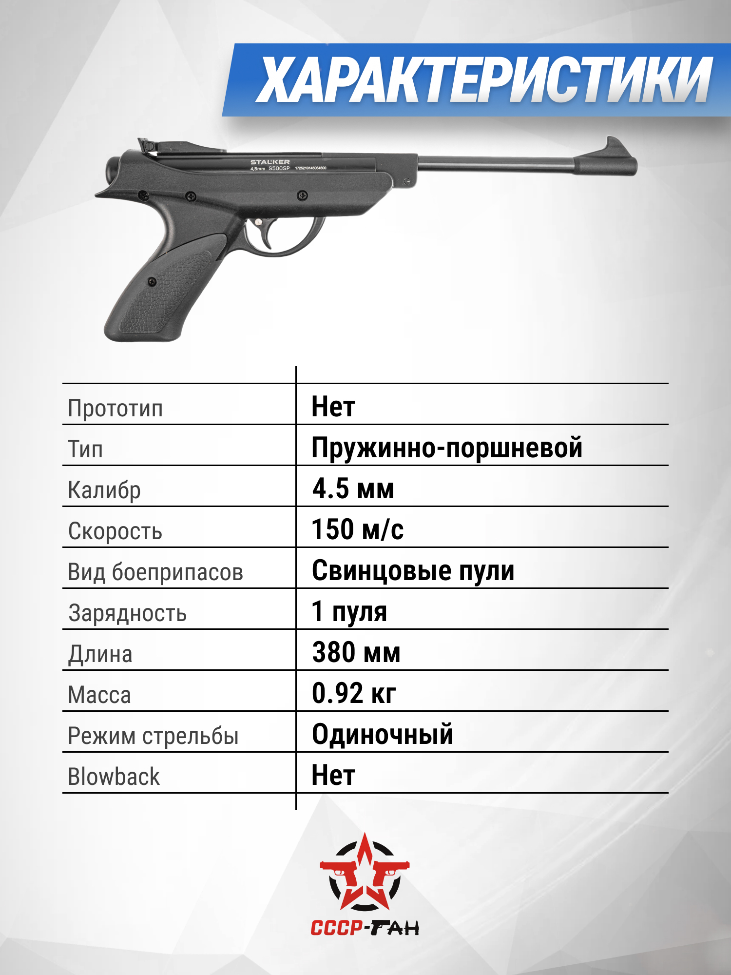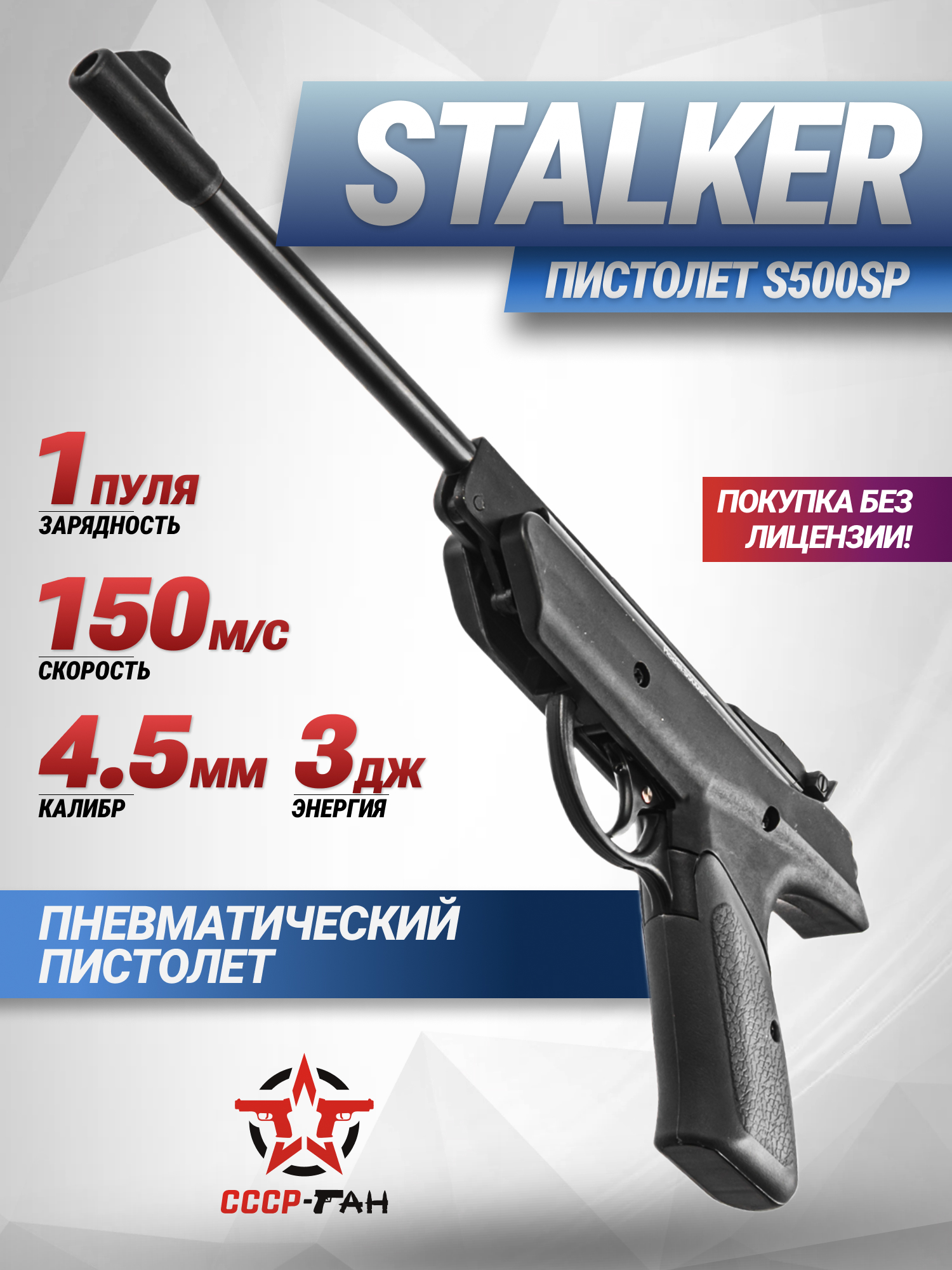 Воздействие на триггер высвобождает пружину, которая стремительно толкает поршень, формируя поток сжатой воздушной среды. Направленный воздух попадает в канал бланка и разгоняет свинцовый снаряд до 150 метров за секунду. Ввиду того, что дульная энергия модели Stalker S500SP строго ограничена законодательным пределом 3 Дж, пневматический пистолет Сталкер можно приобрести без лицензии с 18 лет.
