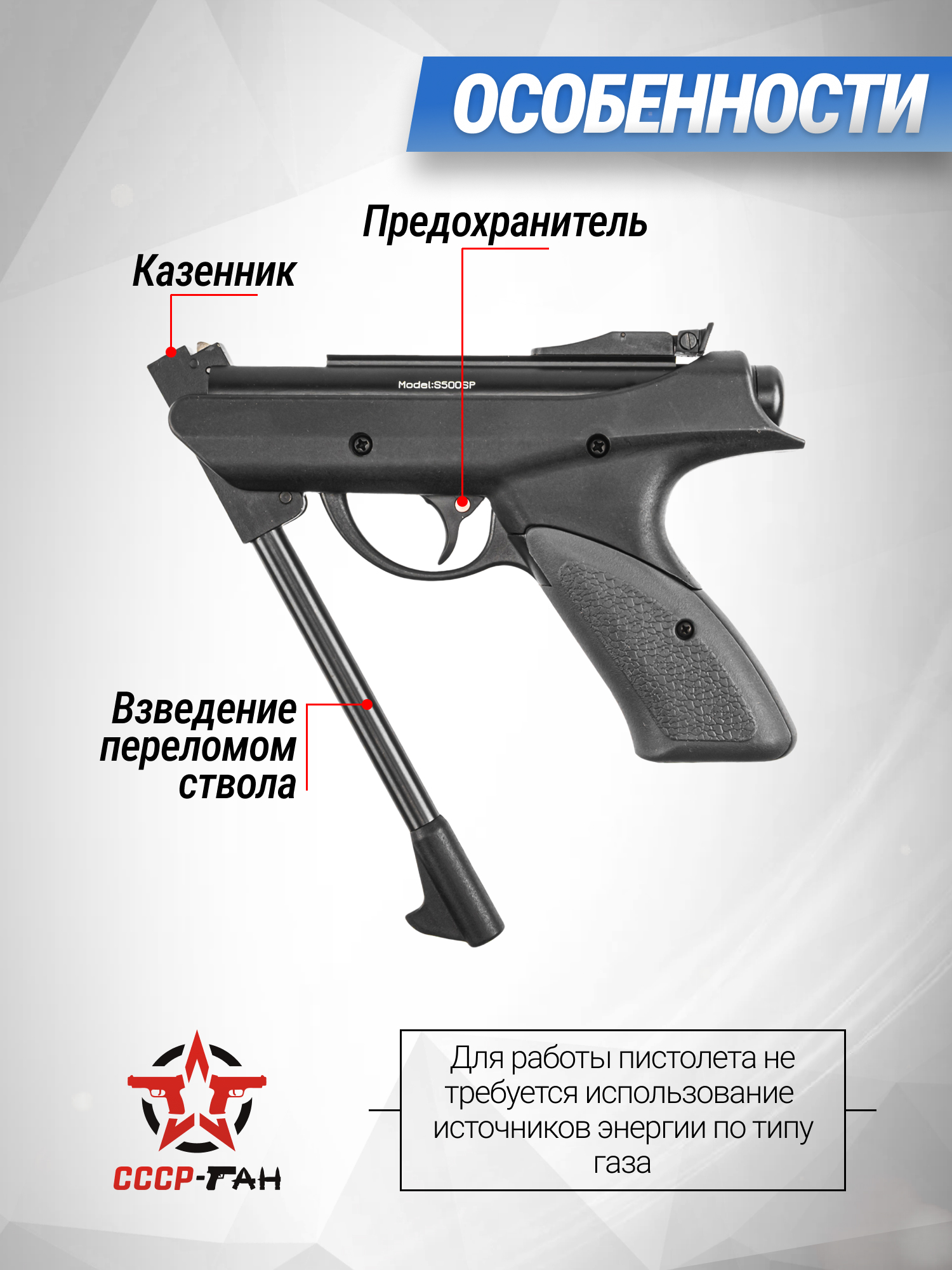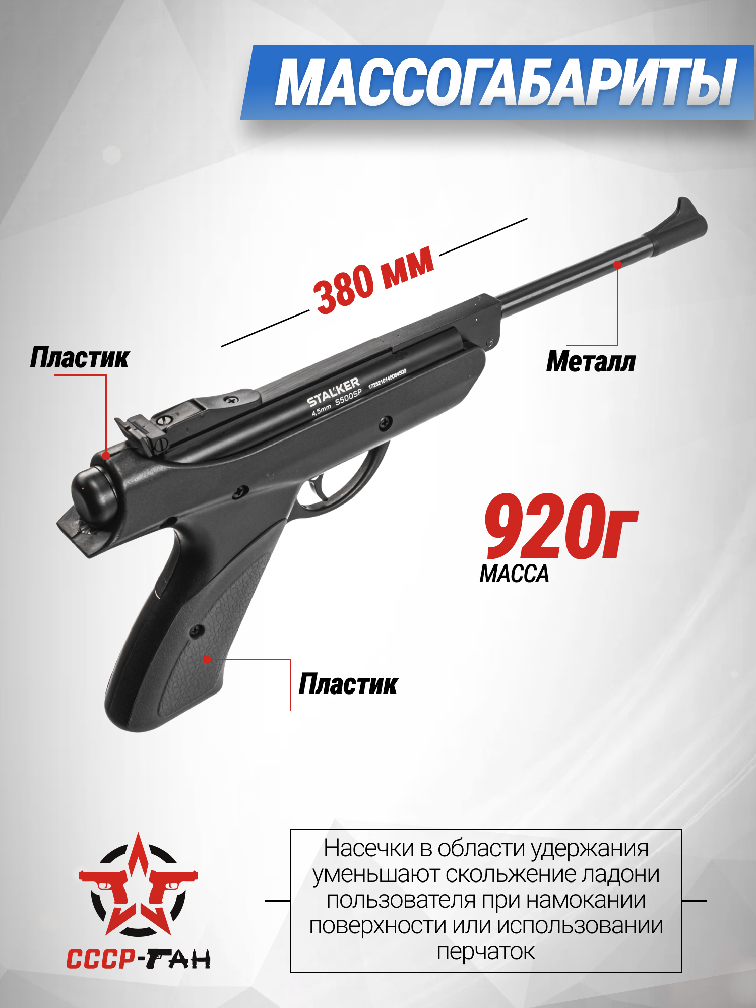 Свои экземпляры с подобной системой разработала популярная зарубежная фирма Stalker, длительное время поставляющая доступную пневматику на российский рынок. Каталог предприятия включает не только длинноствольные винтовки, но и компактные пистолеты. Представителем второй категории выступает обозреваемая модель S500SP, сконструированная под калибр 4.5 мм и предназначенная для метания воланчиковых пуль.